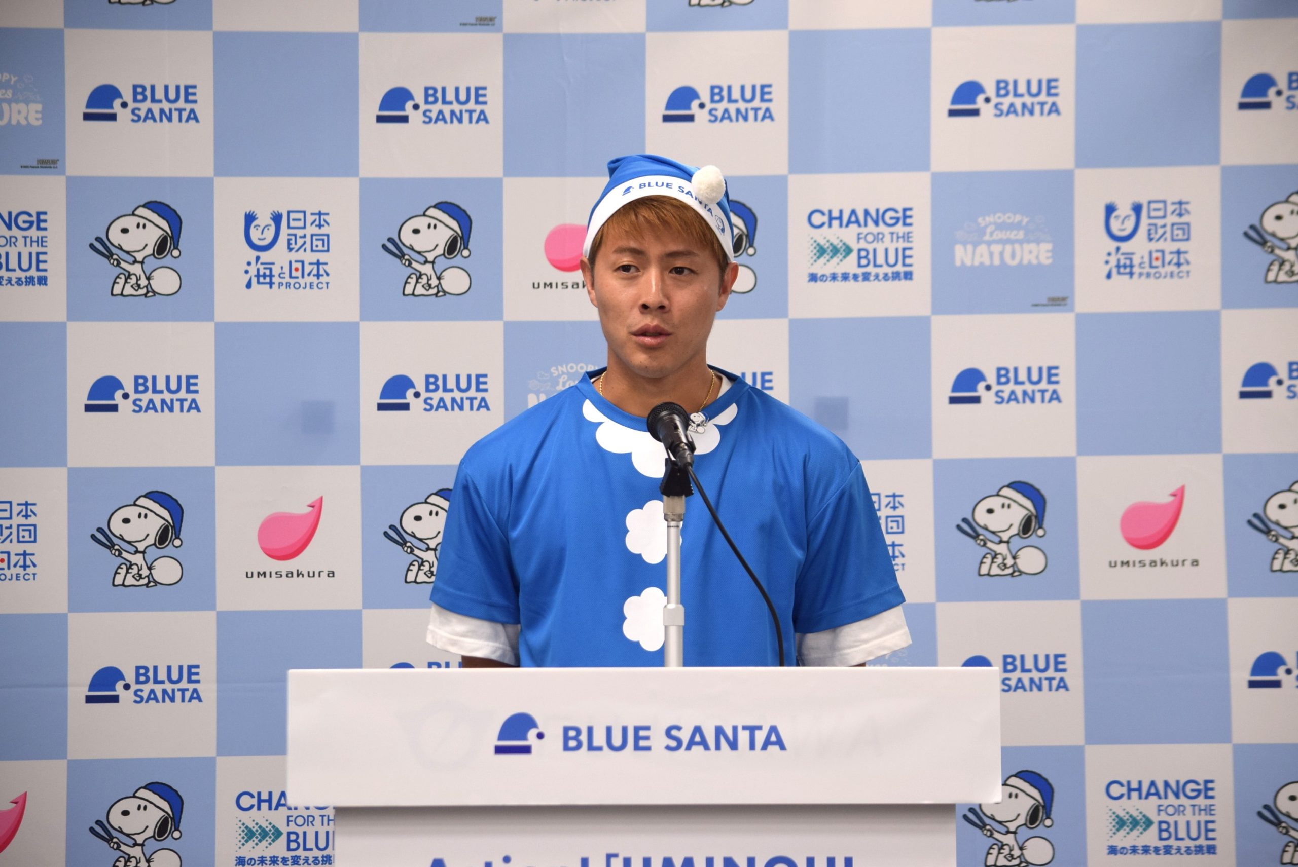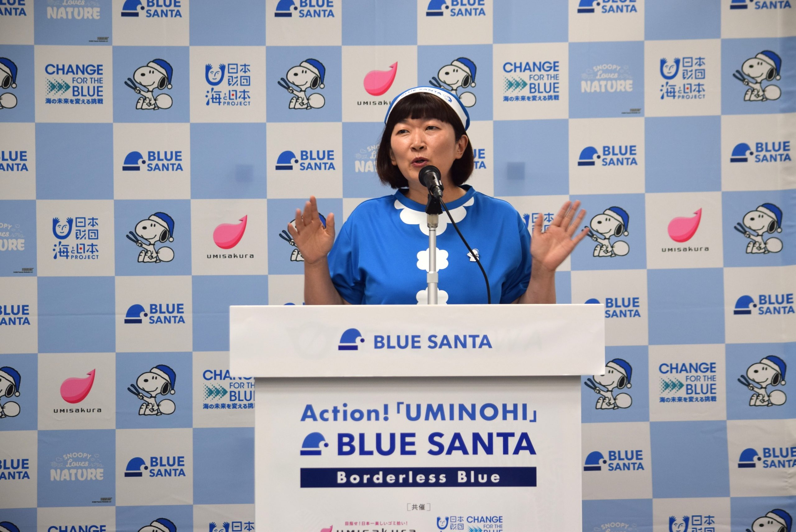 記者発表会の冒頭で、同法人の古澤代表理事から今回で10回目の開催となる「BLUE SANTA」のごみ拾い活動に向けて「21年前に私は1人でこの海を勝手にきれいにしようと始めたごみ拾い活動ですが、こうして多くの仲間たちと一緒に、本気で海をきれいにできるということを心から嬉しく思っています。本当に海はピンチだと私は思っていて、毎日毎日ごみが海にやってきます。これは当たり前の事ではなくて、ここにいる皆さんとこれから力を合わせて、生きている間に絶対に私たちの力で海をきれいにしたいと思っています」と、同法人で始めた20年に渡るごみ拾い活動の大切さを熱い言葉で伝えた。