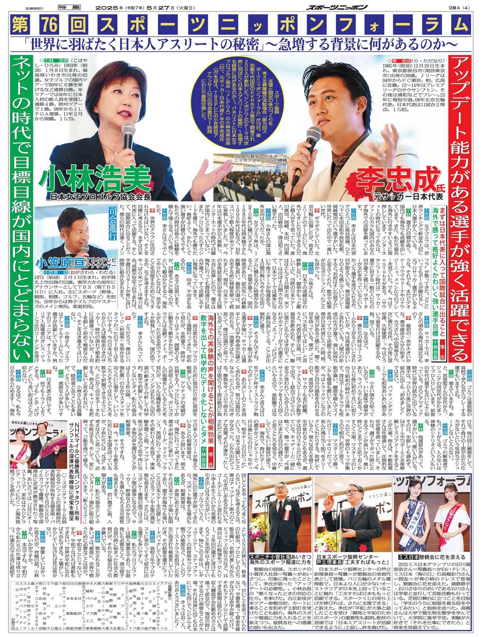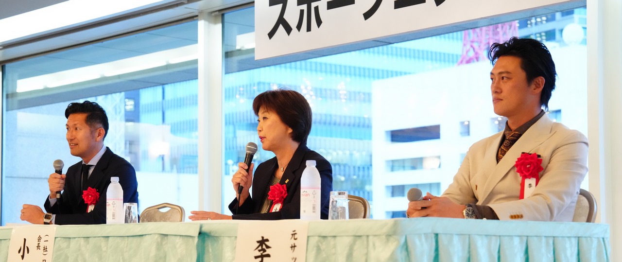 シンポジウムのテーマは「世界に羽ばたく日本人アスリートの秘密」~急増する背景に何があるのか~。パネリストに日本女子プロゴルフ協会(JLPGA)の小林浩美会長(62)、元サッカー日本代表FWの李忠成氏(39)を迎えTBSテレビの小笠原亘アナウンサー(52)の司会進行で1時間にわたり意見交換した。