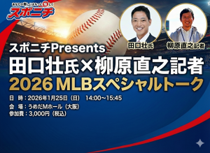 ワールドシリーズ連覇、4度目のリーグMVP獲得で2025年を終えたドジャース・大谷翔平選手。26年はシーズン開幕から二刀流で臨む上、シーズン前のWBC出場も表明しており、ますます注目されます。大谷選手を追いかけて13年目、「ひるおび」「ゴゴスマ」(いずれもTBS系列)にも出演するスポニチ・柳原直之記者が、取材渡米前に大阪でトークイベントを開きます。