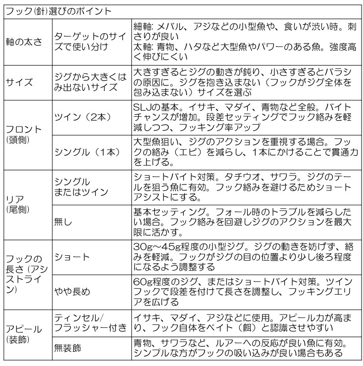 SLJでは様々な魚種が狙えるため、フックの選択は釣果に大きく影響する重要な要素です。