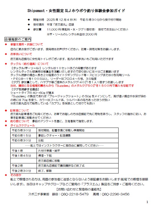 【イベント名】Shipsmast 女性限定 SLJホウボウ釣り体験会