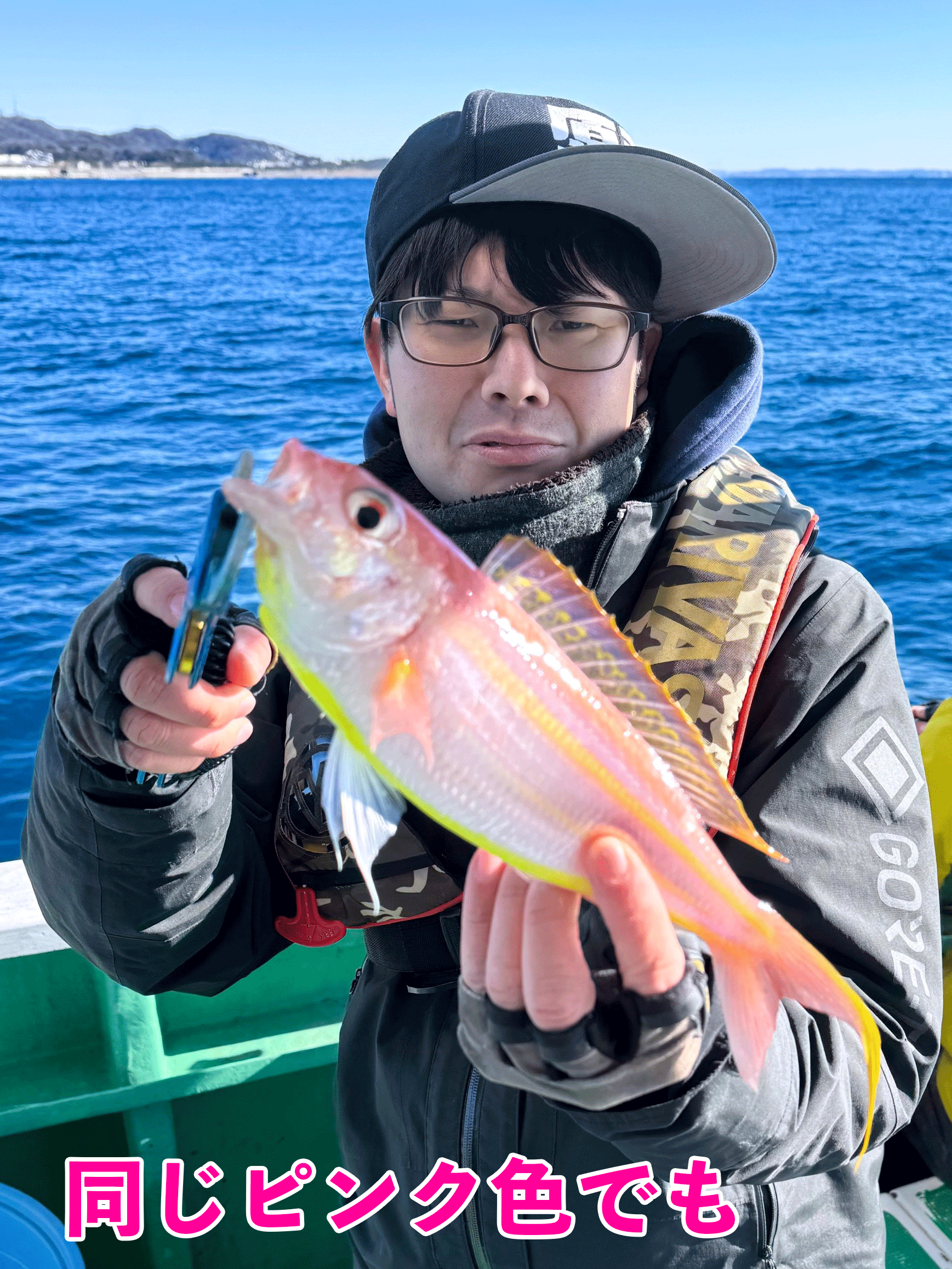 終盤になりようやくイトーにも胸を張れるサイズのヒットが。竿先がググンと入ったところで「来たー。石渡~、タモー」と呼び付けるフリをして、周りのライバルたちにアピール。声のデカさを利用して船上視聴率100%獲得に成功。あとは釣り上げるだけや。周りの目を引き付けてプカ~と上がってきたピンクの奇麗な魚体…アマダイではなく、イトヨリでした。