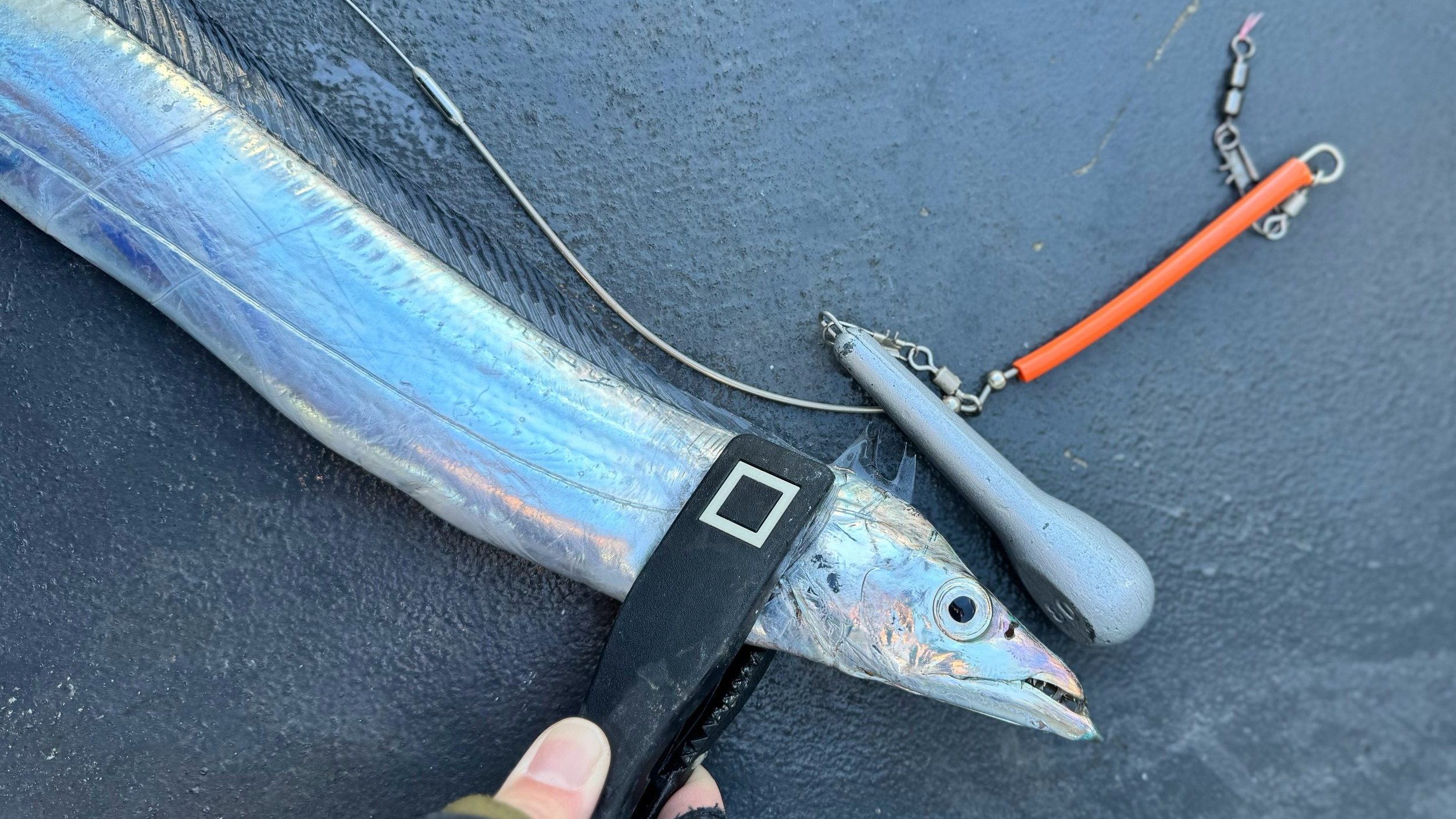 ここから椙尾塾に入門して釣り再開。指示ダナより20メートル上まで攻めると、デカい当たりが来た。「ほんまですね。椙尾さんの言った通りデカいの掛かりましたわ」と引き抜いたタチウオを見てビックリ。F3と細い魚体に付いてきたのは、オモリ付きの片天仕掛け。恥ずかしさで赤くなった顔を見られないよう、隠しながら「これで重かったんかい」と突っ込んだ。