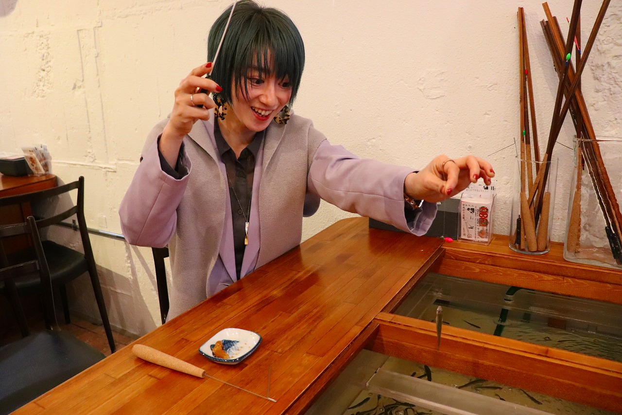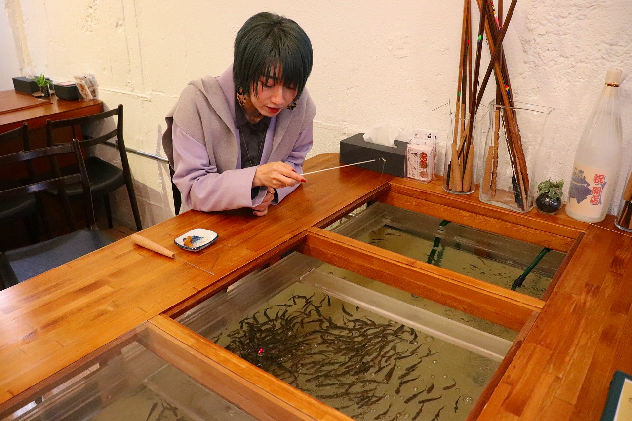 店1階の6人掛けテーブル中央には生け簀(す)が取り付けられ、最大12㌢ほどのホンモロコ約200匹が泳ぎ回っている。長さ35㌢の特製竿を使用し、干し芋の粒を餌にして釣り上げる。「ウキが消し込んだら軽くアワセます。初めてでも釣果ゼロで終わる人はいません」と桜井氏。近隣で勤める会社員や家族連れが主な客層だ。