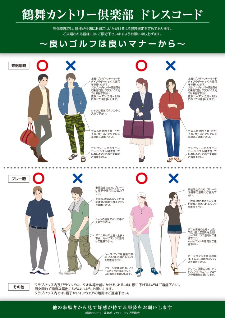 ・プレー中に限り、コース内でのシャツ(腰丈サイズ)の裾出し可となります。クラブハウス内での裾出しは禁止です。