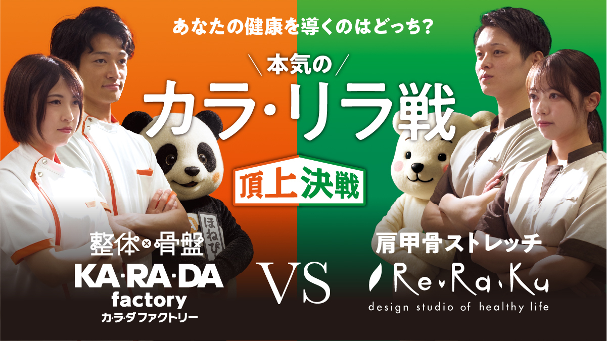 リラクゼーションスタジオ「Re.Ra.Ku.」を中心に全国で300店舗以上を展開するメディロム・ウェルネス(本社:東京都港区、代表取締役 江口 康二、以下 メディロム)は、整体×骨盤サロン「カ・ラ・ダ ファクトリー」(以下 カラダファクトリー)を展開するファクトリージャパングループ(本社:東京都千代田区、代表取締役社長:髙橋 健介、以下 ファクトリージャパン)と、対決型コラボレーション企画「本気のカラ・リラ戦」を10月1日から11月30日まで開催している。