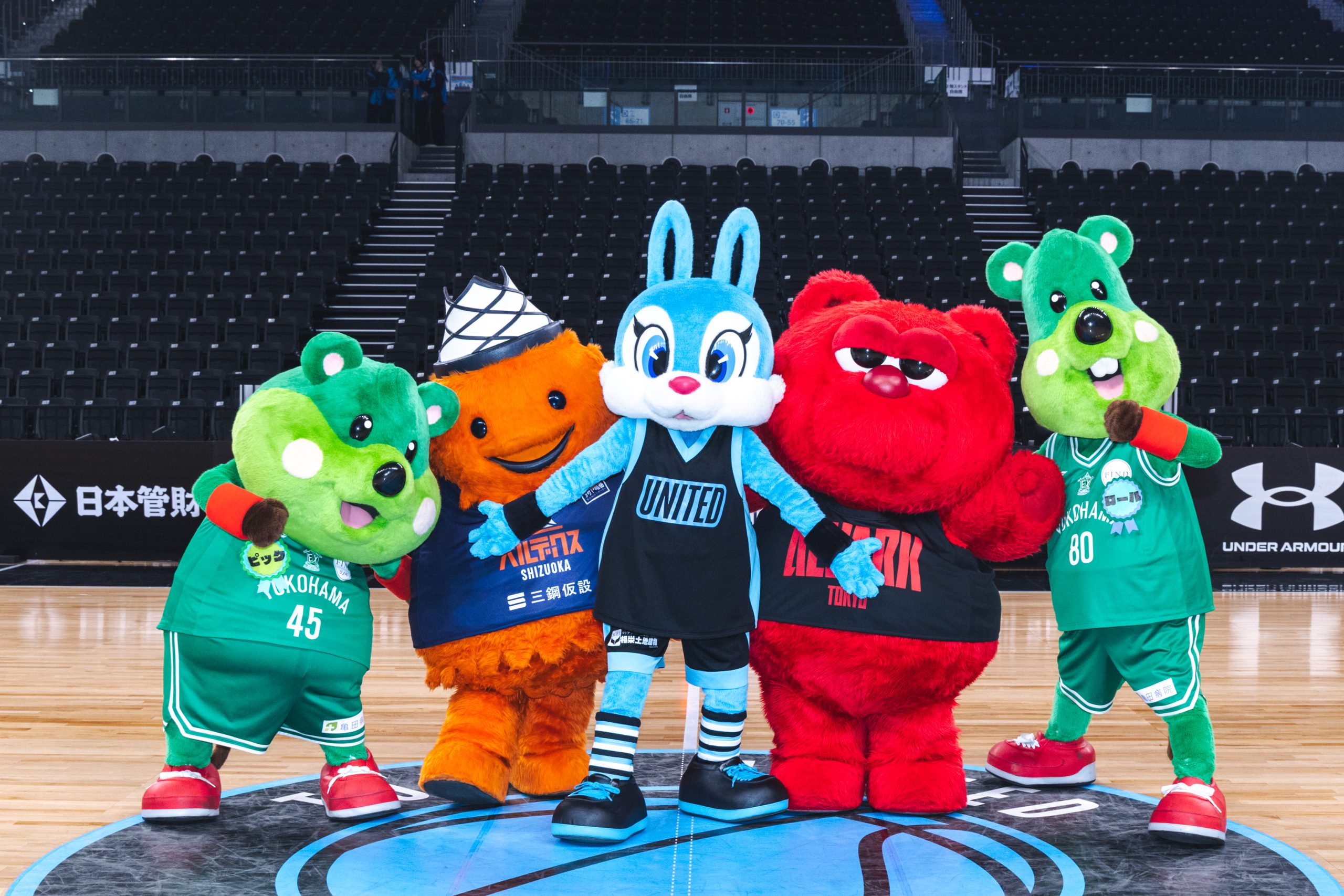 湘南とのGAME2は、東京Uのマスコット「ユナイト」の誕生日をお祝いするためにB1、B2の人気マスコットが来場して会場を盛り上げた(写真左から横浜E・ピック、V静岡・ベルティ、東京U・ユナイト、A東京・ルーク、横浜E・ロール)