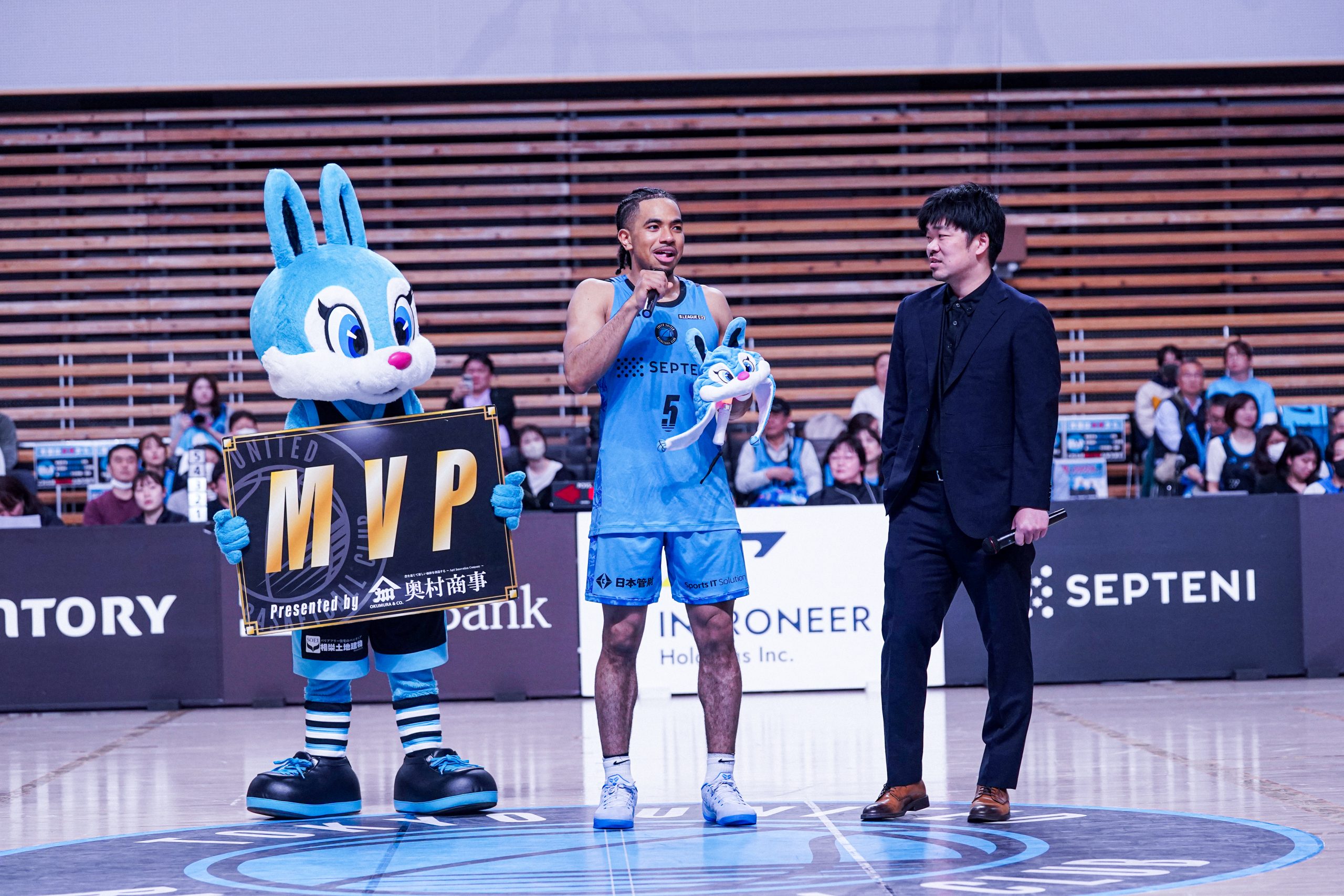MVP受賞の東京Uのケドリック・ストックマンJrは笑顔でプレーオフ進出に向けての意気込みを伝えた
