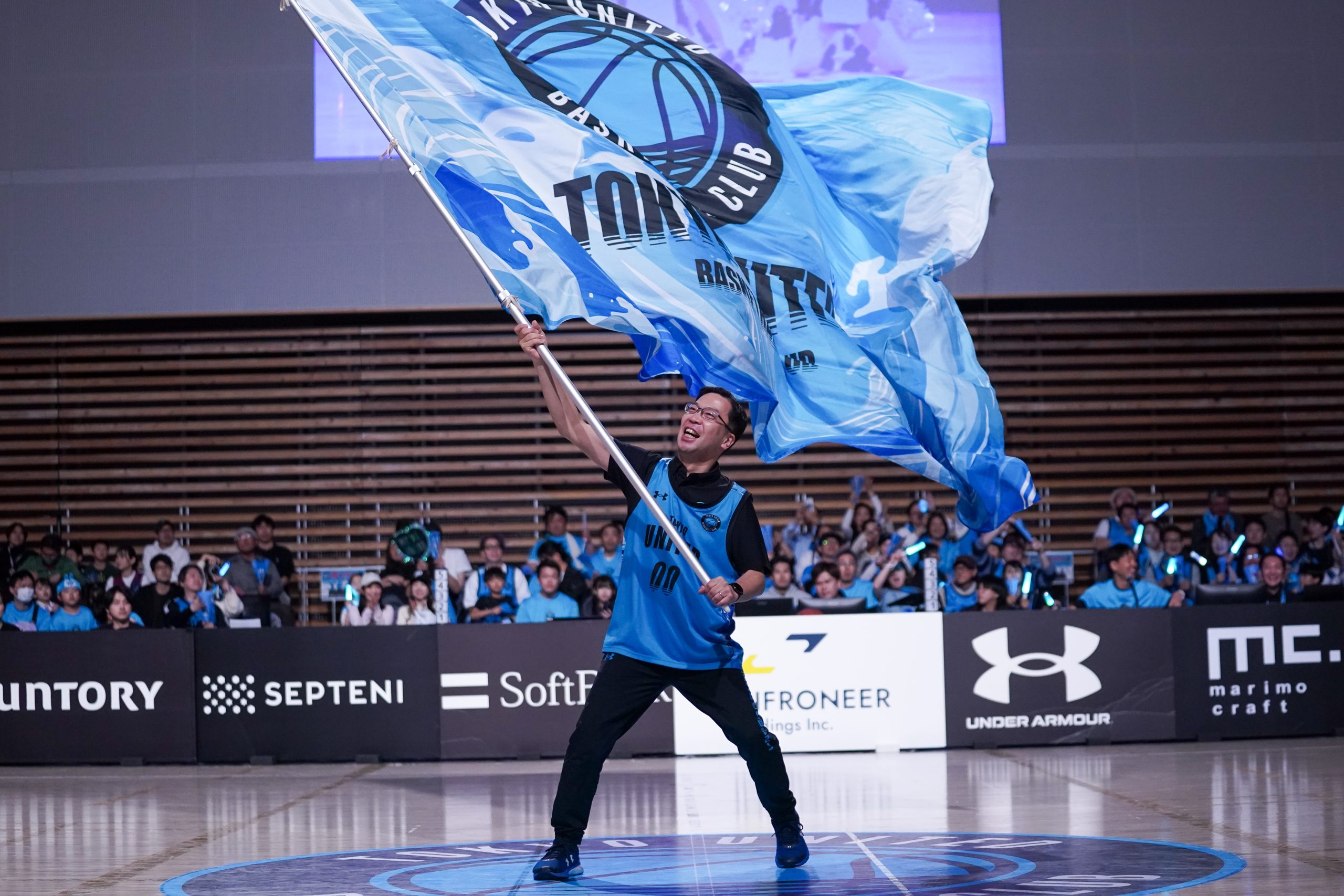 プレーオフGAME3の試合開始前、東京Uの代表取締役会長の家本賢太郎氏がチームのビッグフラッグを振り、チームを鼓舞した