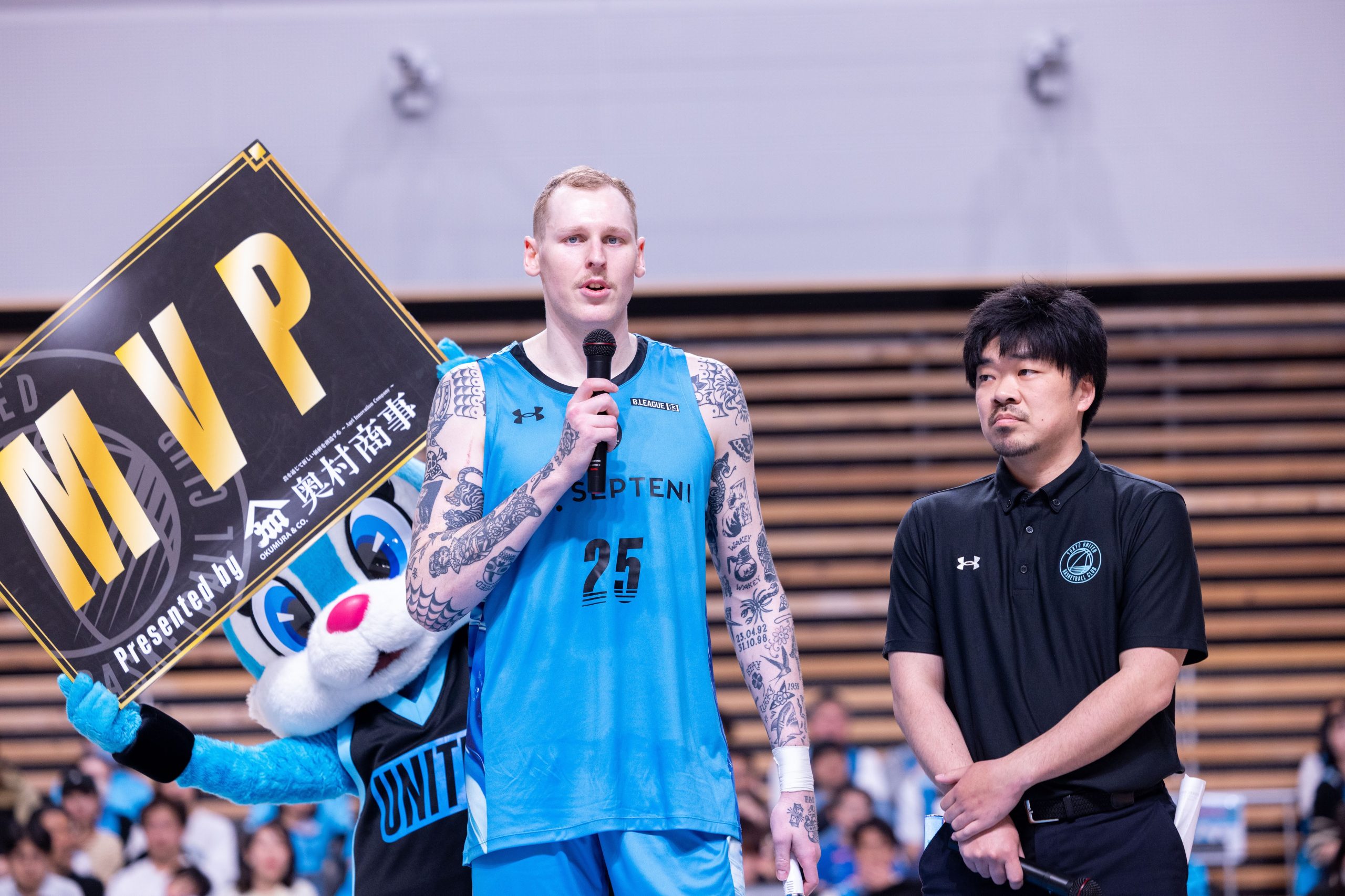 続いて、東京ZとのGAME2で、チーム最多となる17得点を挙げ、リバウンドも6の活躍で東京Uのリース・ヴァーグがMVPに選ばれた。「(今日は絶対に負けられない試合となりました。振り返っていかがだったでしょうか?)昨日は自分らしいバスケットボールができなかったが、今日は第1~3Qぐらいまで、自分たちのバスケットボールが出来ました。まずは、ファンのためにも一生懸命戦うことができたと思うので、非常に良かったと思います。(リース選手は、今季1度もケガすることなく、フル出場されているかなと思いますが)ファンの後押しが非常に明日重要になってくるので、必ず勝ちますので、会場に来て応援していただければと思います」と、ケガをせずに1シーズン活躍したリース・ヴァーグはあす行われるGAME3に向けて、意気込みとファンの声援をお願いするメッセージを送った。