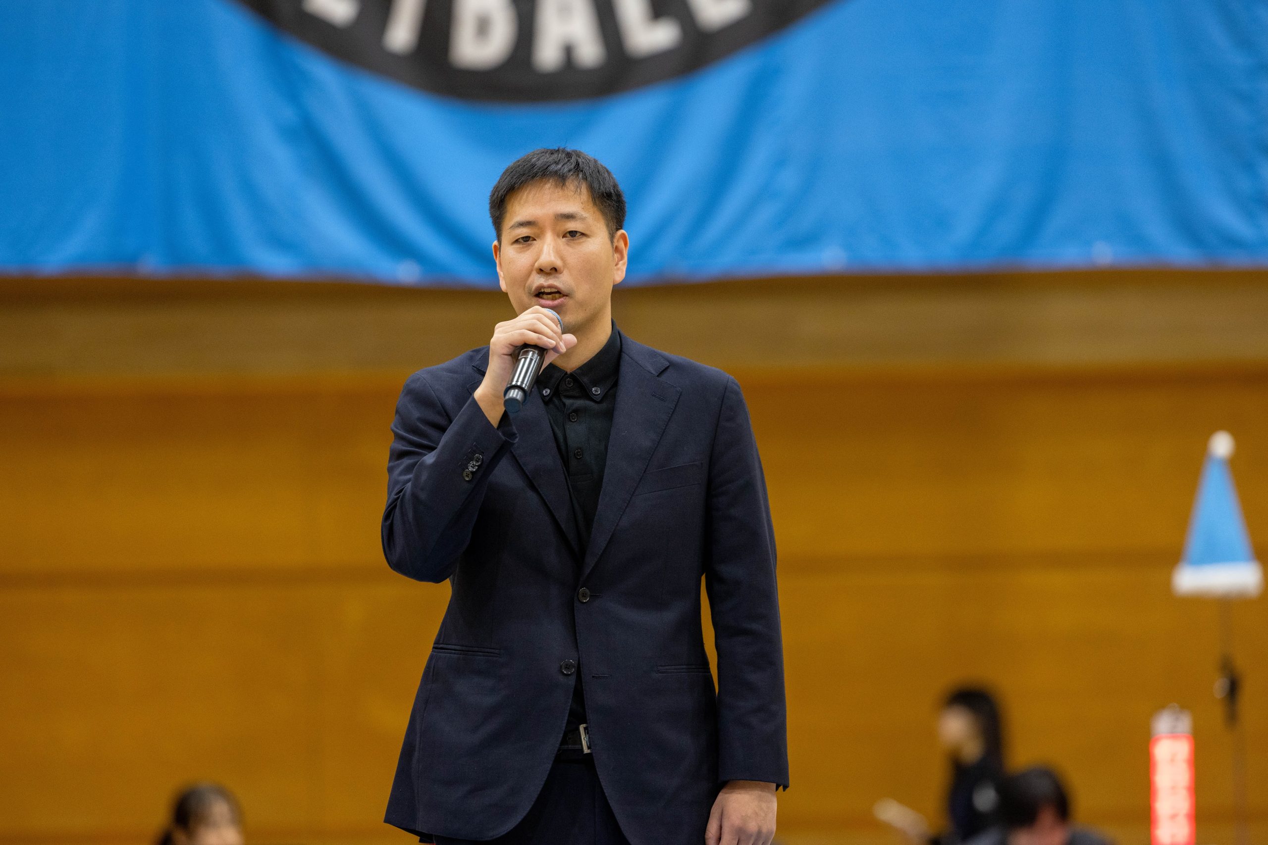 試合後、2節ぶりにコート上に復帰したMCの竹本タクシーが東京Uの橋爪純ヘッドコーチ(HD)にインタビューした。