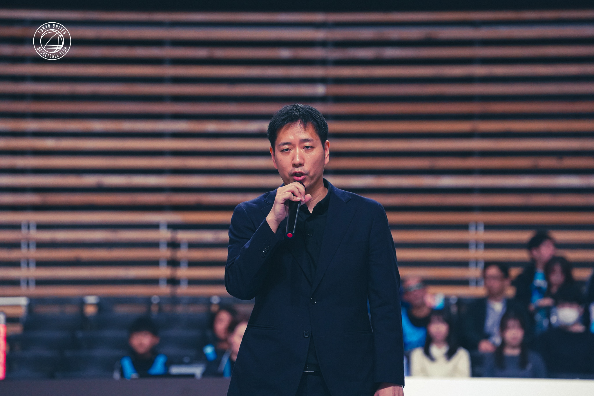 試合終了後、東京Uのブースター&ファンに来季(2026-27シーズン)の「B.リーグONE」参入決定を報告した家本賢太郎社長