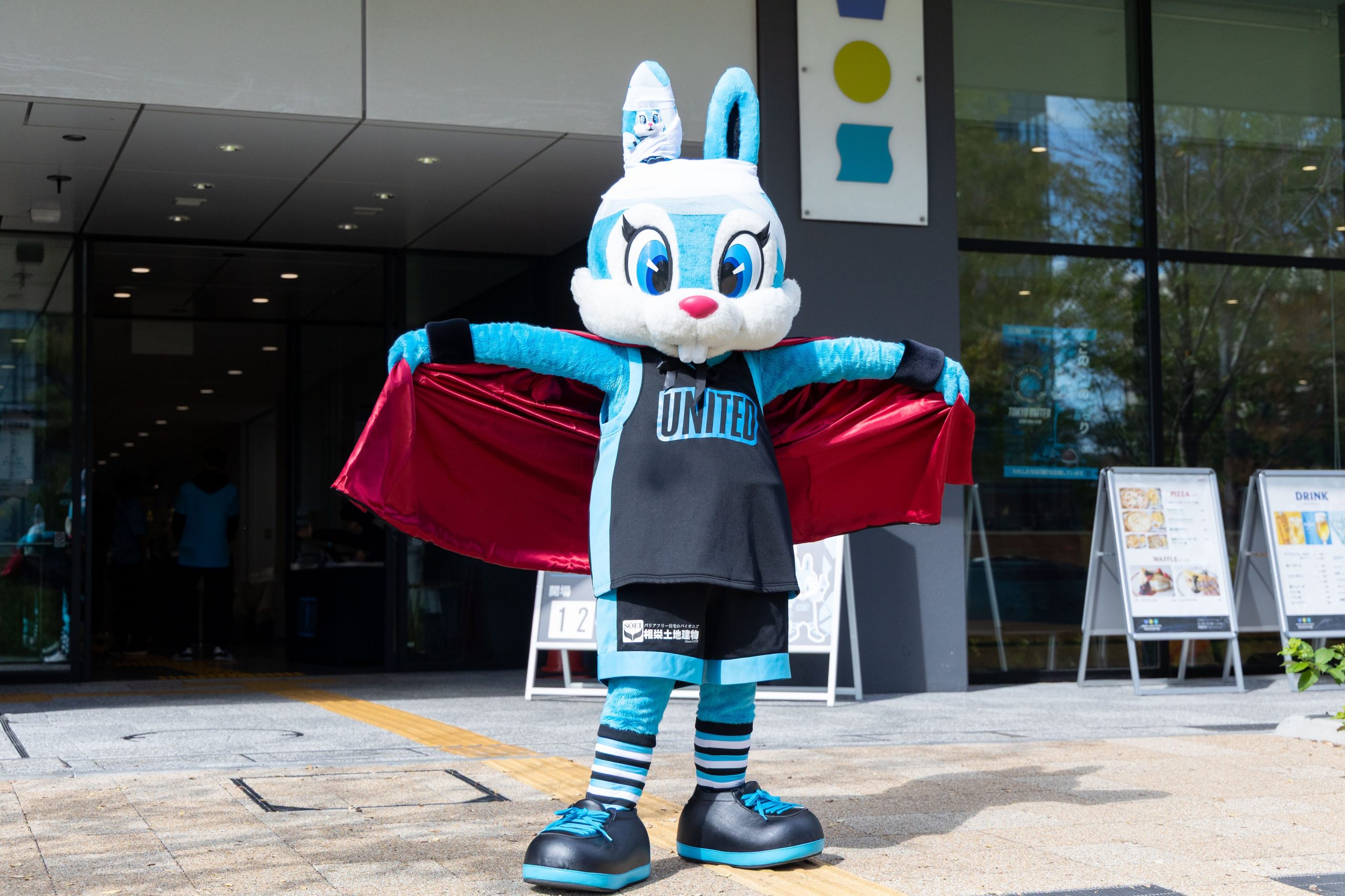 平日昼間の開催となった徳島とのGAME2で、東京Uのマスコット・ユナイトが江東区内の保育園児約200人をお出迎え