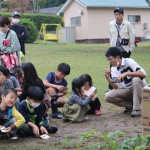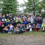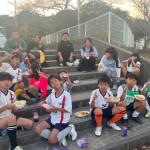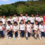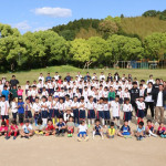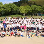加賀田SCのメンバーとコーチ陣、保護者のみなさん。豊かな自然の中の小学校グラウンドで、楽しくサッカーに励む