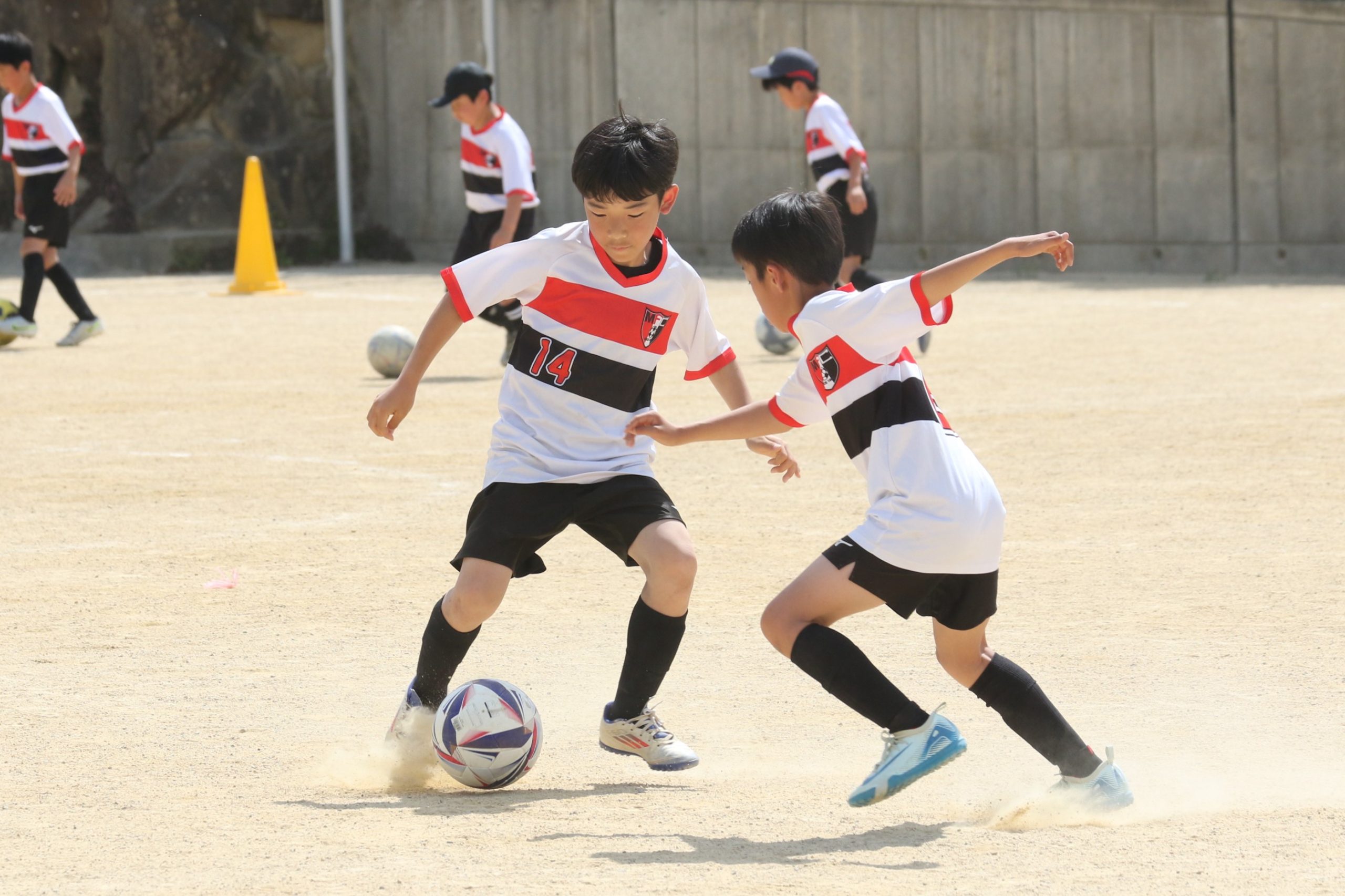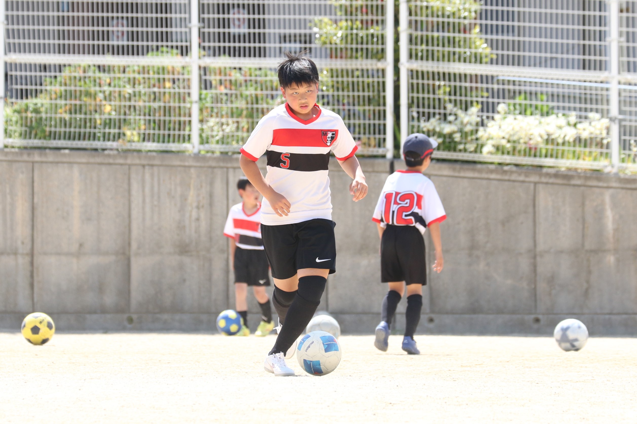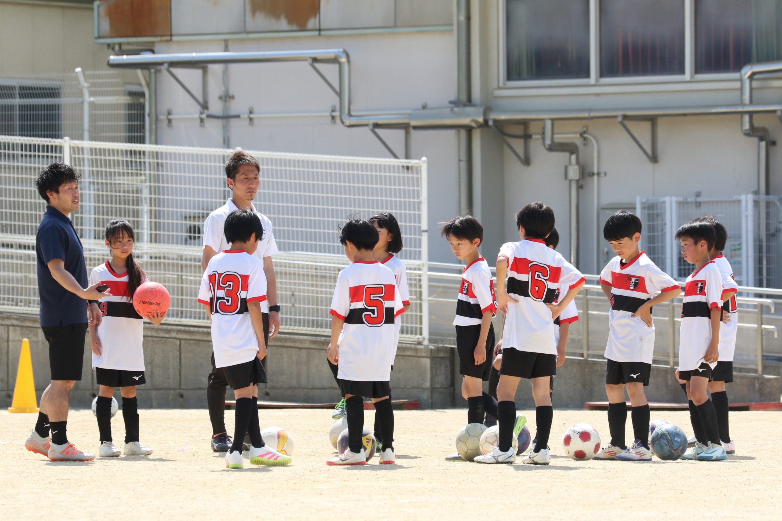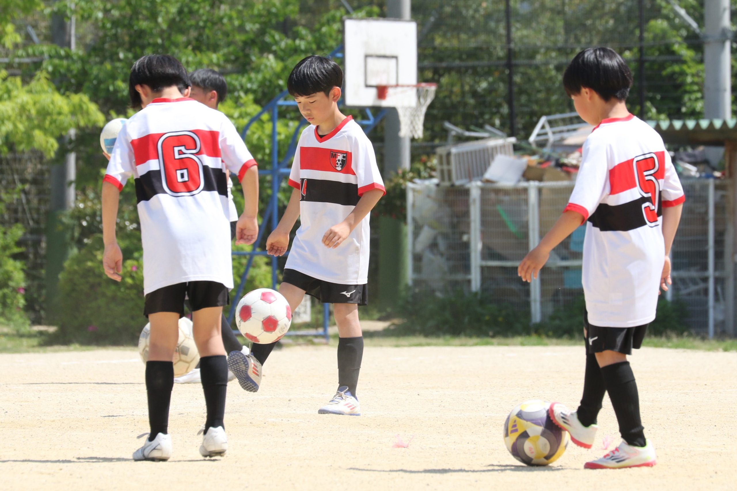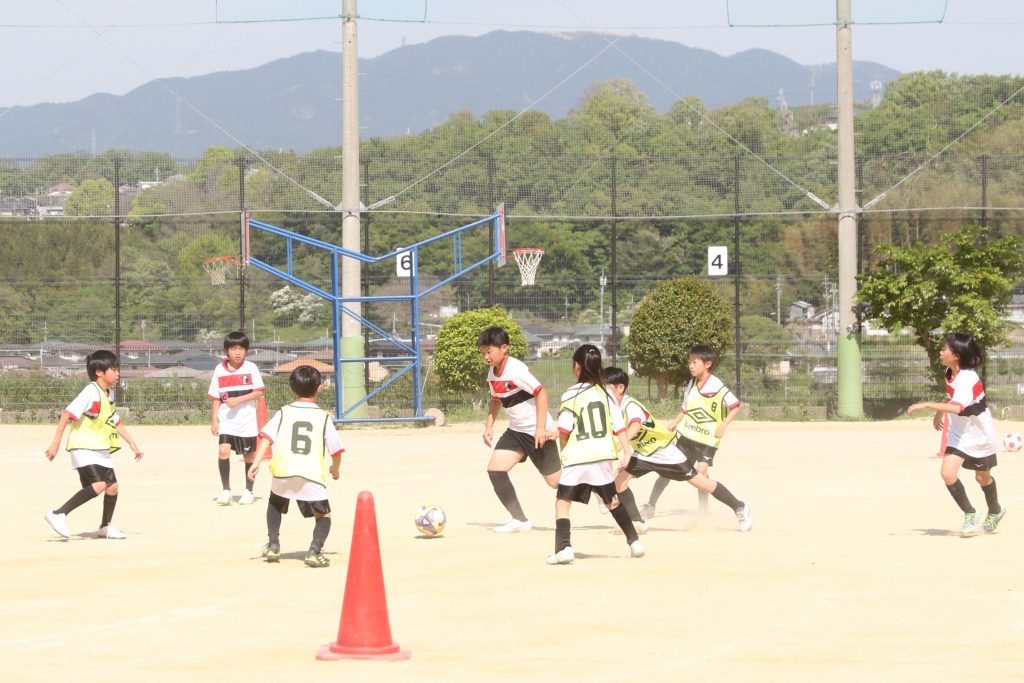 6年生を指揮するのは、奥江修司コーチで、20年以上チームに関わり指導している。「子供達一人一人がスキルアップでき、楽しく勝てるサッカーを目指して指導している。」と話す。練習はリフティングに始まり、浮き球のトラップ、ドリブル、対人練習と、基本的なメニューが多く、ミニゲームでは笑顔でボールを奪い合う中にも、時折激しさもあり、選手ひとりひとりが、楽しくまた真剣に取り組んでいる。