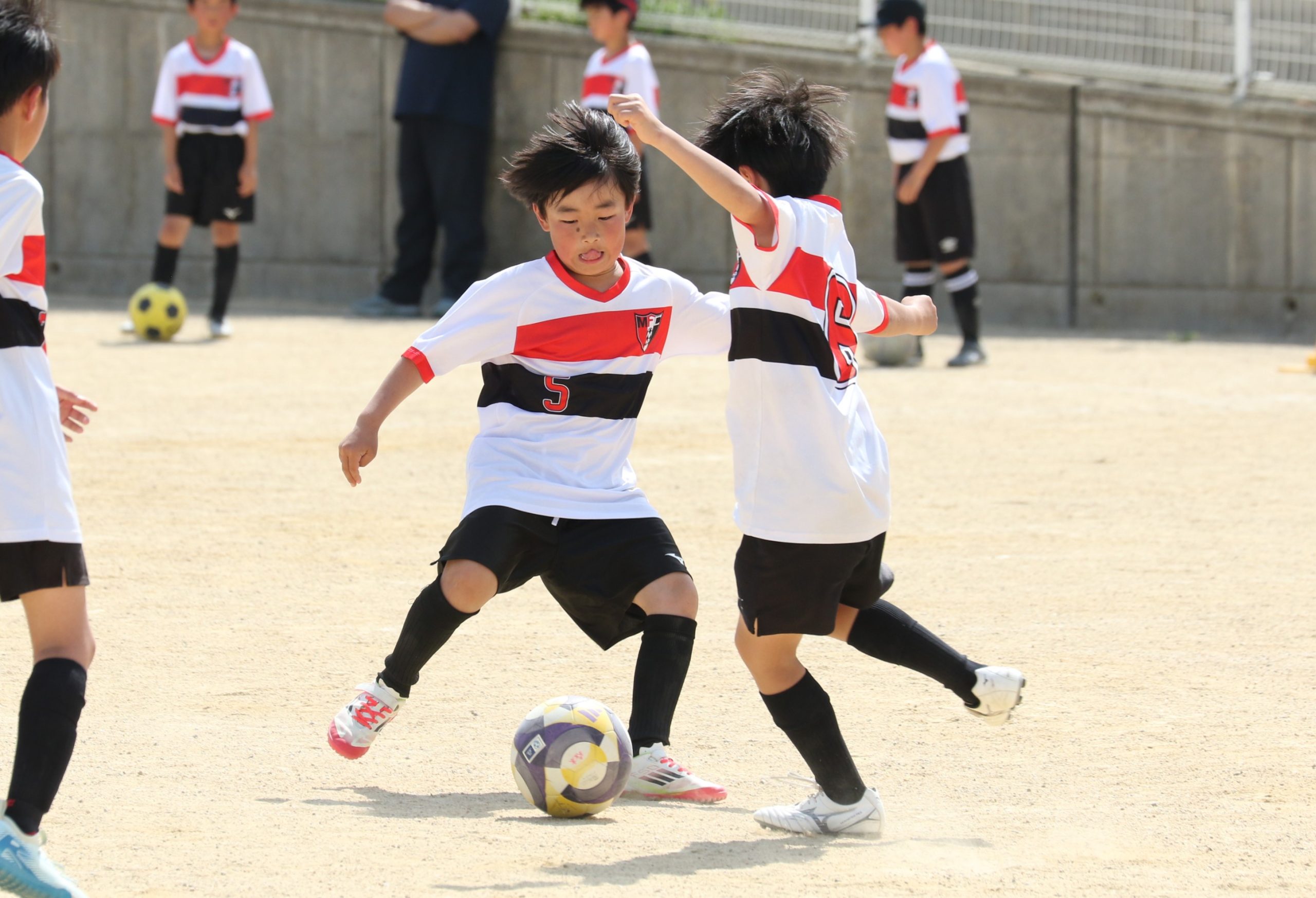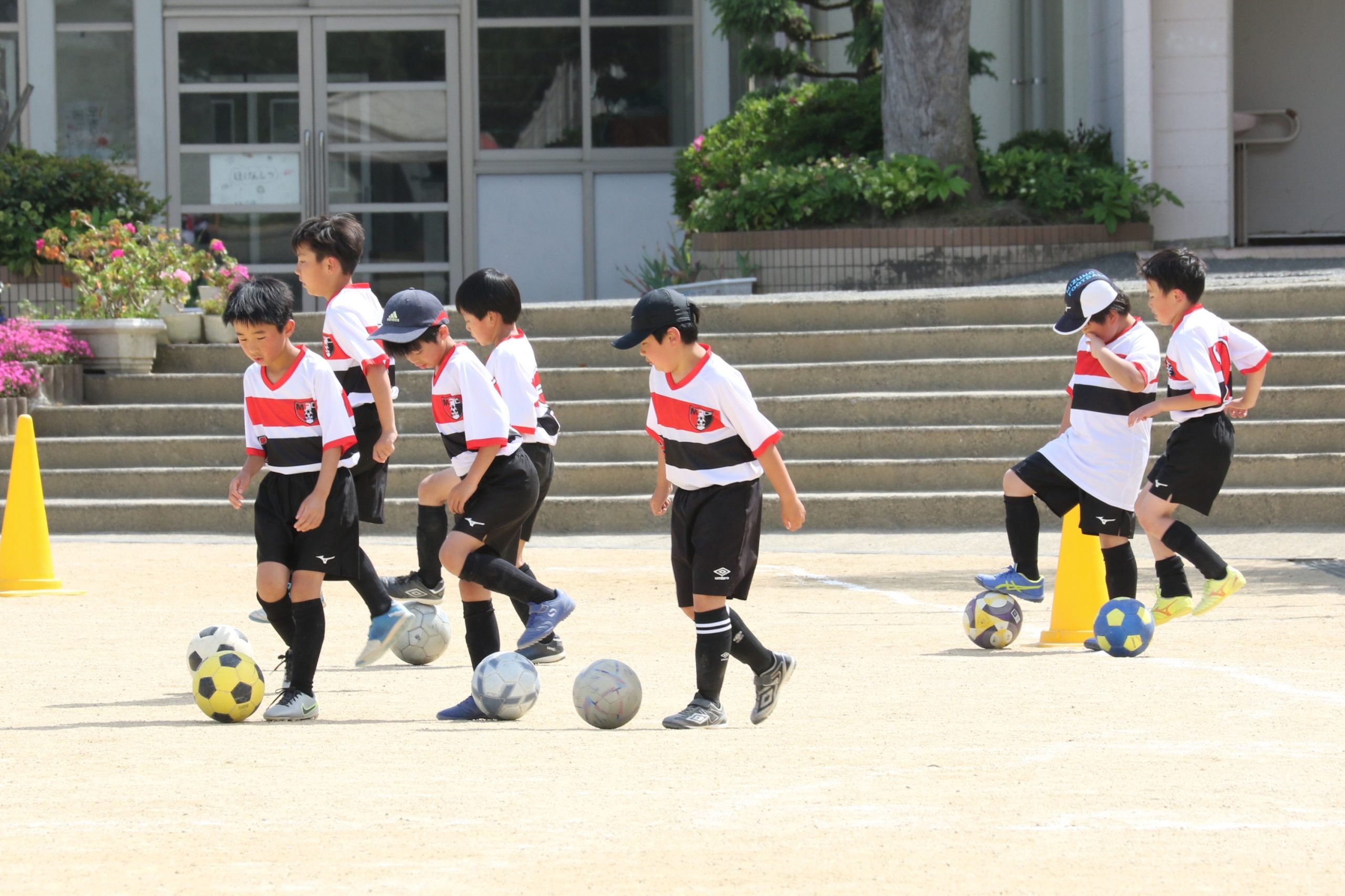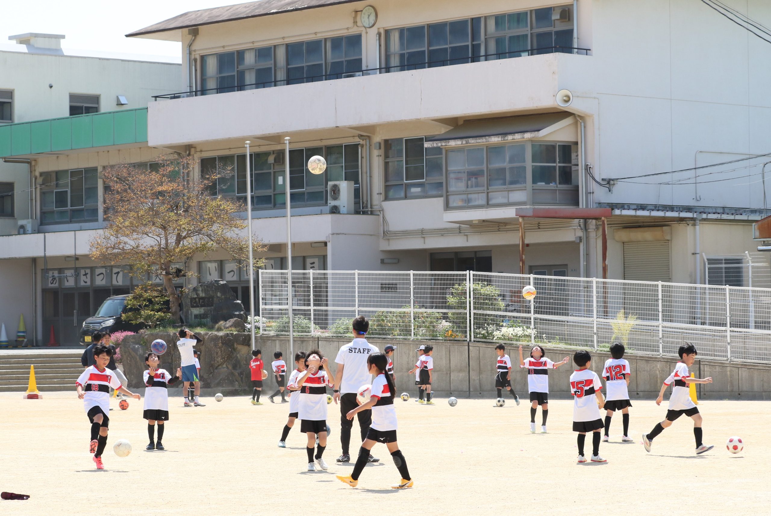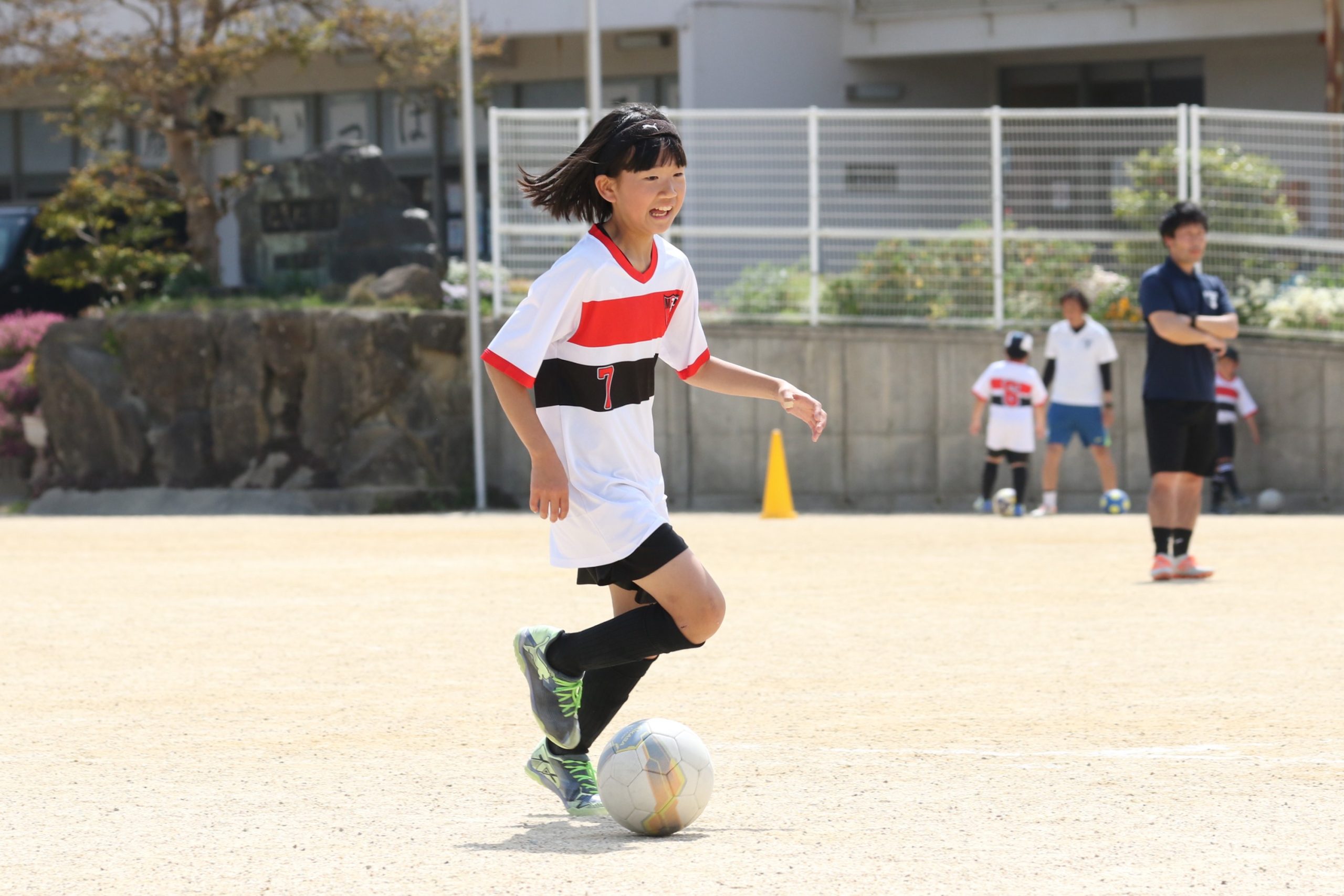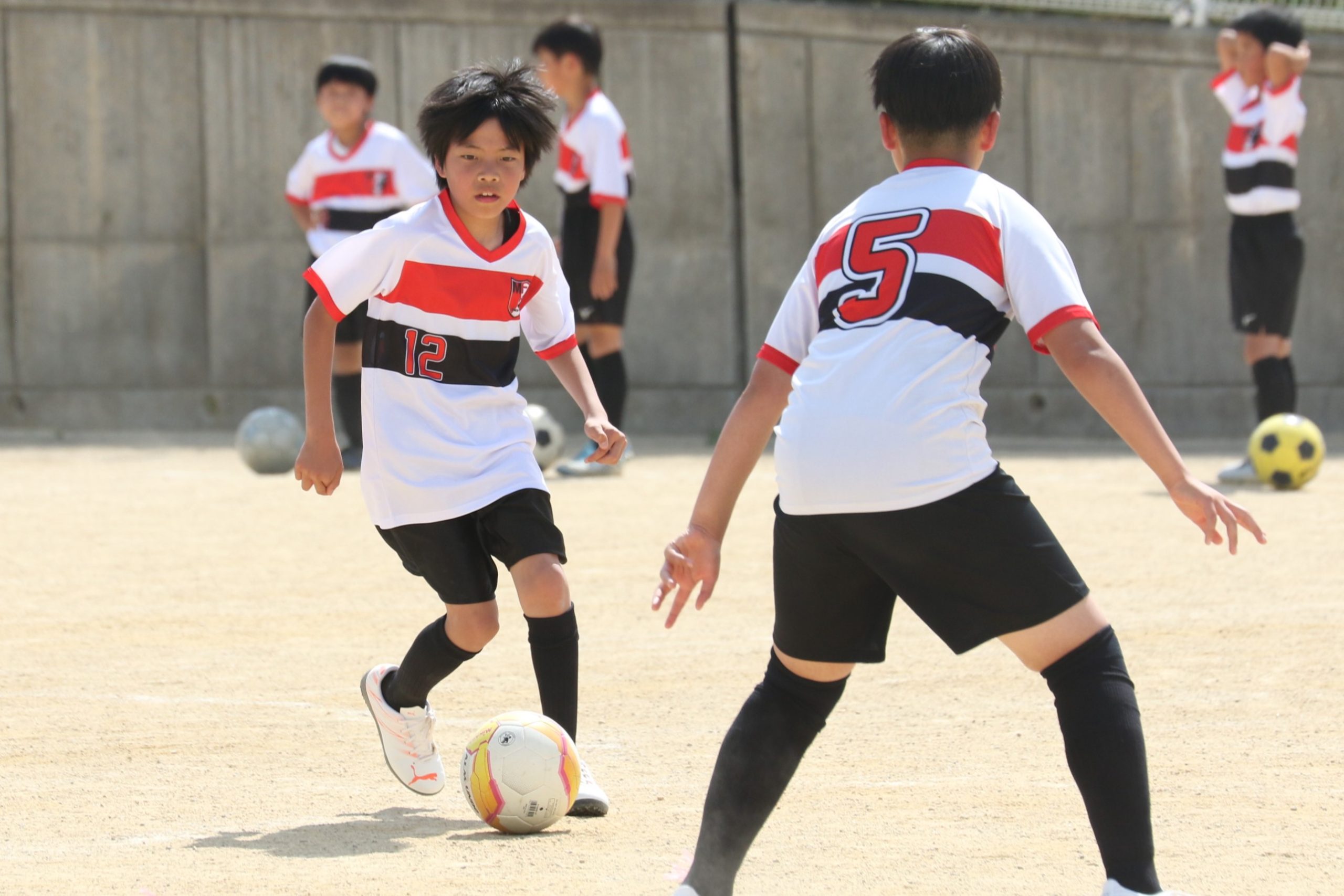 6年生を指揮するのは、奥江修司コーチで、20年以上チームに関わり指導している。「子供達一人一人がスキルアップでき、楽しく勝てるサッカーを目指して指導している。」と話す。練習はリフティングに始まり、浮き球のトラップ、ドリブル、対人練習と、基本的なメニューが多く、ミニゲームでは笑顔でボールを奪い合う中にも、時折激しさもあり、選手ひとりひとりが、楽しくまた真剣に取り組んでいる。