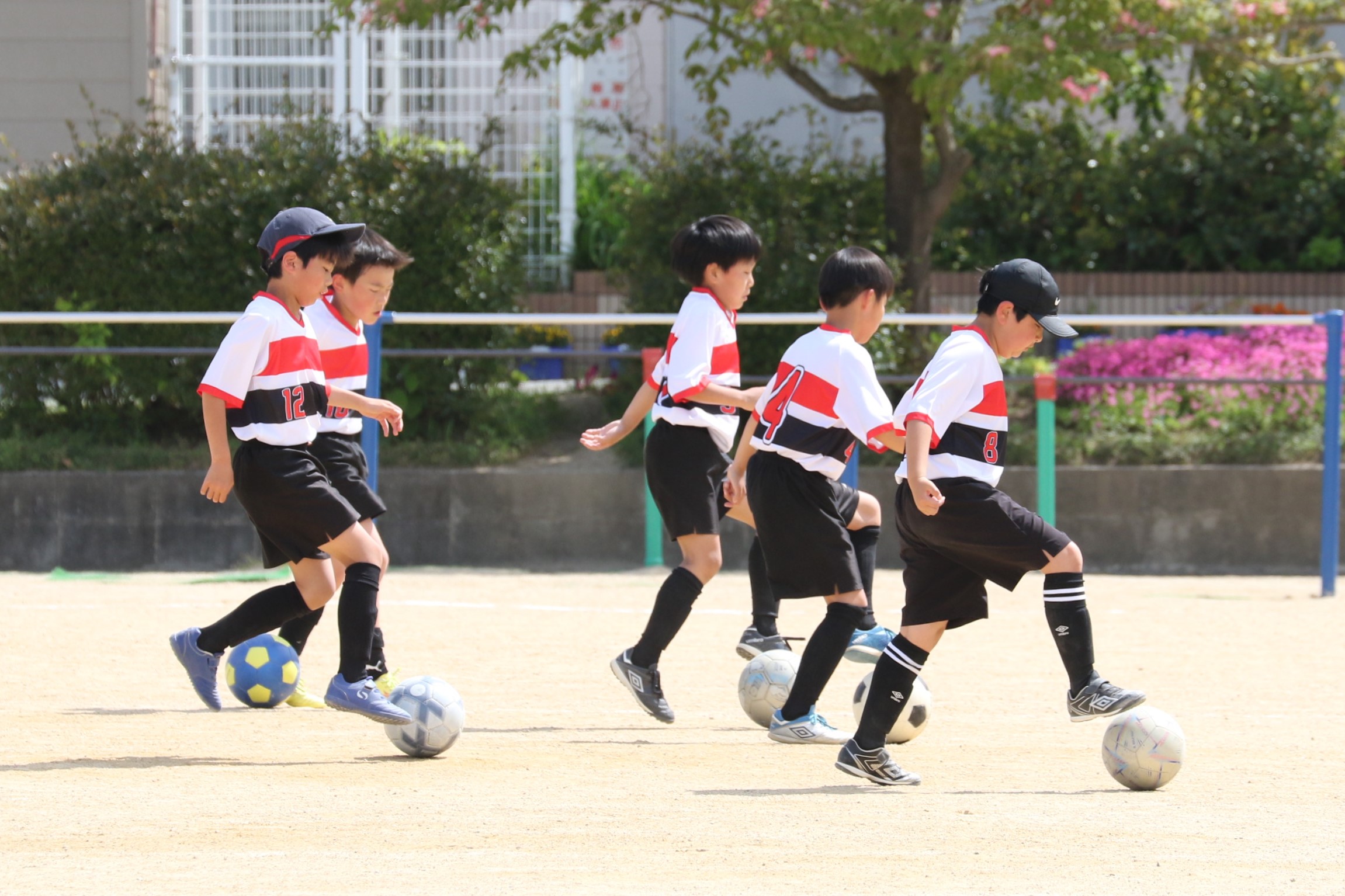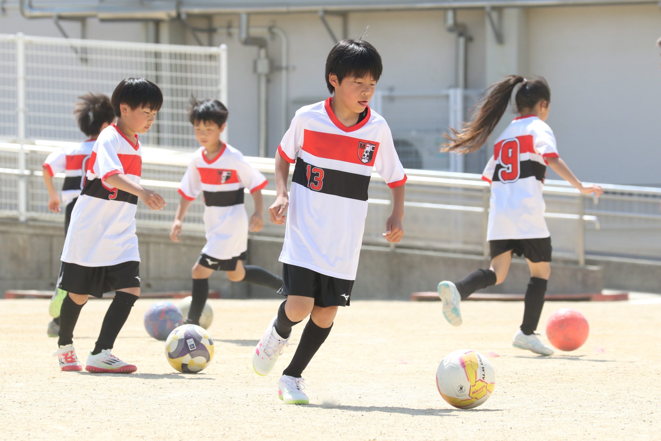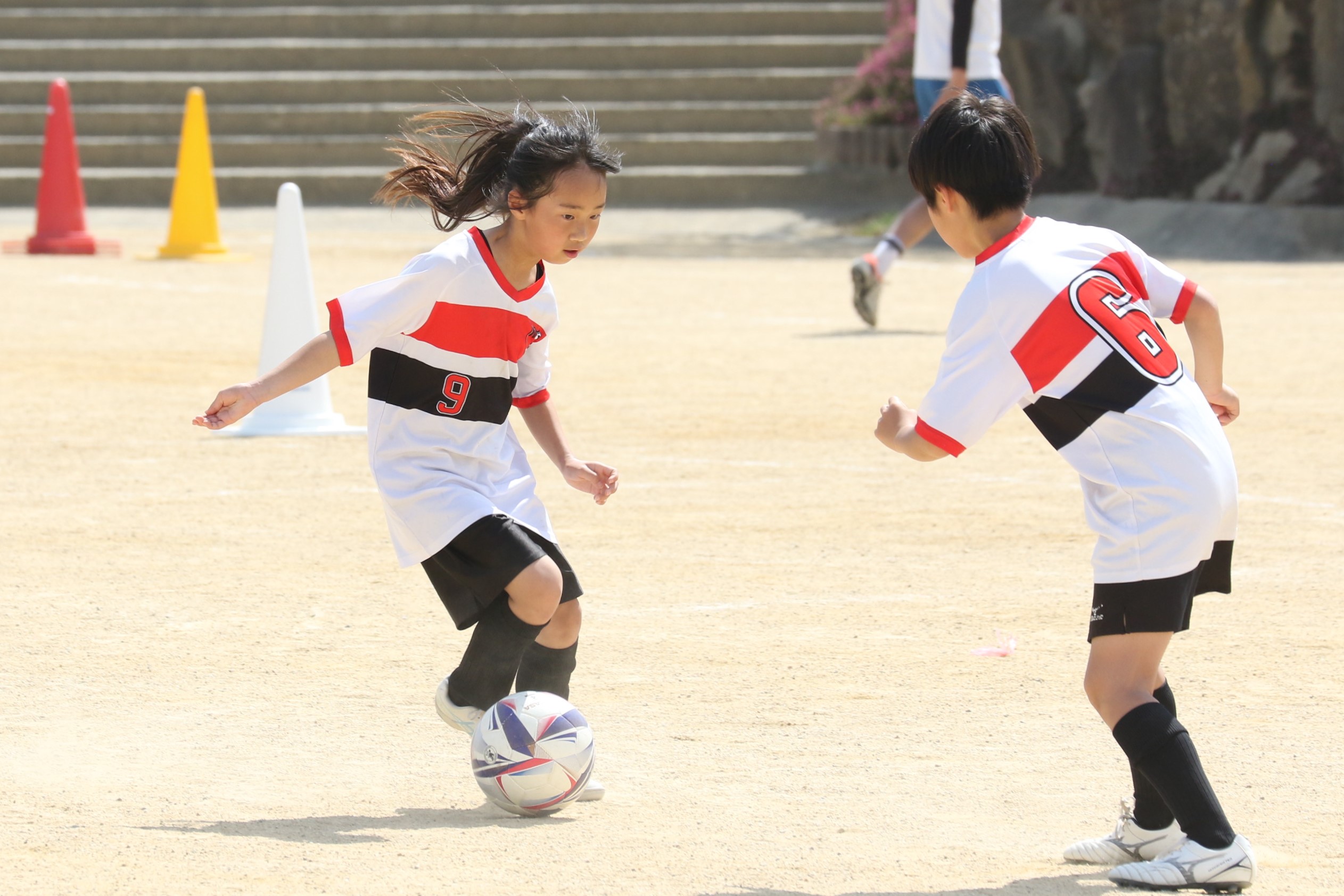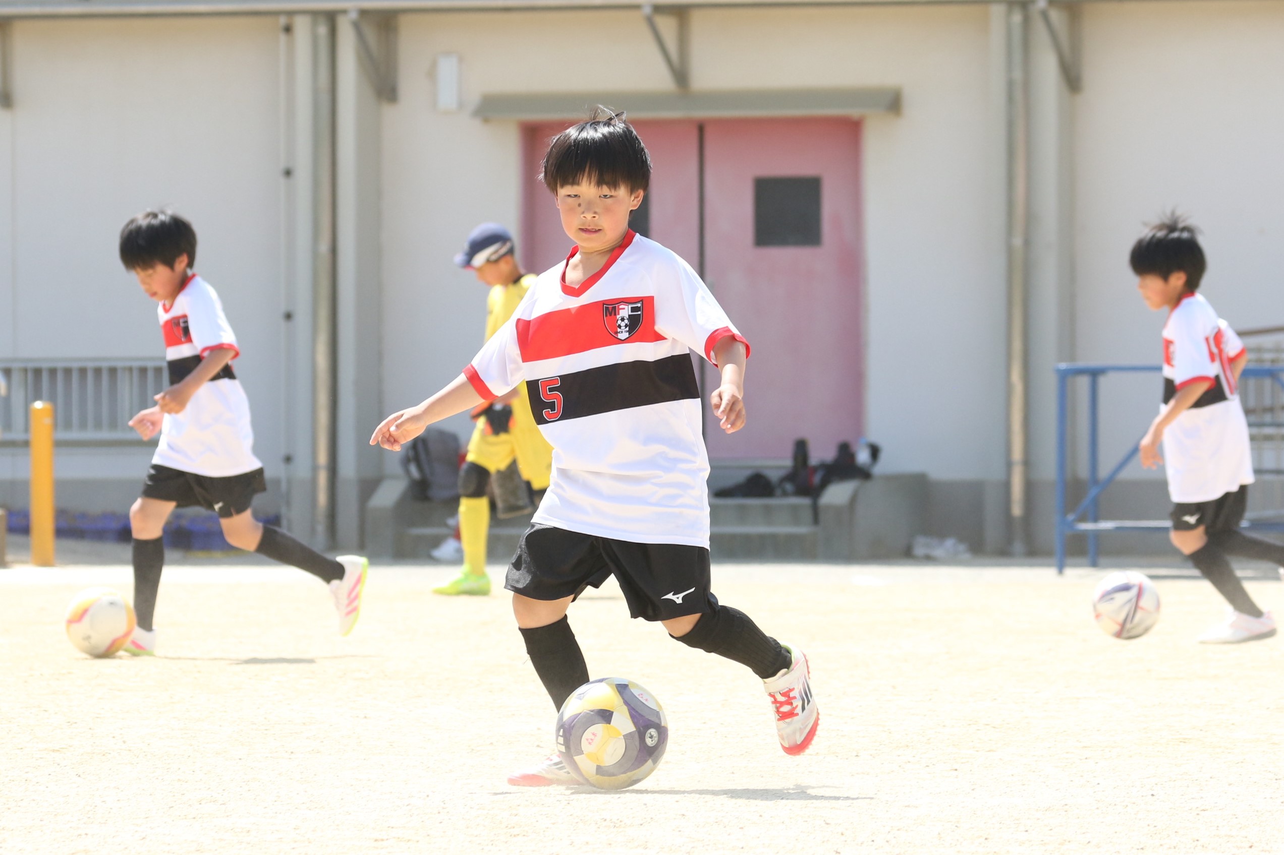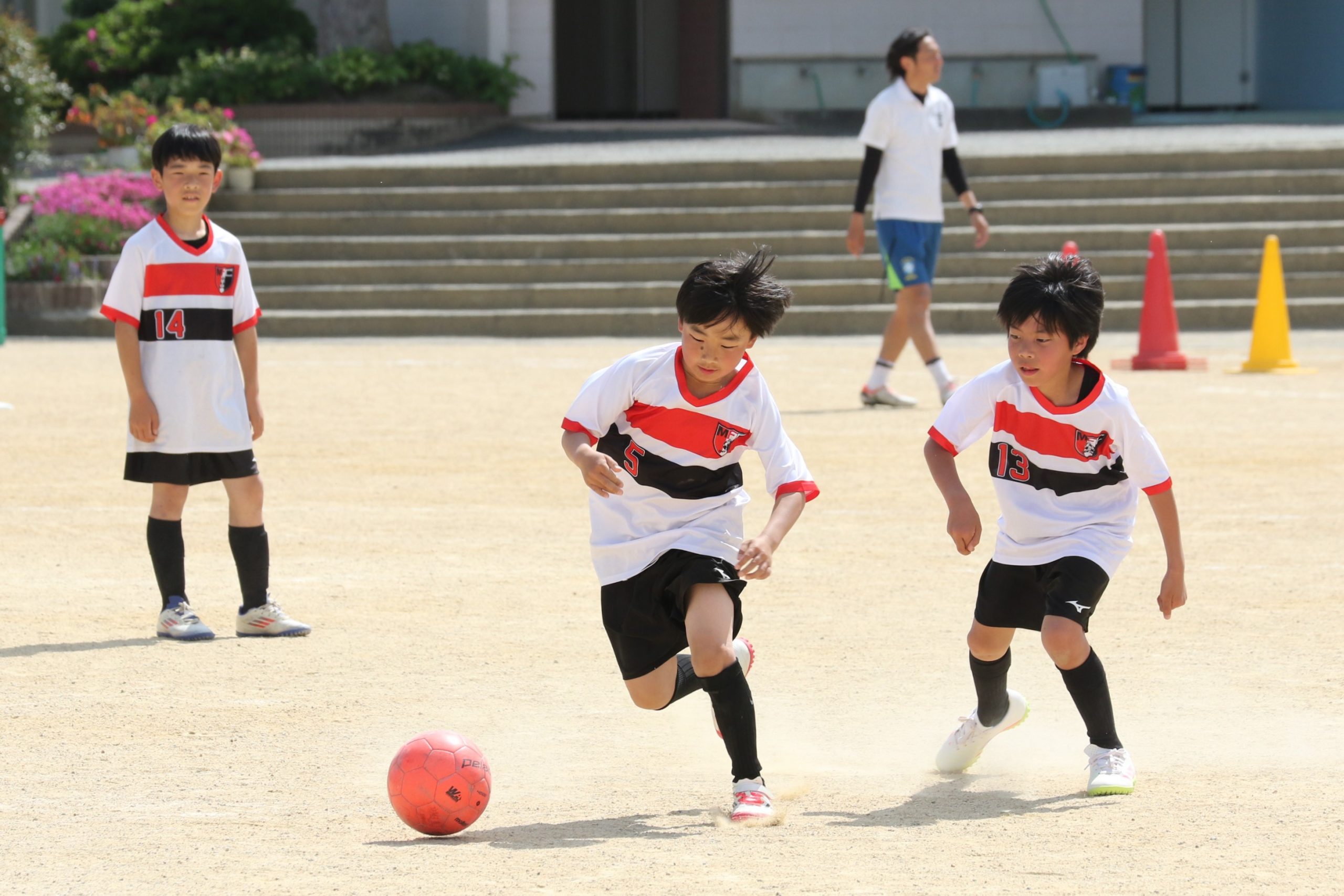 6年生を指揮するのは、奥江修司コーチで、20年以上チームに関わり指導している。「子供達一人一人がスキルアップでき、楽しく勝てるサッカーを目指して指導している。」と話す。練習はリフティングに始まり、浮き球のトラップ、ドリブル、対人練習と、基本的なメニューが多く、ミニゲームでは笑顔でボールを奪い合う中にも、時折激しさもあり、選手ひとりひとりが、楽しくまた真剣に取り組んでいる。