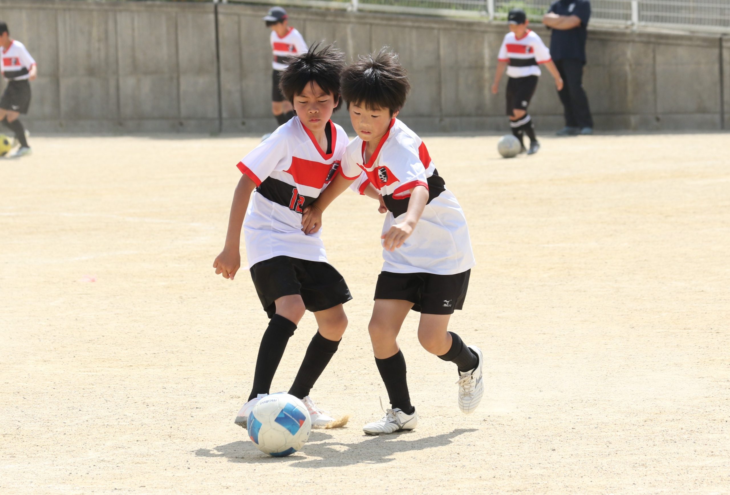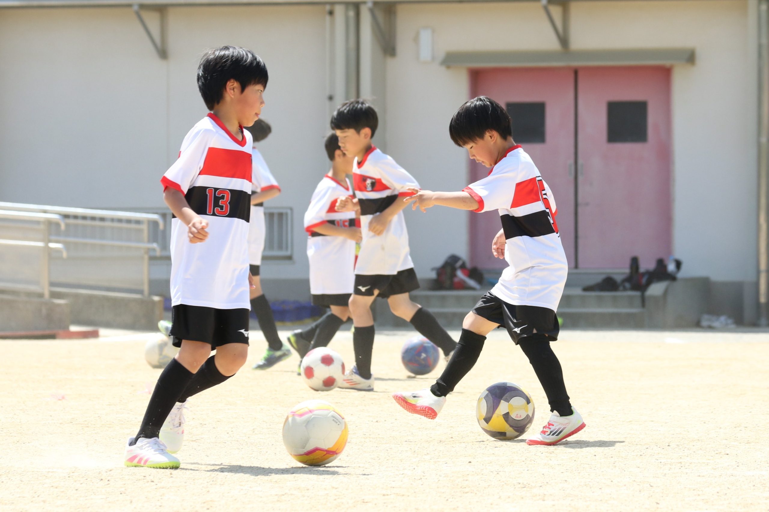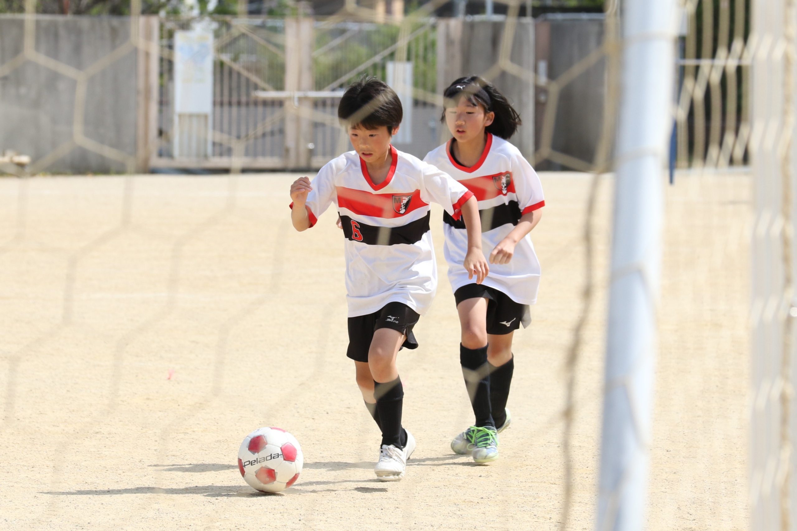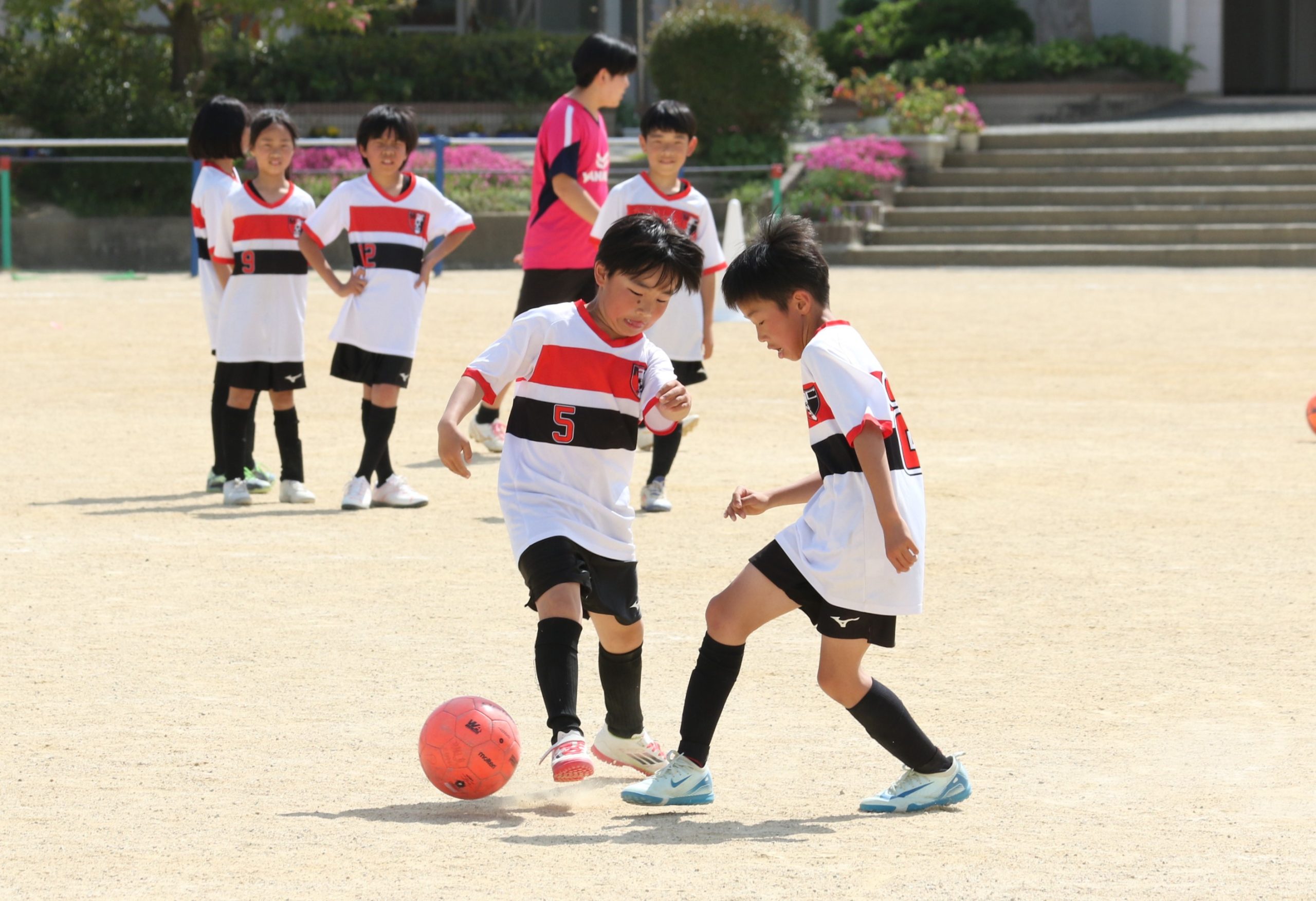 6年生を指揮するのは、奥江修司コーチで、20年以上チームに関わり指導している。「子供達一人一人がスキルアップでき、楽しく勝てるサッカーを目指して指導している。」と話す。練習はリフティングに始まり、浮き球のトラップ、ドリブル、対人練習と、基本的なメニューが多く、ミニゲームでは笑顔でボールを奪い合う中にも、時折激しさもあり、選手ひとりひとりが、楽しくまた真剣に取り組んでいる。