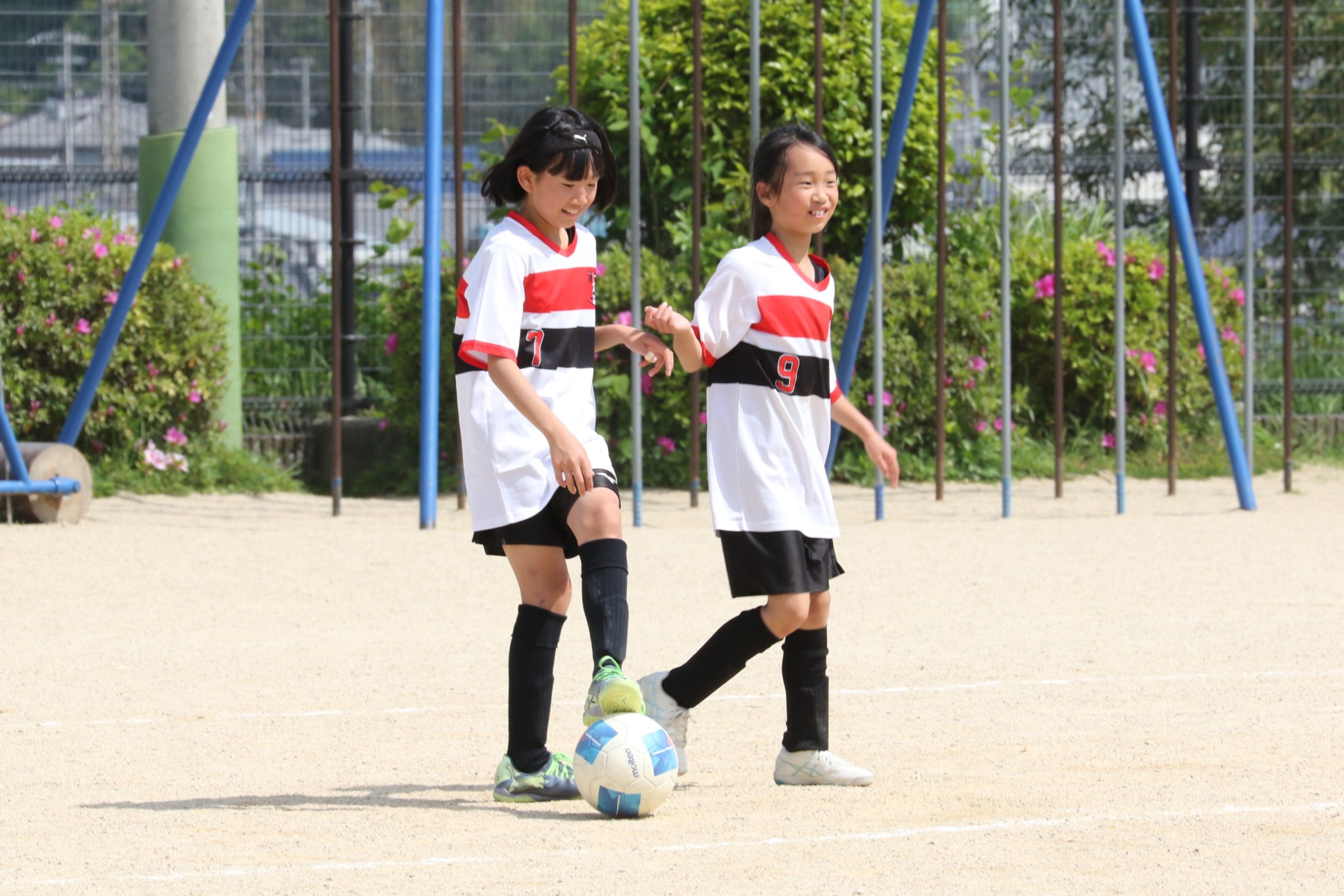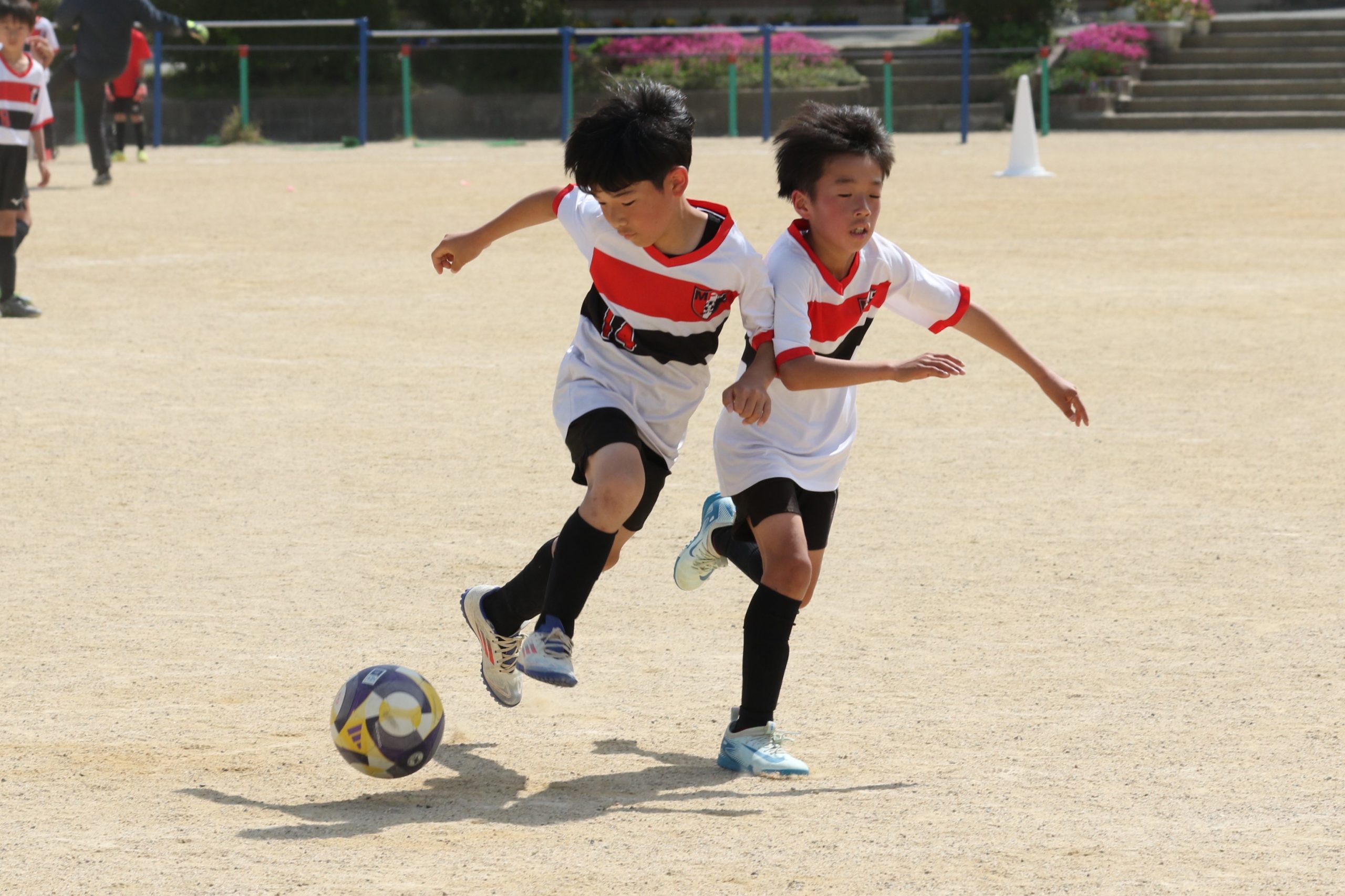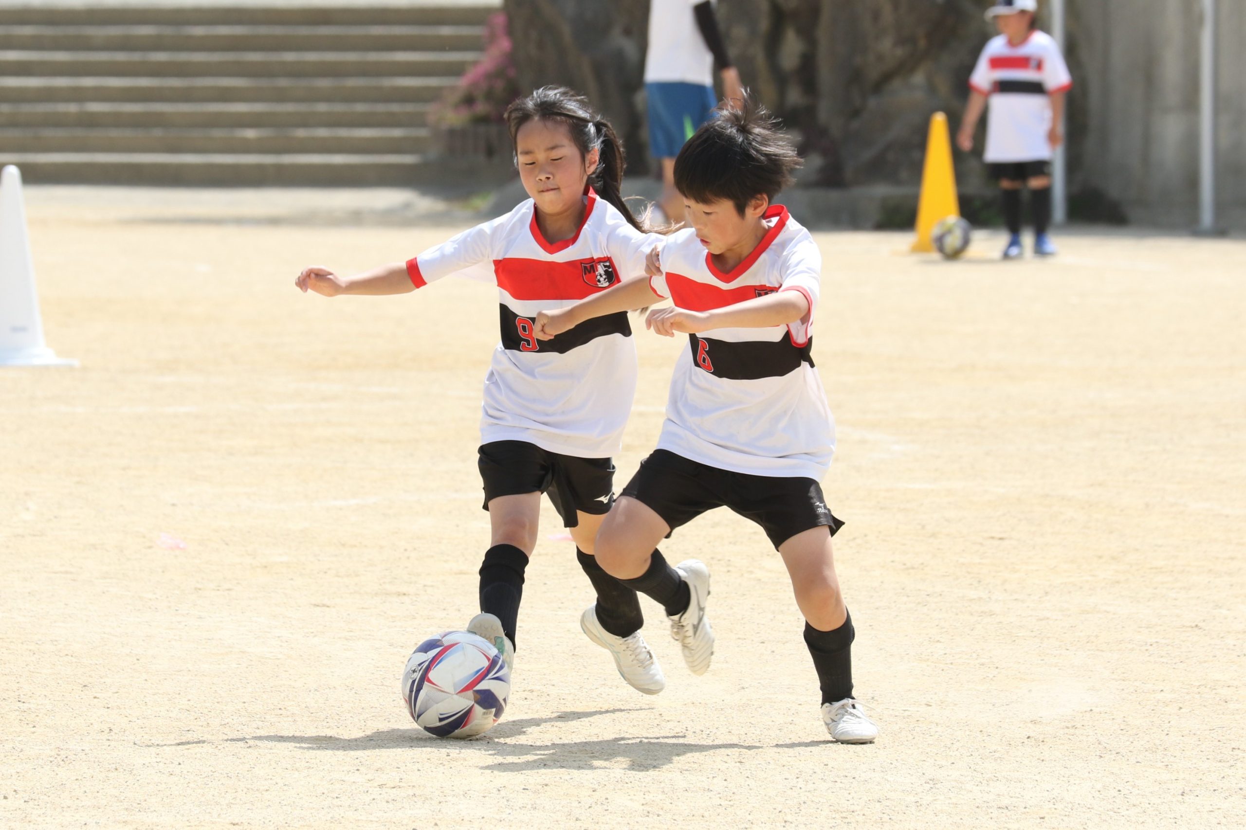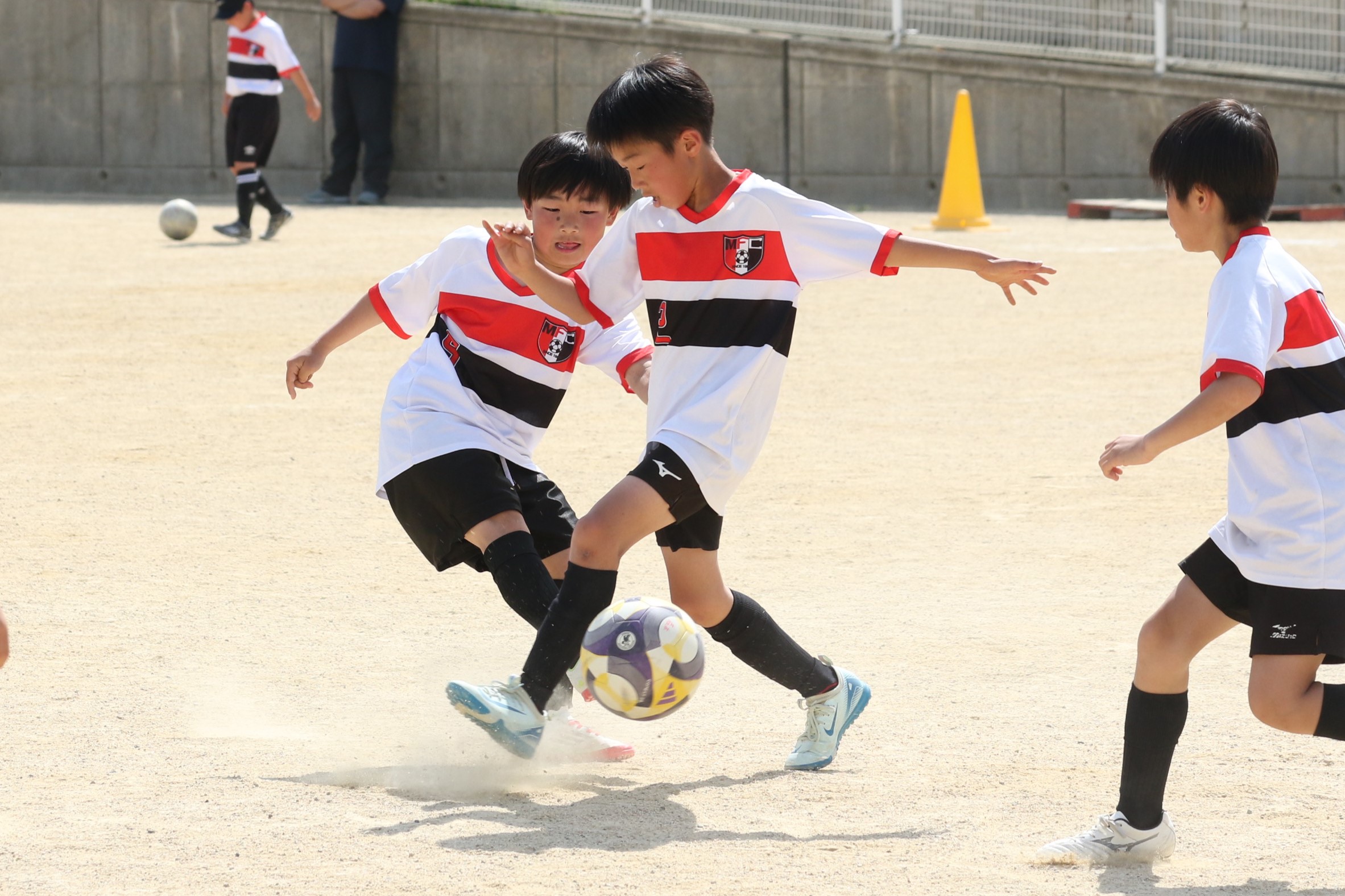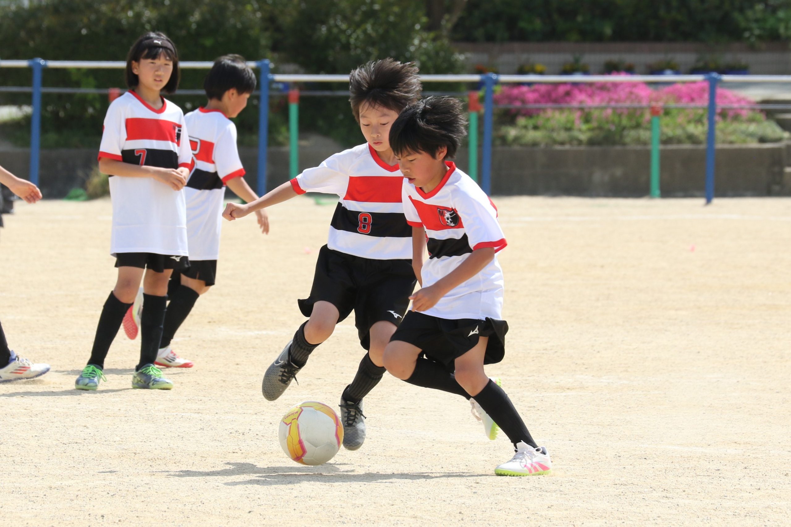 6年生を指揮するのは、奥江修司コーチで、20年以上チームに関わり指導している。「子供達一人一人がスキルアップでき、楽しく勝てるサッカーを目指して指導している。」と話す。練習はリフティングに始まり、浮き球のトラップ、ドリブル、対人練習と、基本的なメニューが多く、ミニゲームでは笑顔でボールを奪い合う中にも、時折激しさもあり、選手ひとりひとりが、楽しくまた真剣に取り組んでいる。