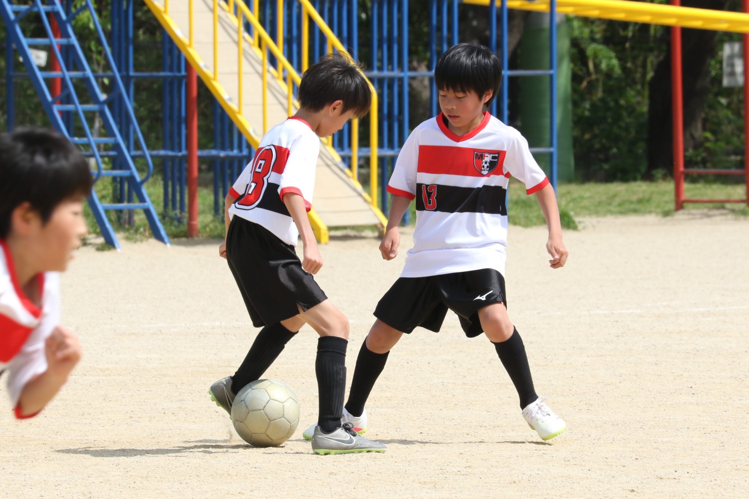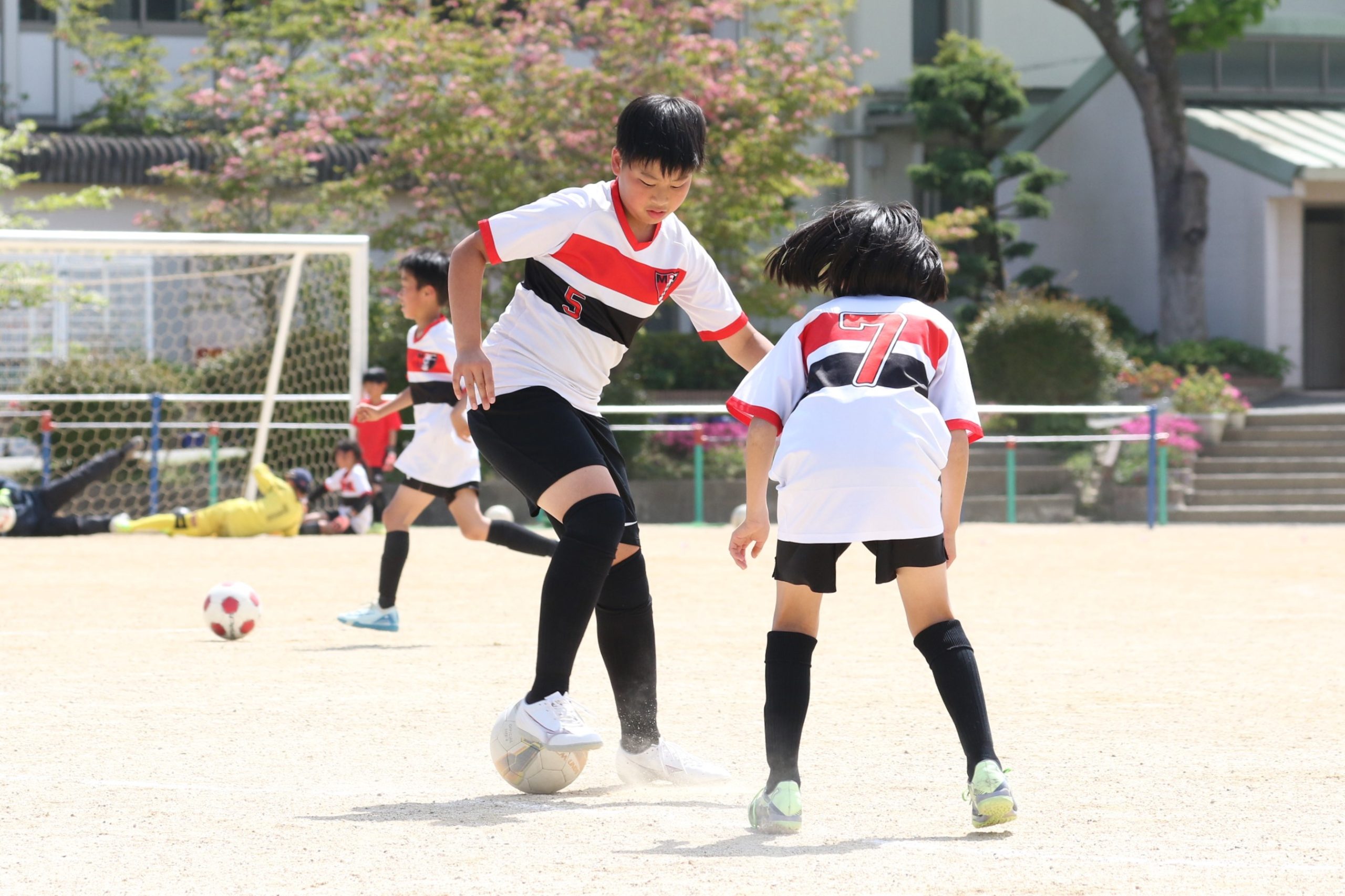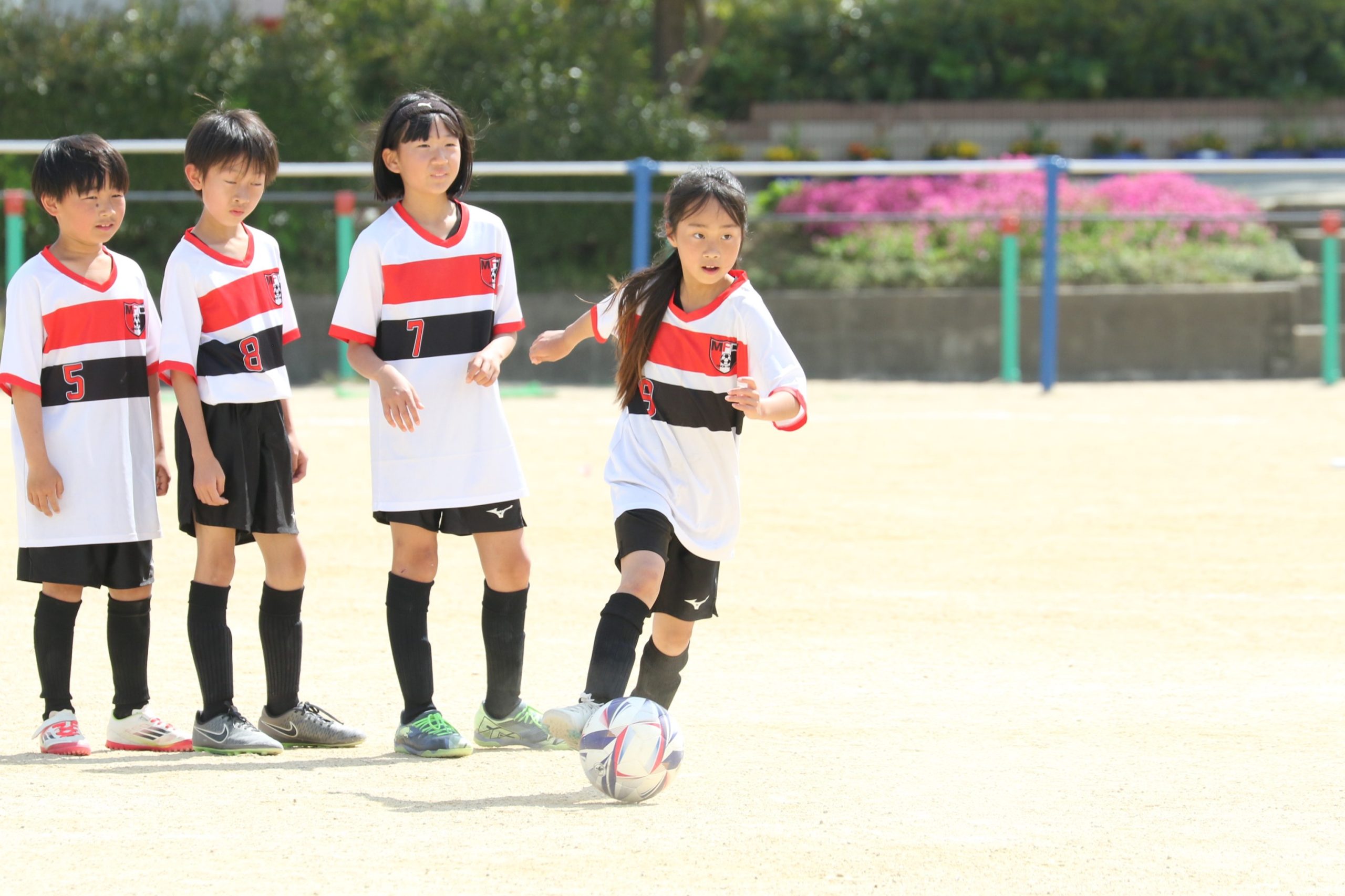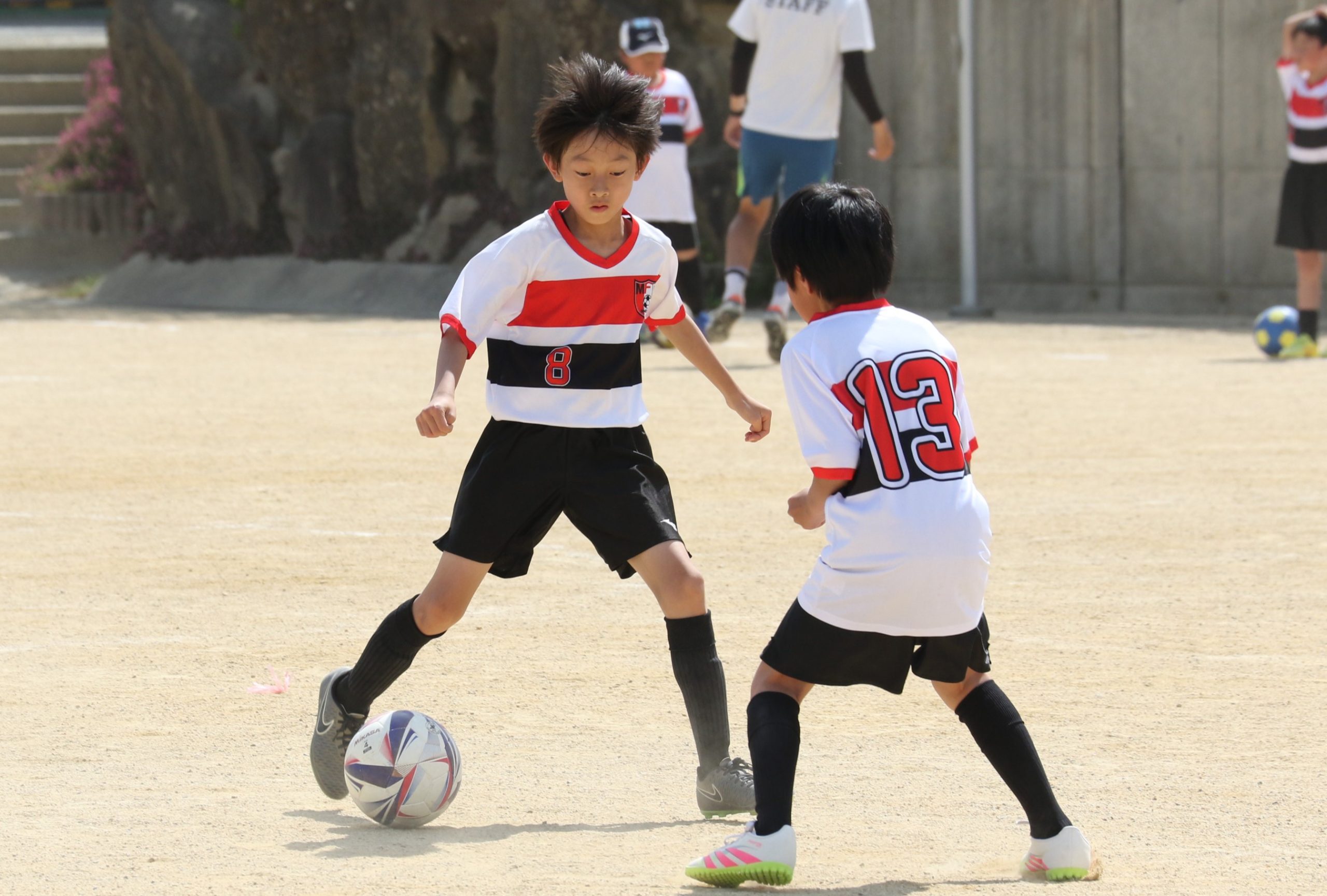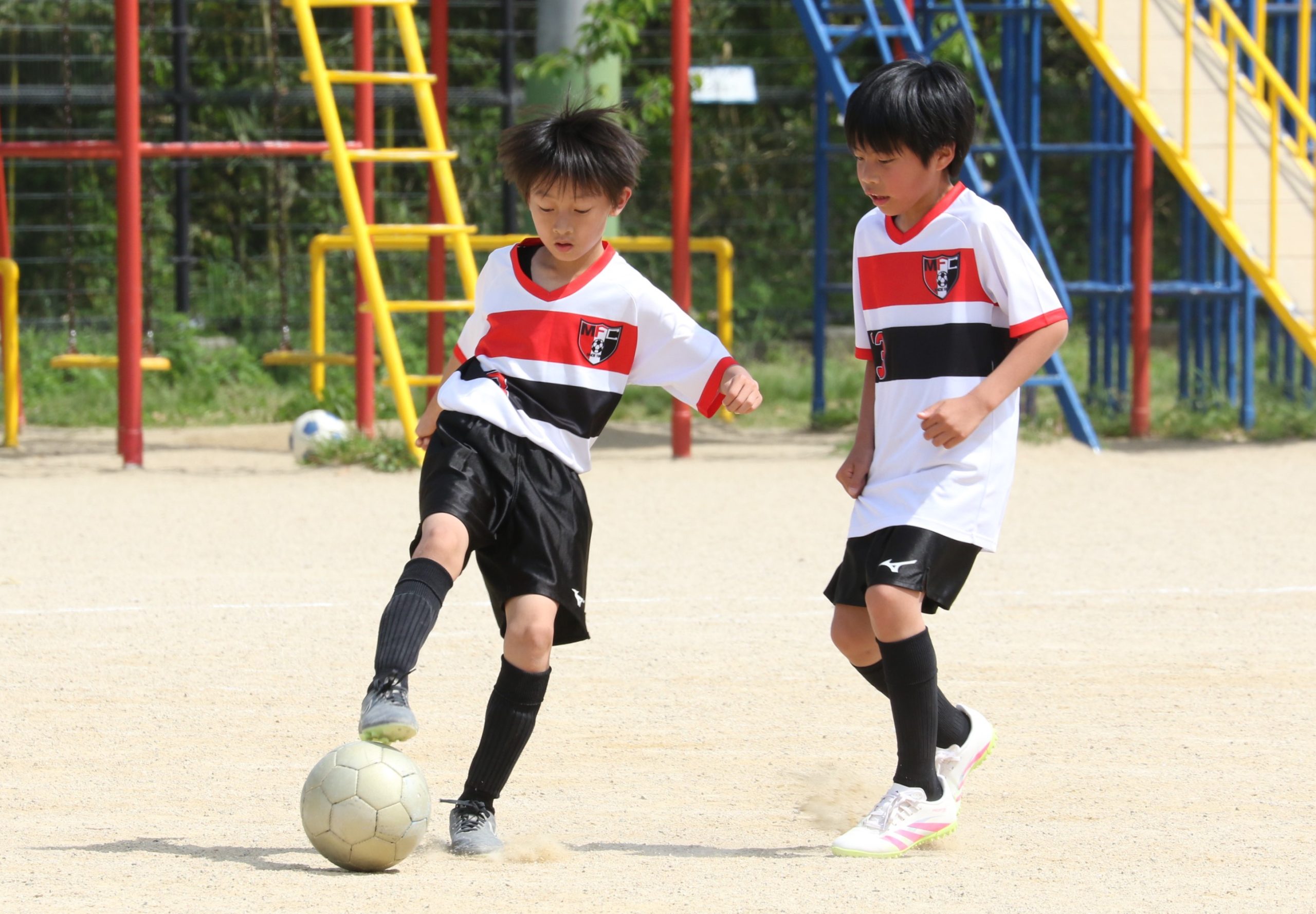6年生を指揮するのは、奥江修司コーチで、20年以上チームに関わり指導している。「子供達一人一人がスキルアップでき、楽しく勝てるサッカーを目指して指導している。」と話す。練習はリフティングに始まり、浮き球のトラップ、ドリブル、対人練習と、基本的なメニューが多く、ミニゲームでは笑顔でボールを奪い合う中にも、時折激しさもあり、選手ひとりひとりが、楽しくまた真剣に取り組んでいる。