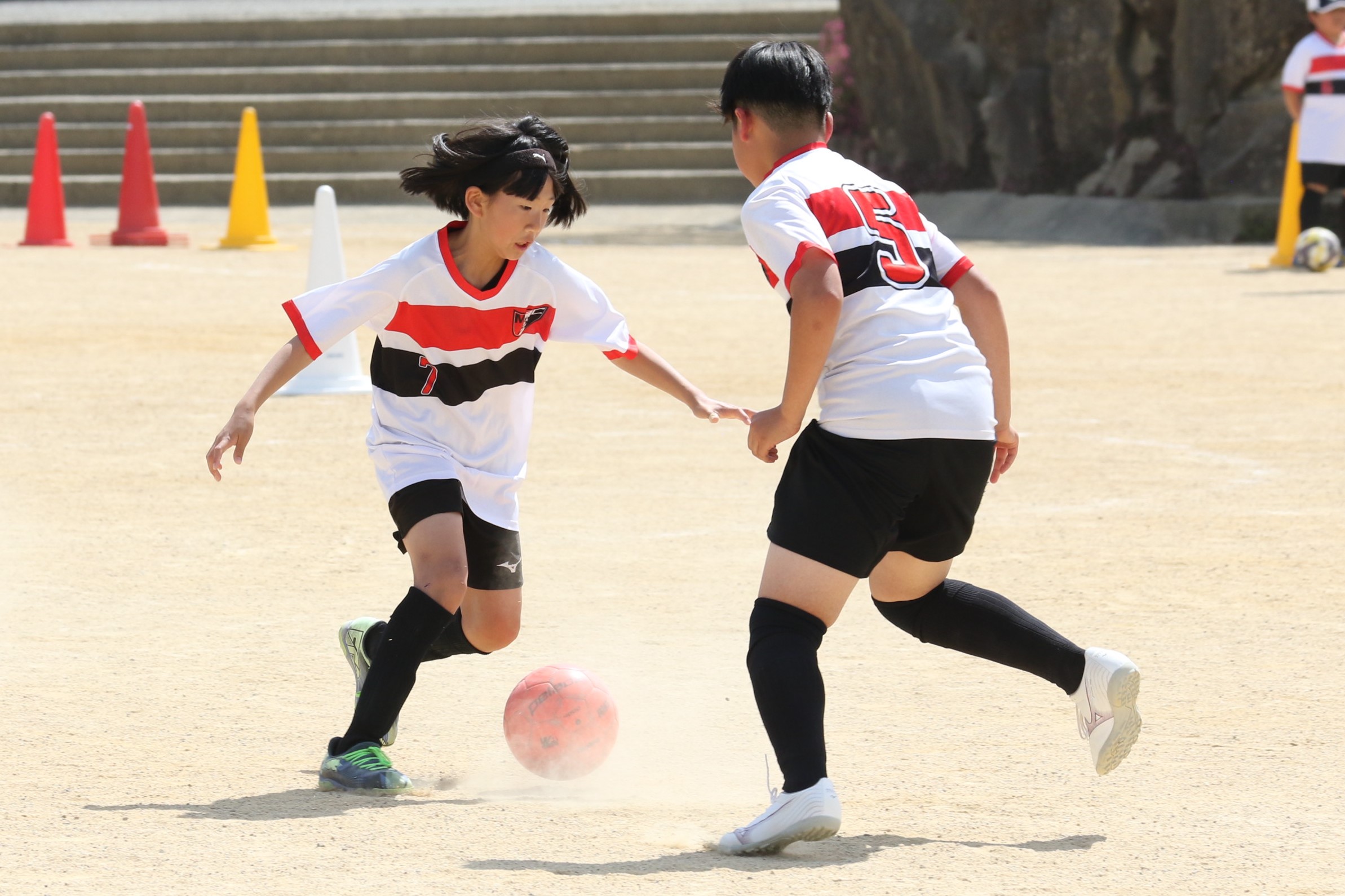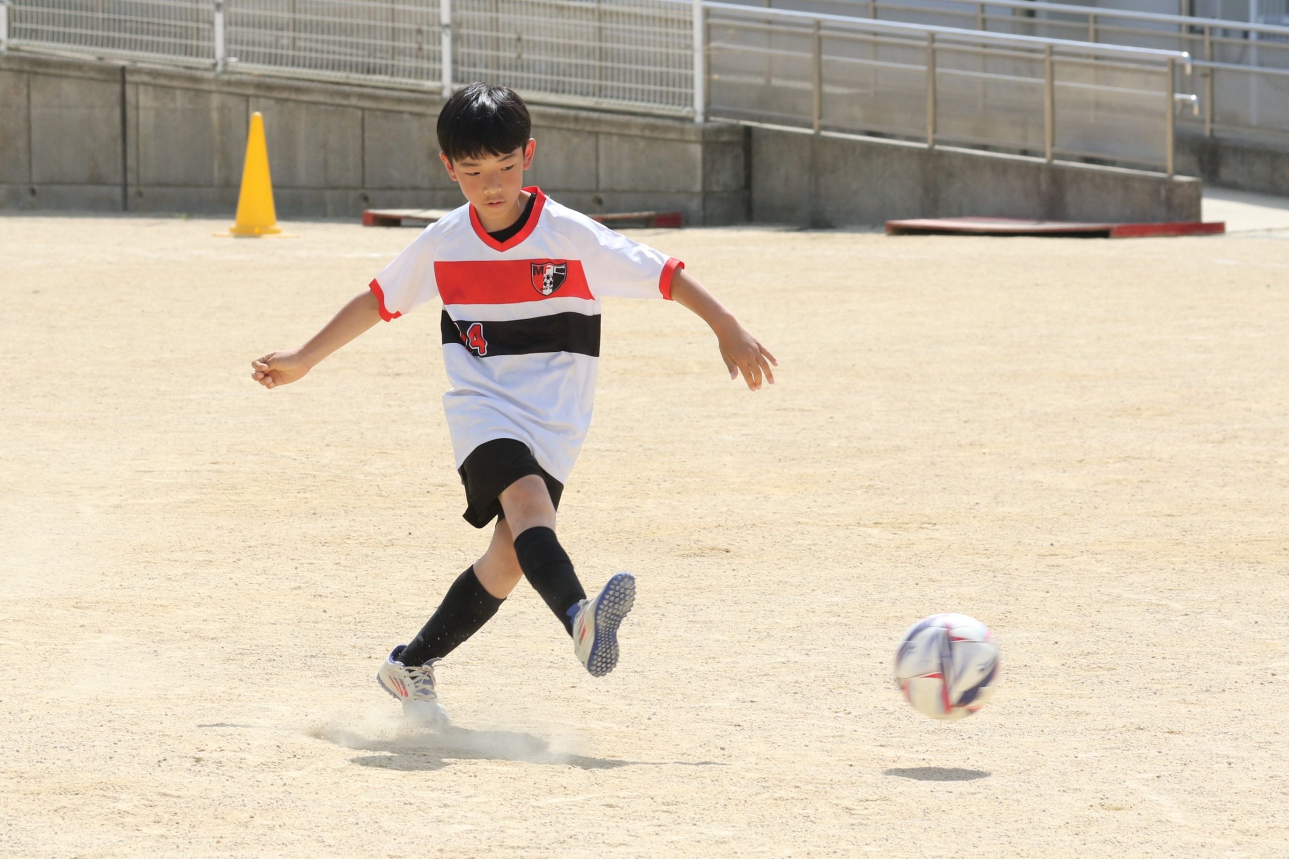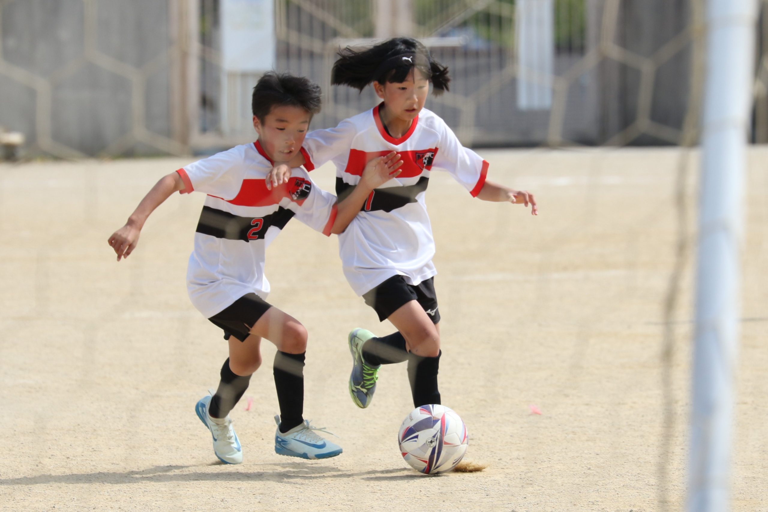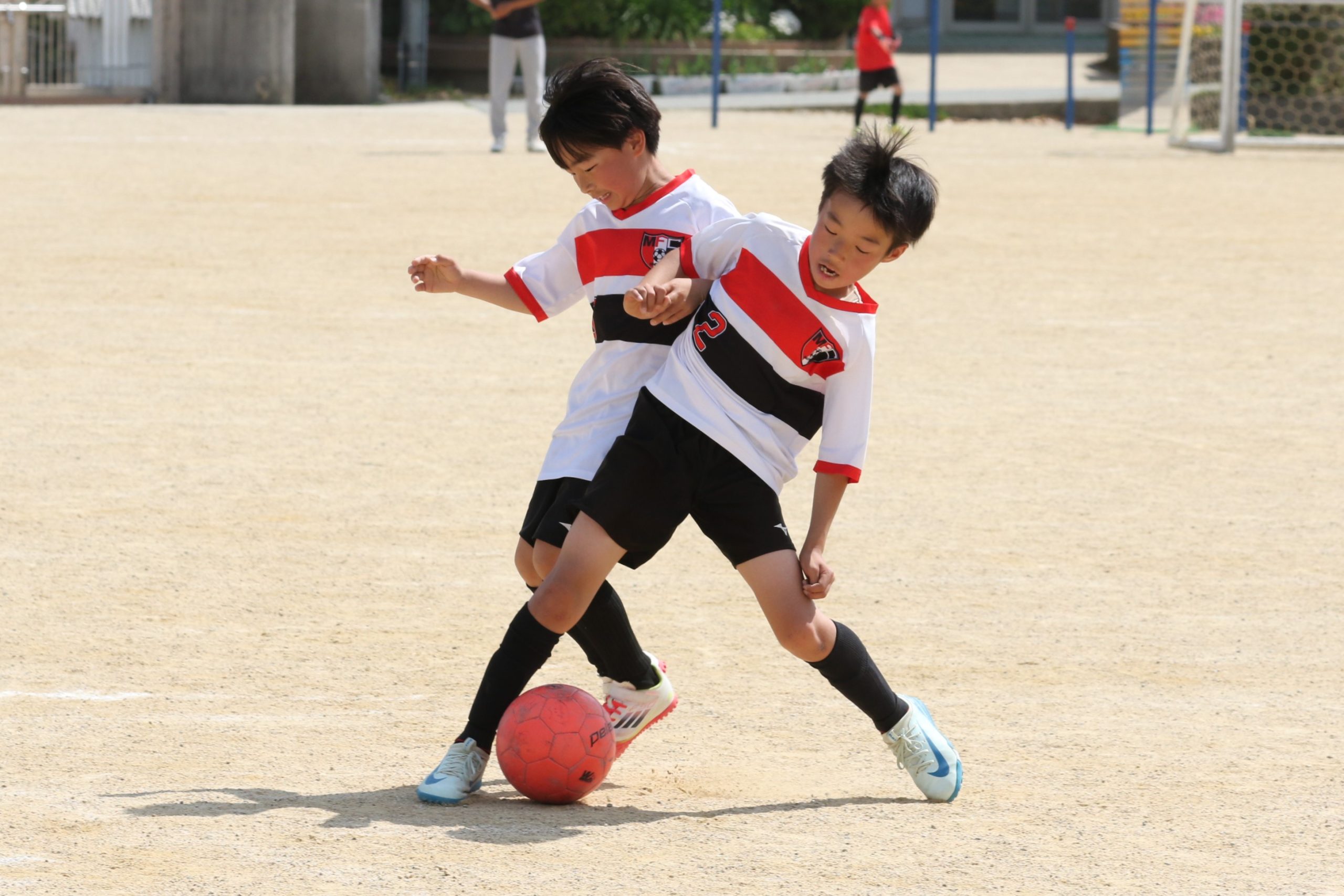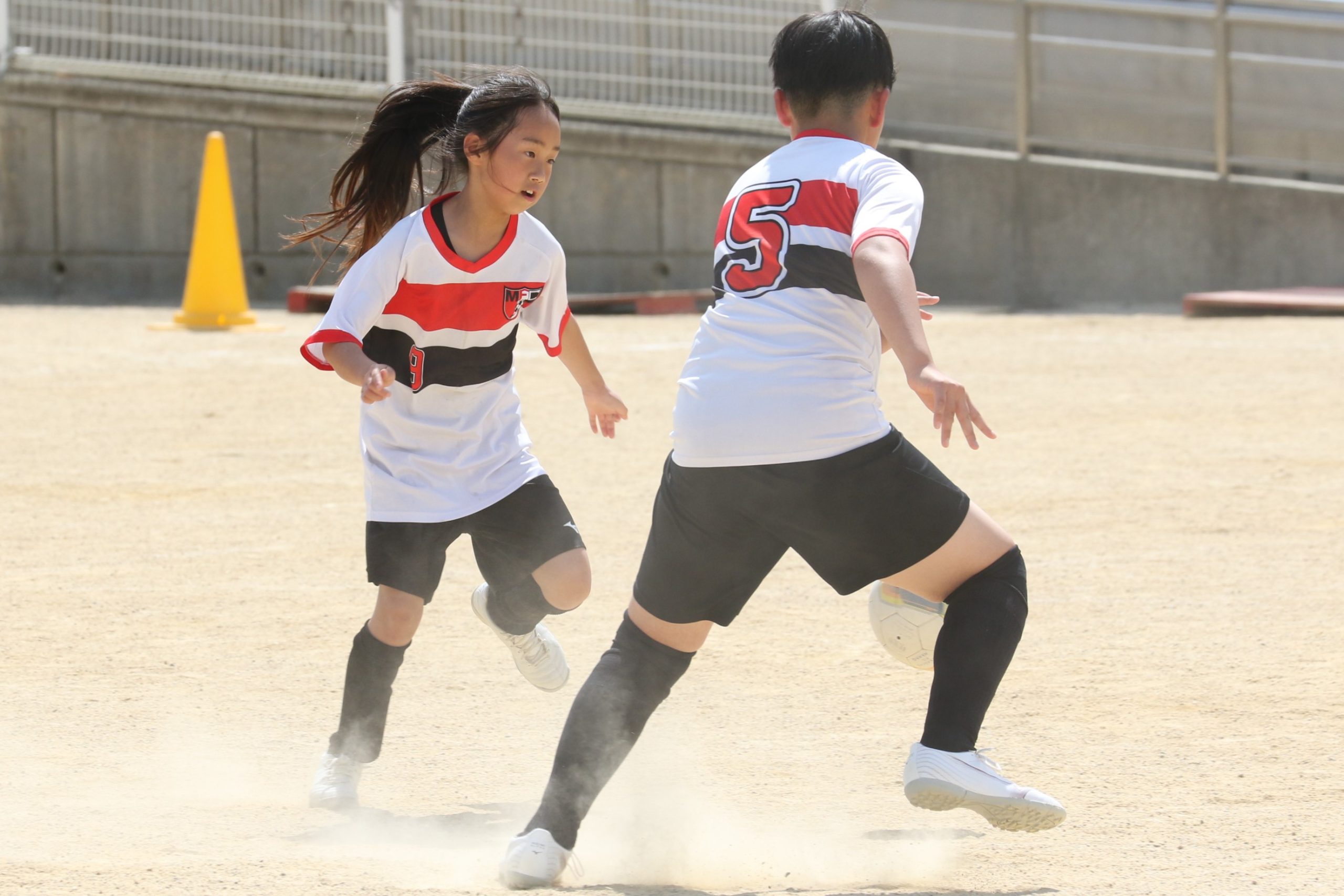 6年生を指揮するのは、奥江修司コーチで、20年以上チームに関わり指導している。「子供達一人一人がスキルアップでき、楽しく勝てるサッカーを目指して指導している。」と話す。練習はリフティングに始まり、浮き球のトラップ、ドリブル、対人練習と、基本的なメニューが多く、ミニゲームでは笑顔でボールを奪い合う中にも、時折激しさもあり、選手ひとりひとりが、楽しくまた真剣に取り組んでいる。