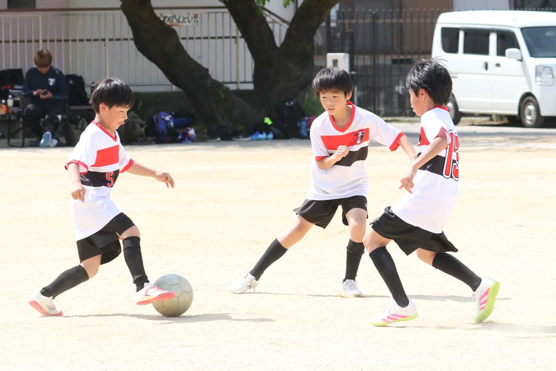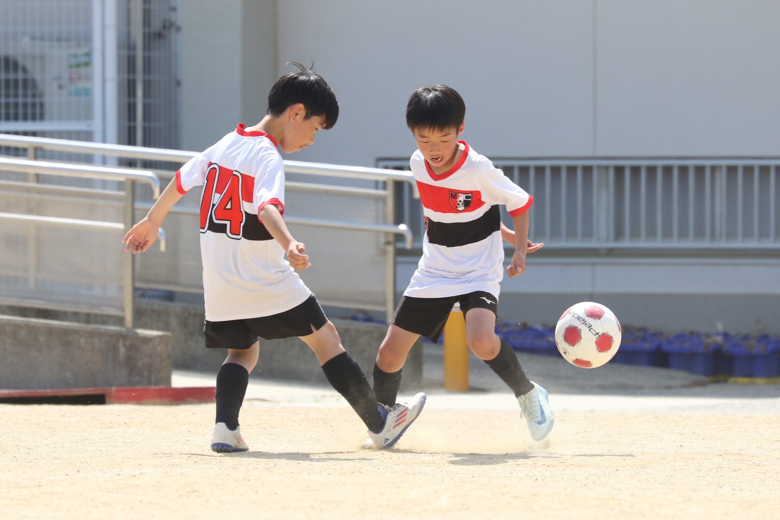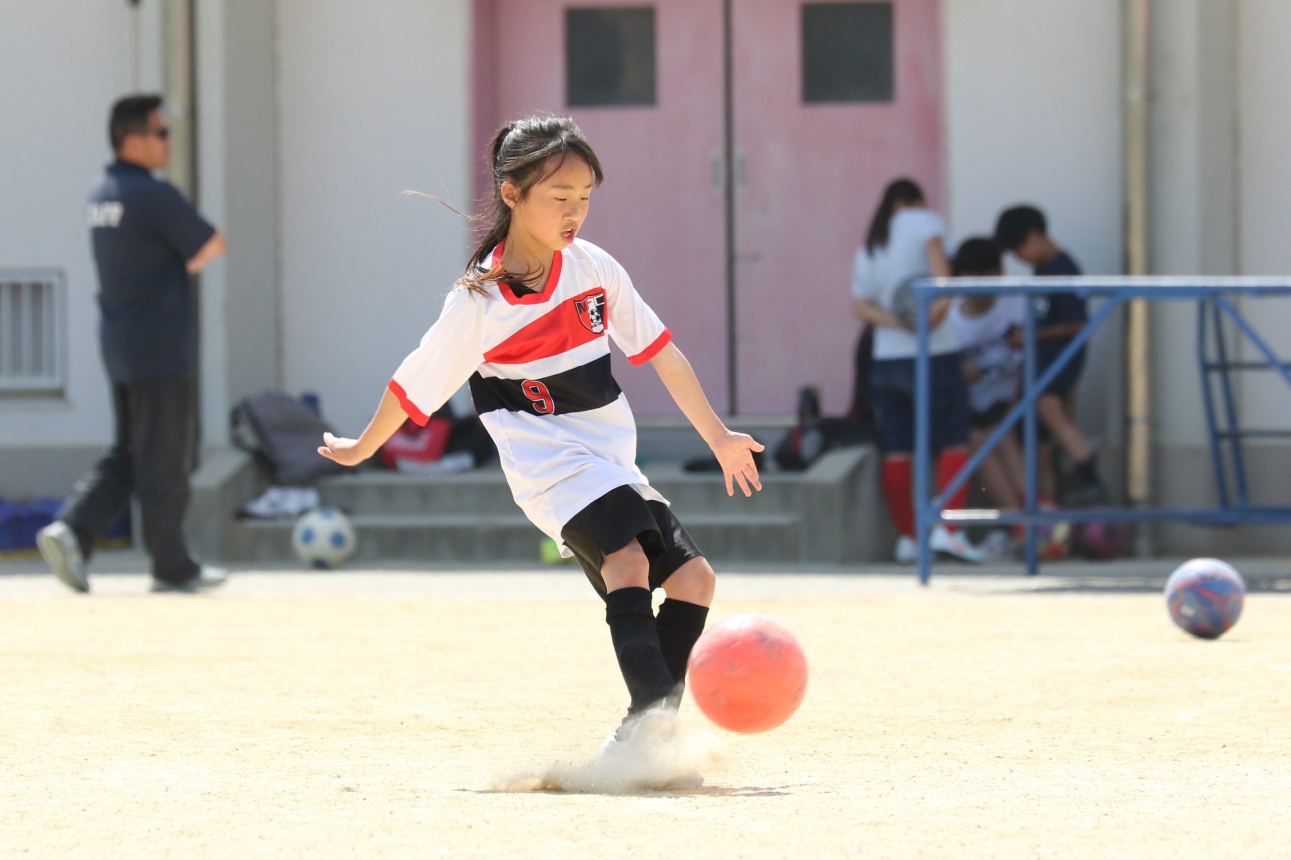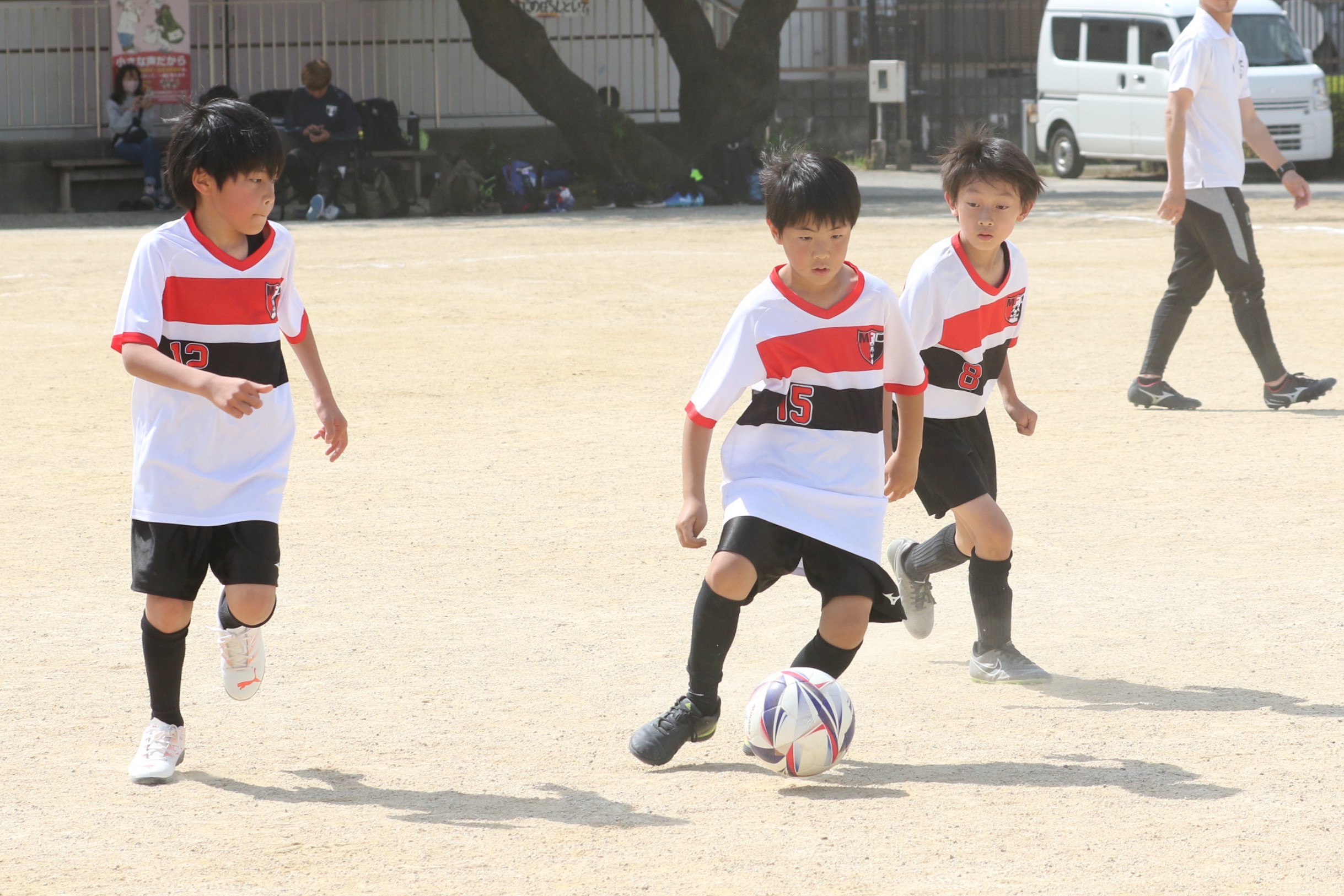 6年生を指揮するのは、奥江修司コーチで、20年以上チームに関わり指導している。「子供達一人一人がスキルアップでき、楽しく勝てるサッカーを目指して指導している。」と話す。練習はリフティングに始まり、浮き球のトラップ、ドリブル、対人練習と、基本的なメニューが多く、ミニゲームでは笑顔でボールを奪い合う中にも、時折激しさもあり、選手ひとりひとりが、楽しくまた真剣に取り組んでいる。