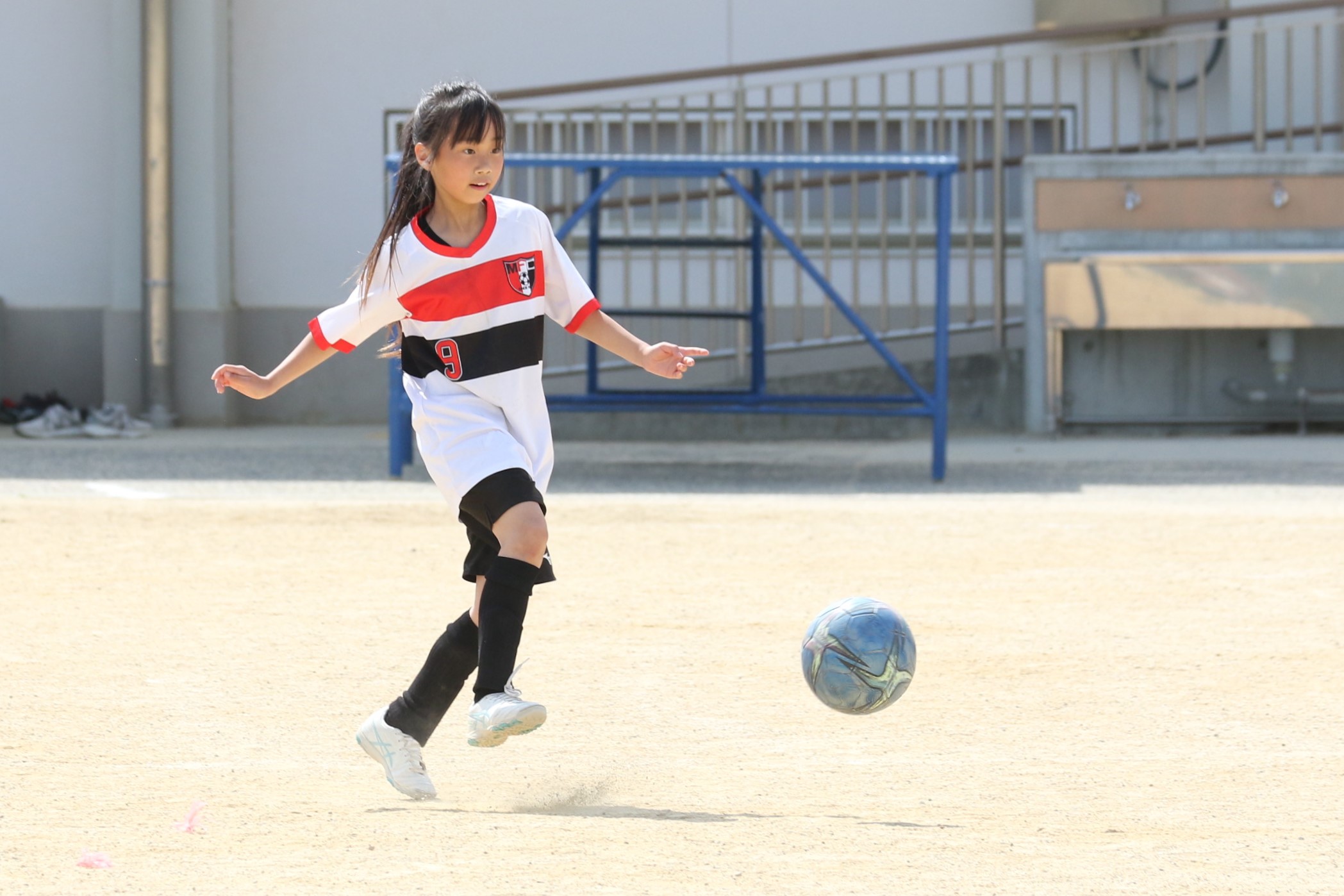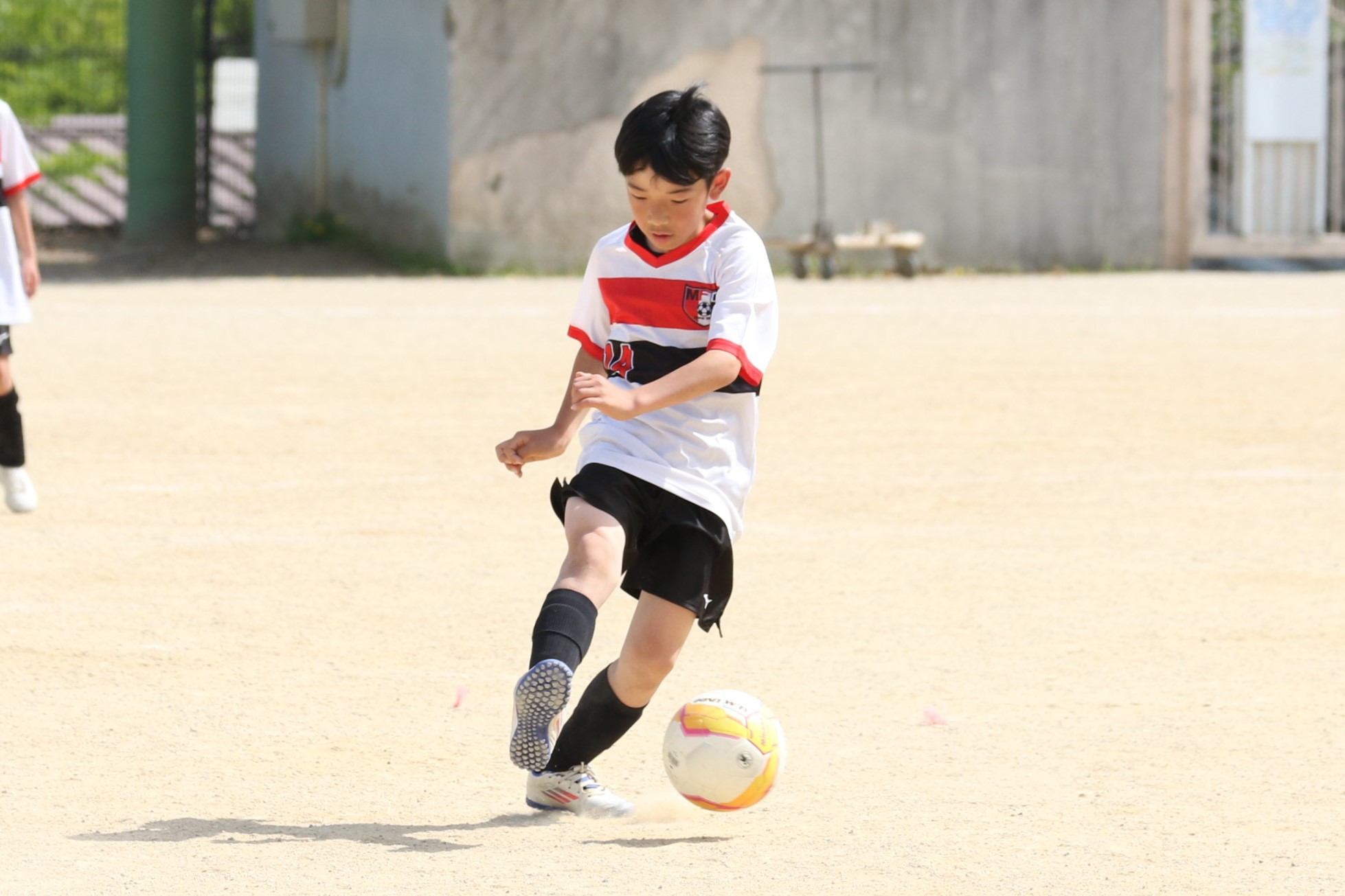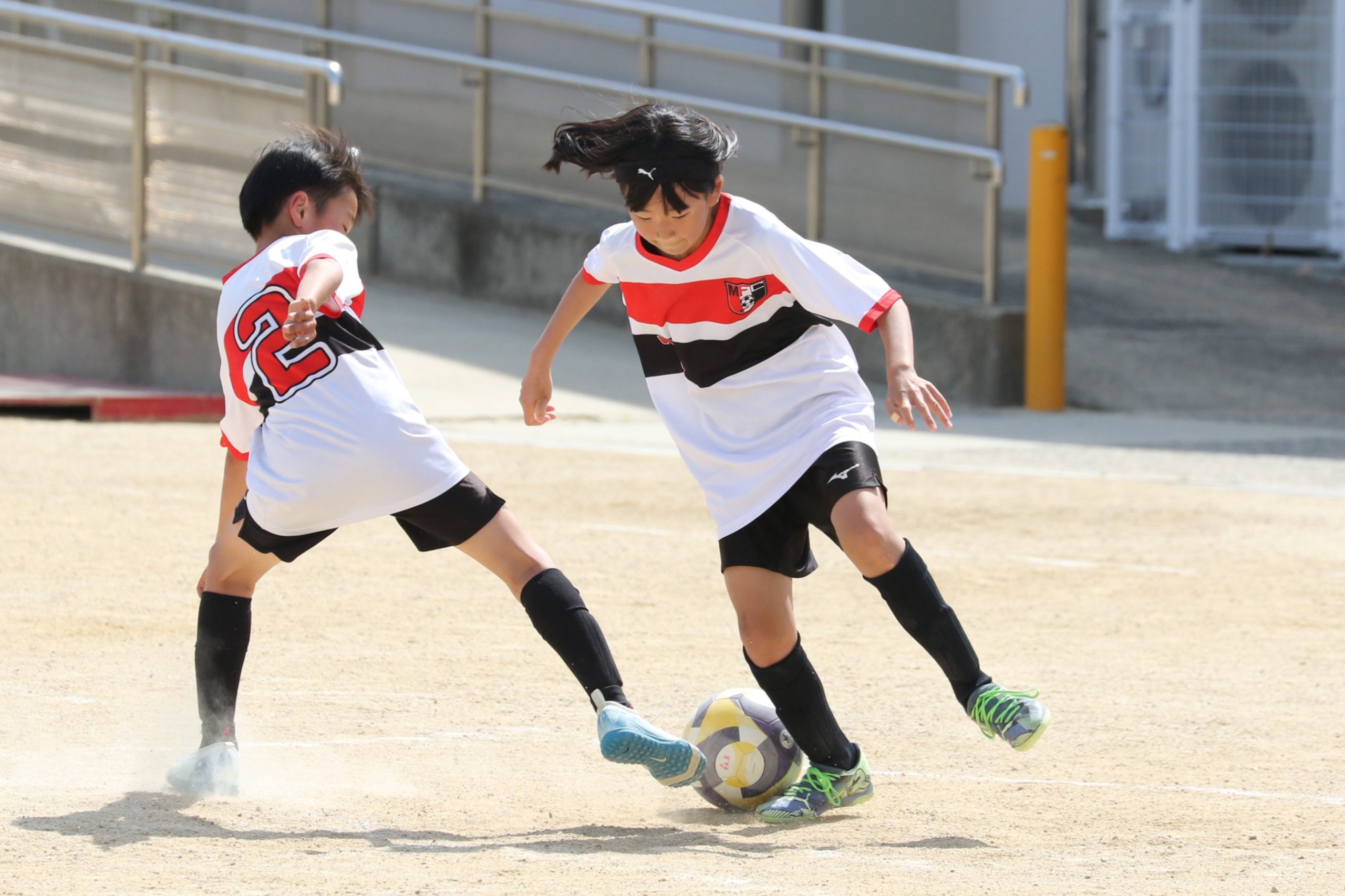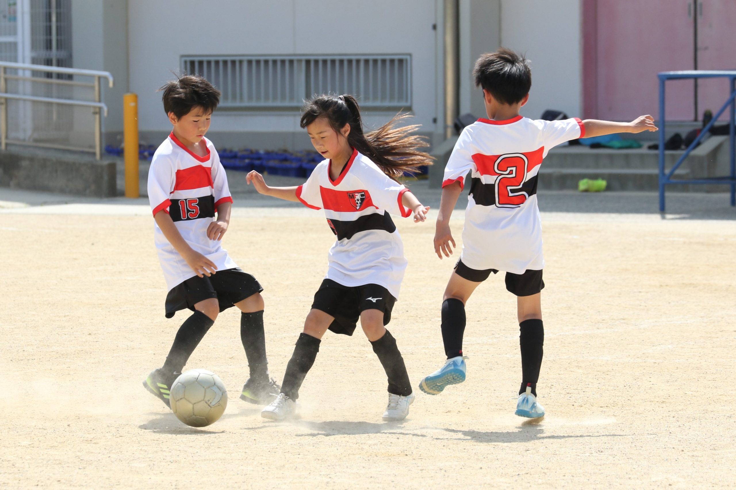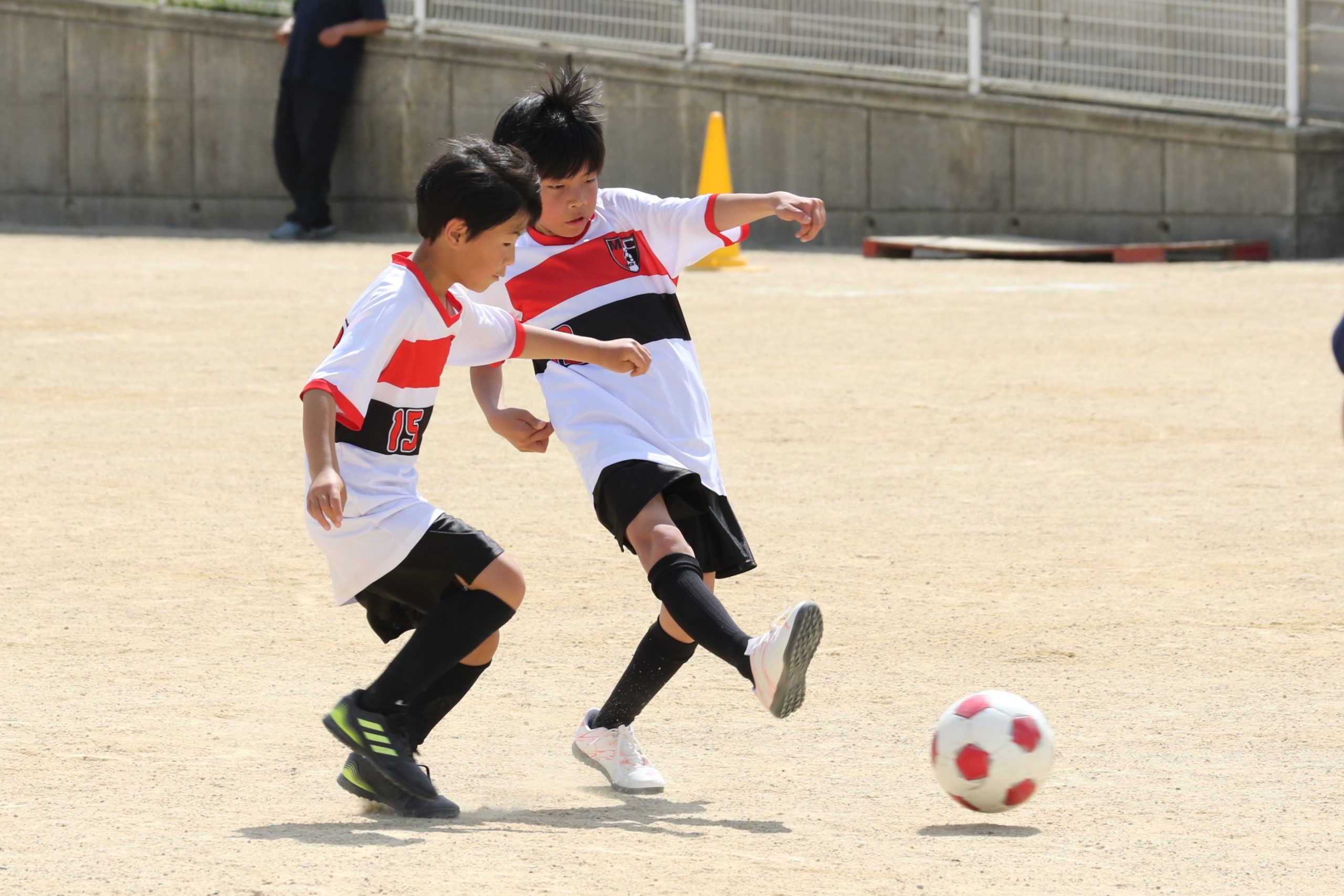 6年生を指揮するのは、奥江修司コーチで、20年以上チームに関わり指導している。「子供達一人一人がスキルアップでき、楽しく勝てるサッカーを目指して指導している。」と話す。練習はリフティングに始まり、浮き球のトラップ、ドリブル、対人練習と、基本的なメニューが多く、ミニゲームでは笑顔でボールを奪い合う中にも、時折激しさもあり、選手ひとりひとりが、楽しくまた真剣に取り組んでいる。