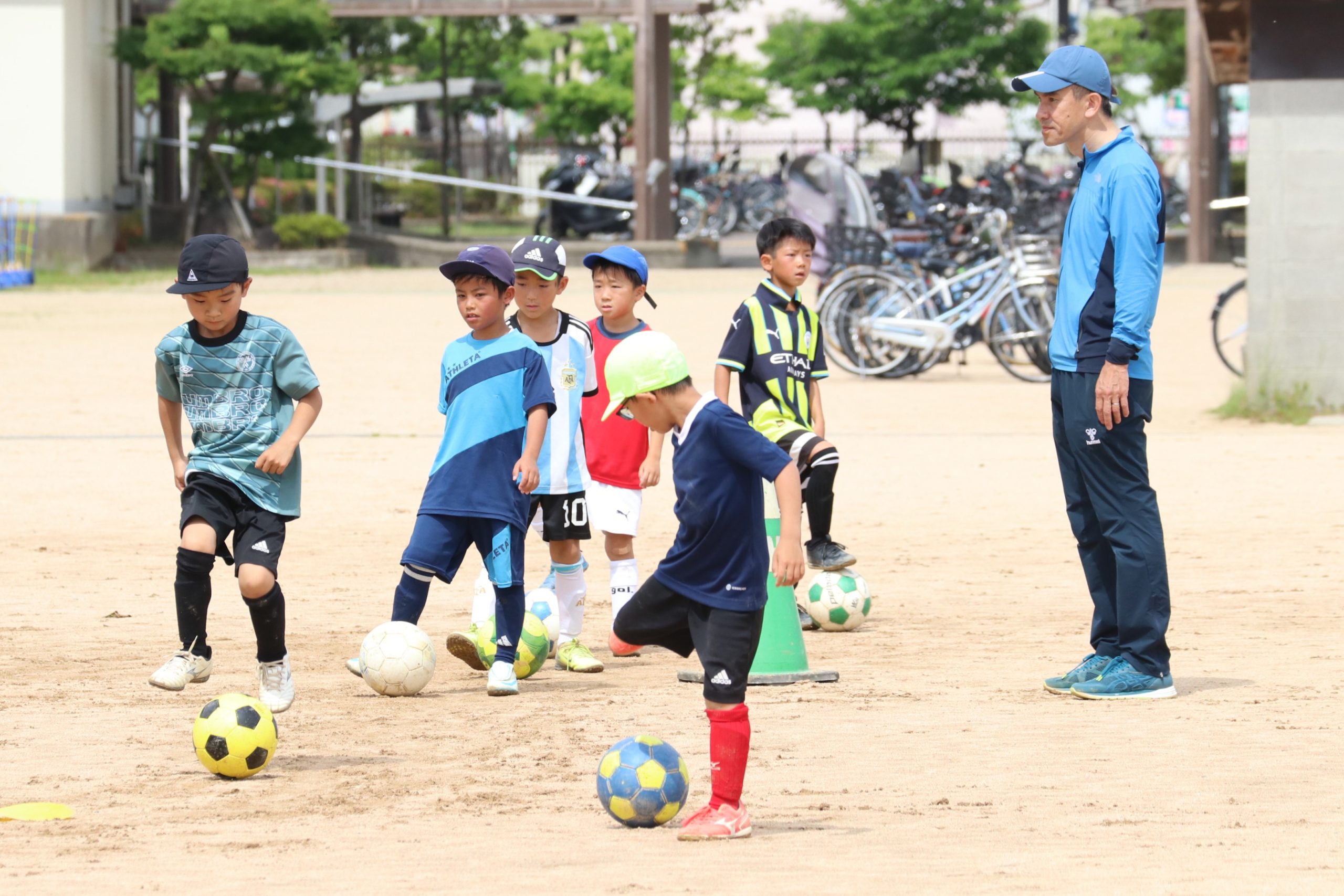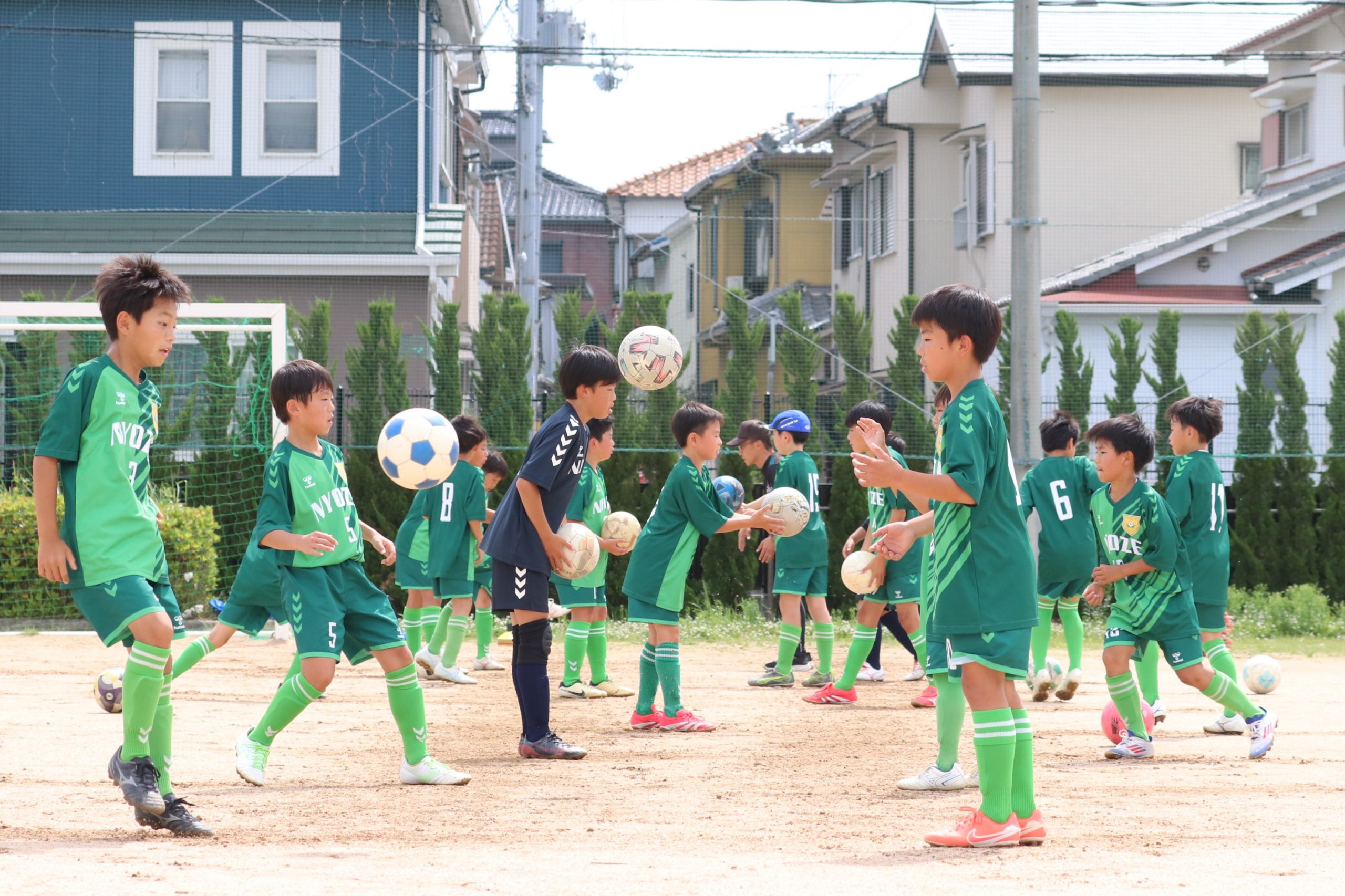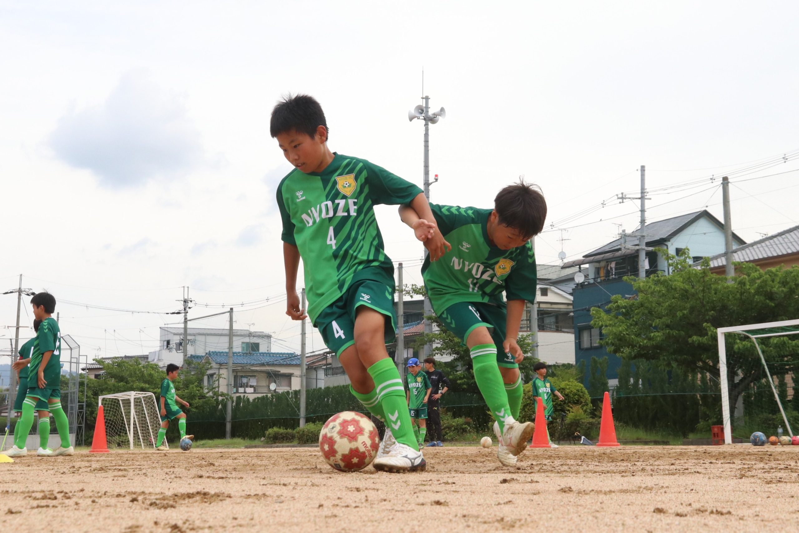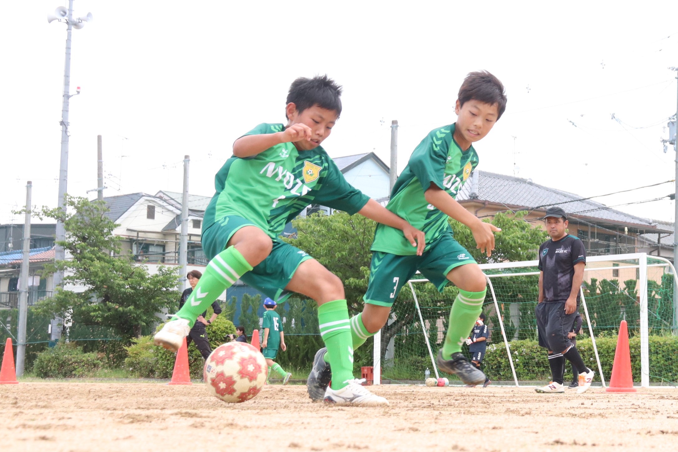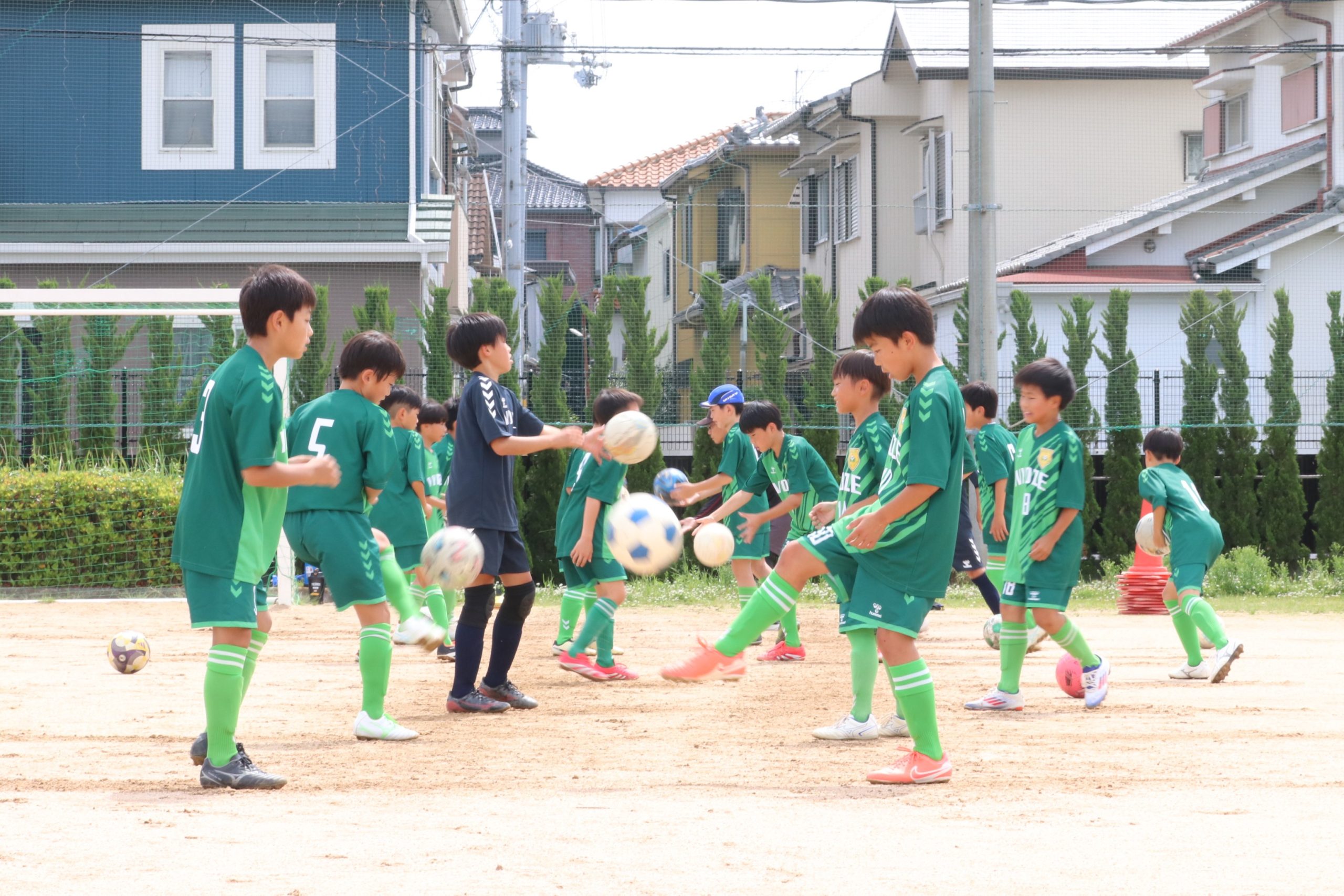 6年生をメインに担当するのは渕ノ側敏夫コーチで、基礎技術やメンタル面を熱心に指導、「基礎を大事に。中学生、高校生となっても役に立つ技術をつけてほしい」と話す。近所の今城塚古墳までの軽いランニングトレーニングなど気分転換を図るメニューなども取り入れている。また技術的、戦術的なサポートをするのは、チーム副代表も務める木田和之コーチで、自身の大学、社会人サッカーの経験を生かし、選手たちに指導を行っている。GK専門コーチもおり、所属選手は地区・地域トレセンにも選出されている。取材に訪れたこの日は、全員で声を揃えて元気にブラジル体操で身体を温め、2人1組での基礎練習、ショートパス、ロングキックでアップ。その後、1対1、2対2でのトレーニングでは、ドリブル突破時のスピードのかけ方や、ディフェンス時のポジショニングや身体の向きを細かく指導されていた。
