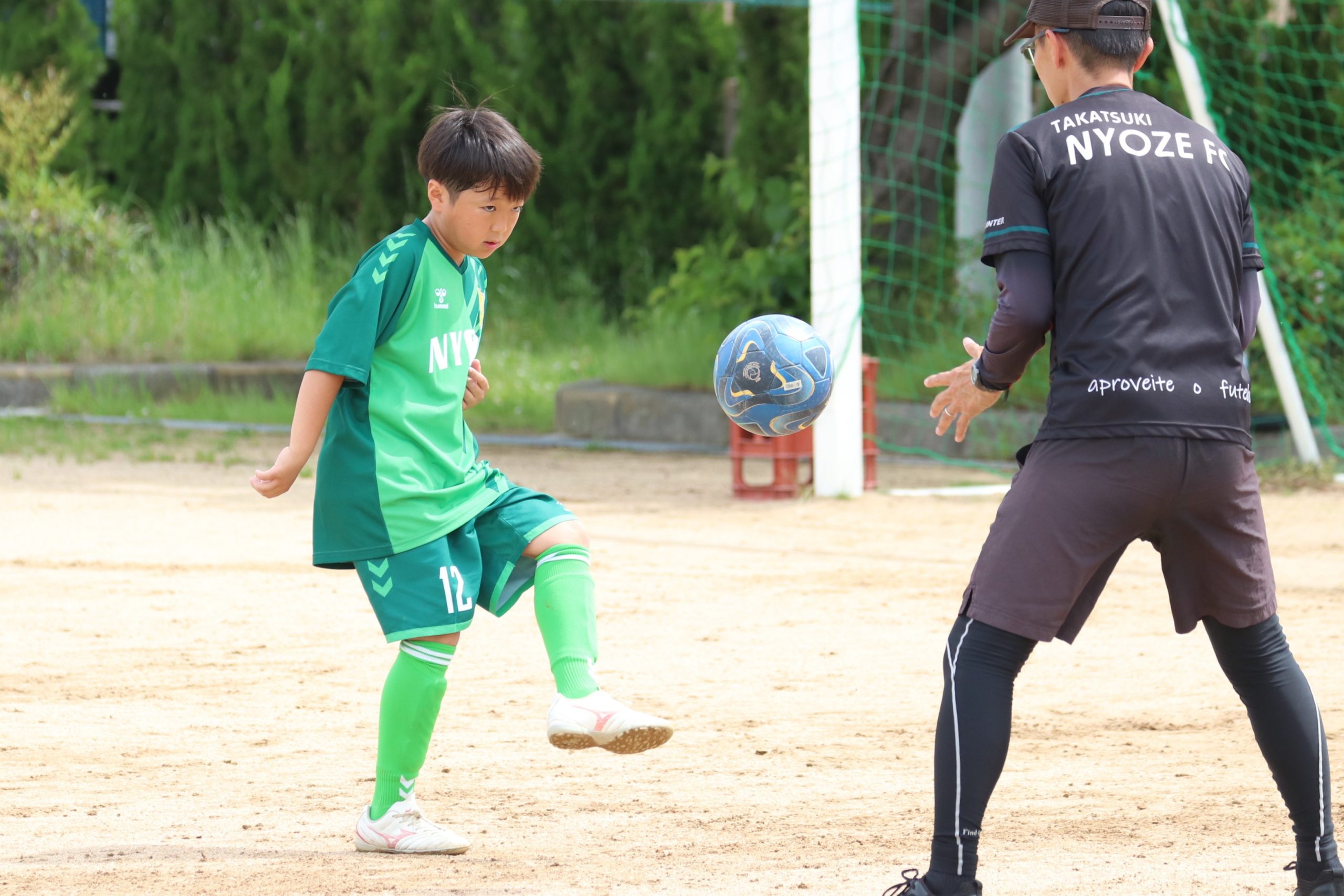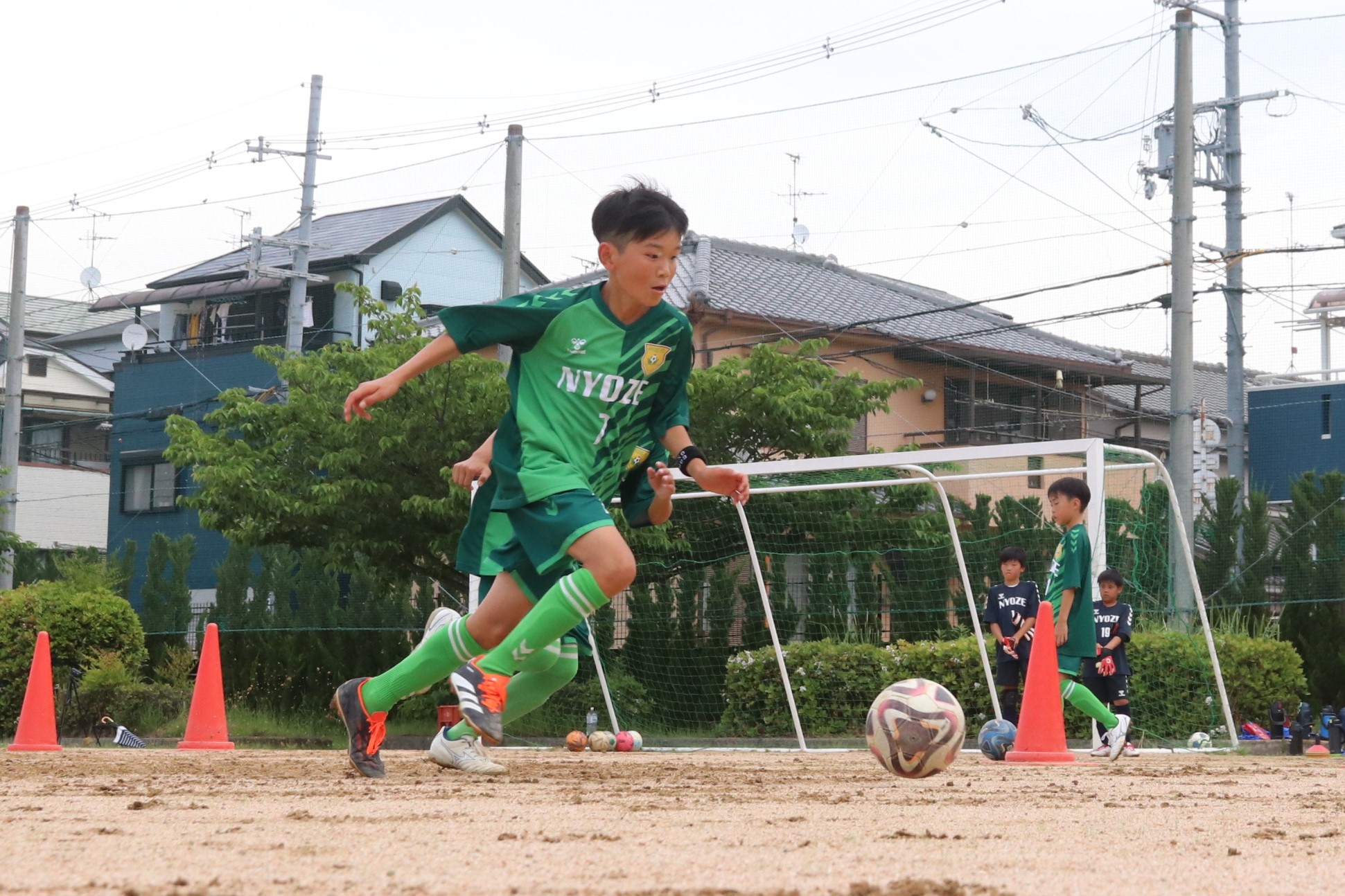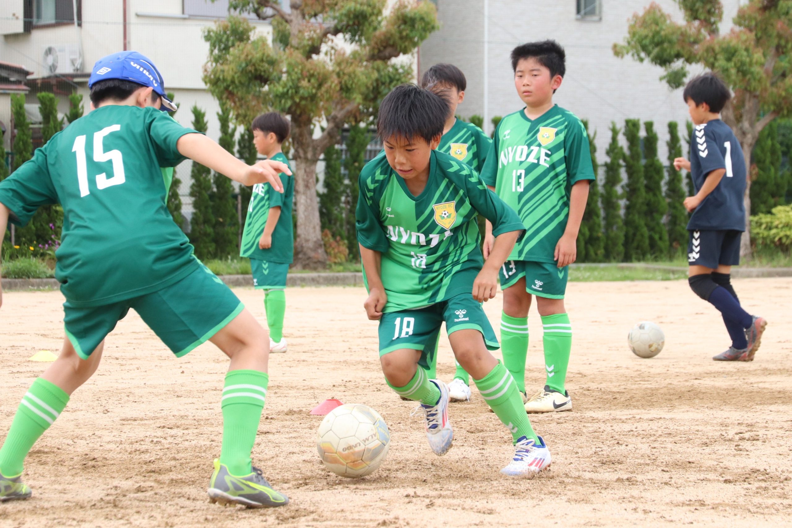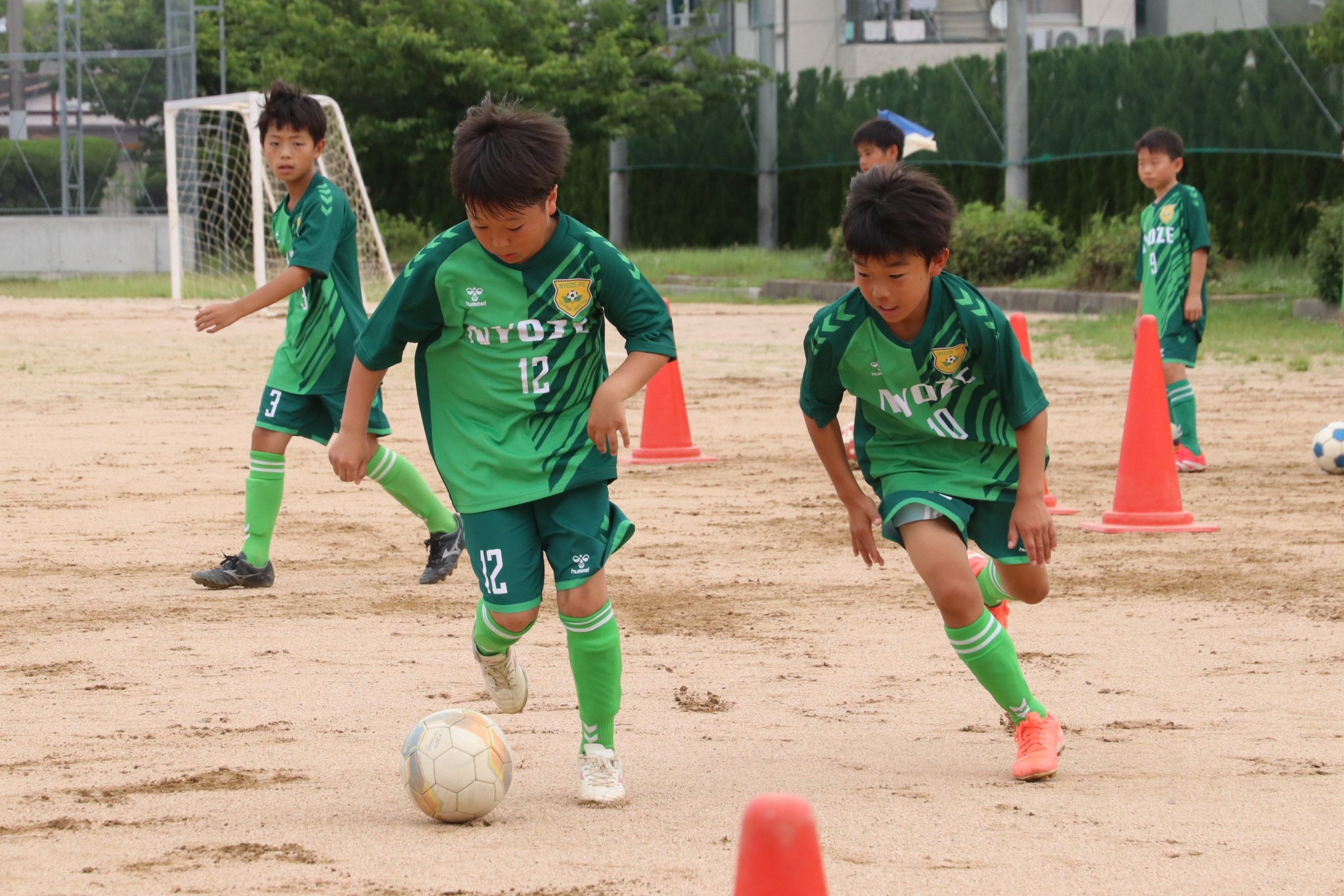 6年生をメインに担当するのは渕ノ側敏夫コーチで、基礎技術やメンタル面を熱心に指導、「基礎を大事に。中学生、高校生となっても役に立つ技術をつけてほしい」と話す。近所の今城塚古墳までの軽いランニングトレーニングなど気分転換を図るメニューなども取り入れている。また技術的、戦術的なサポートをするのは、チーム副代表も務める木田和之コーチで、自身の大学、社会人サッカーの経験を生かし、選手たちに指導を行っている。GK専門コーチもおり、所属選手は地区・地域トレセンにも選出されている。取材に訪れたこの日は、全員で声を揃えて元気にブラジル体操で身体を温め、2人1組での基礎練習、ショートパス、ロングキックでアップ。その後、1対1、2対2でのトレーニングでは、ドリブル突破時のスピードのかけ方や、ディフェンス時のポジショニングや身体の向きを細かく指導されていた。