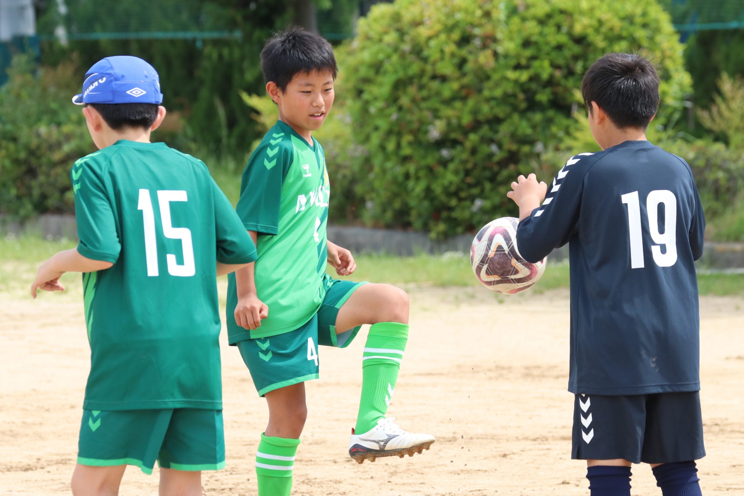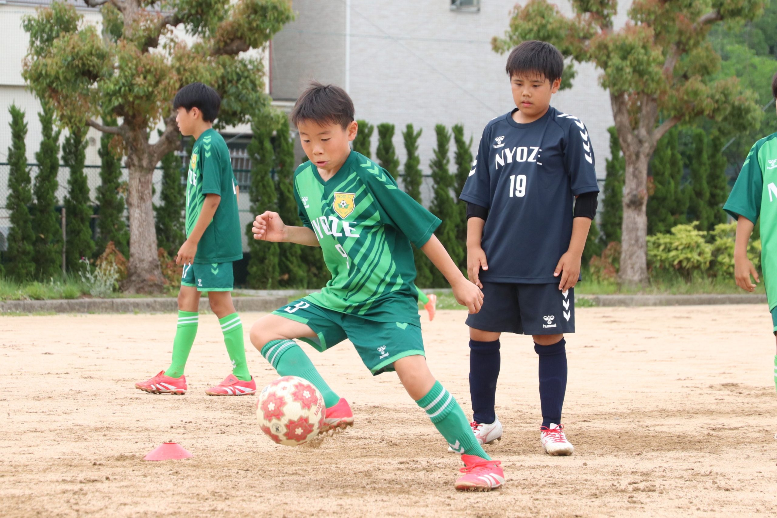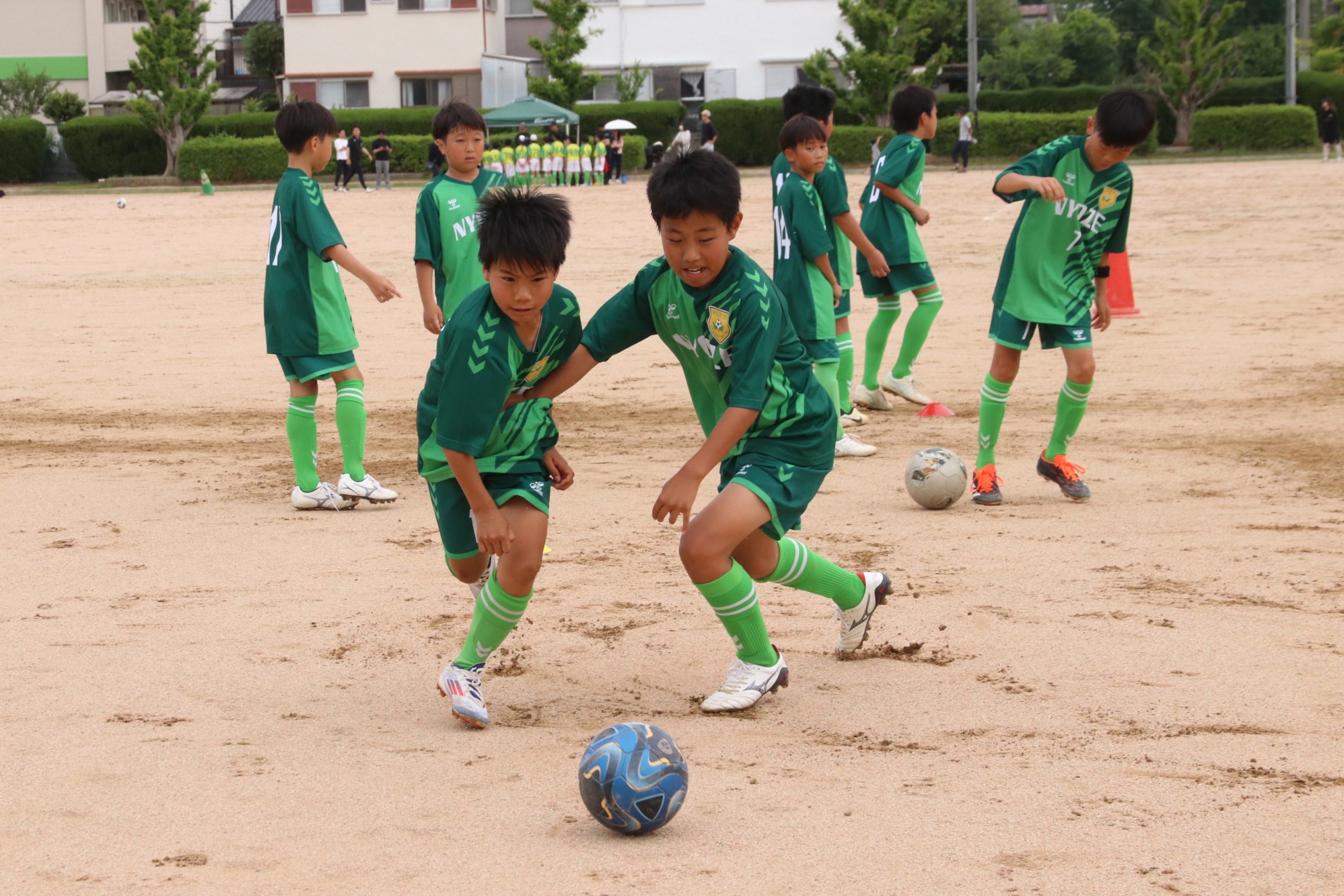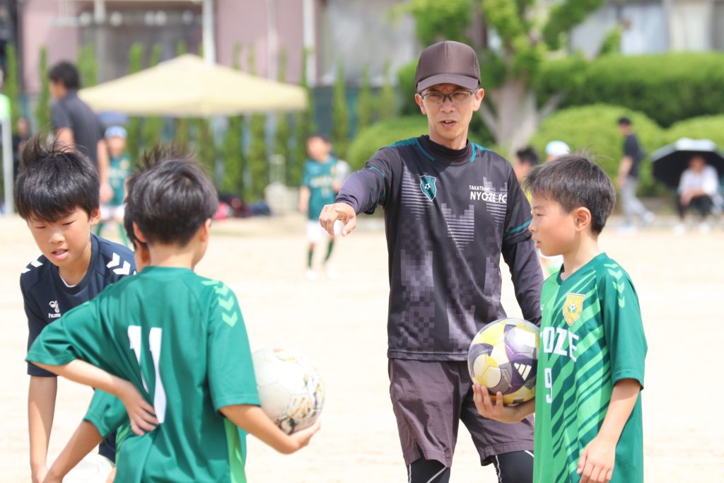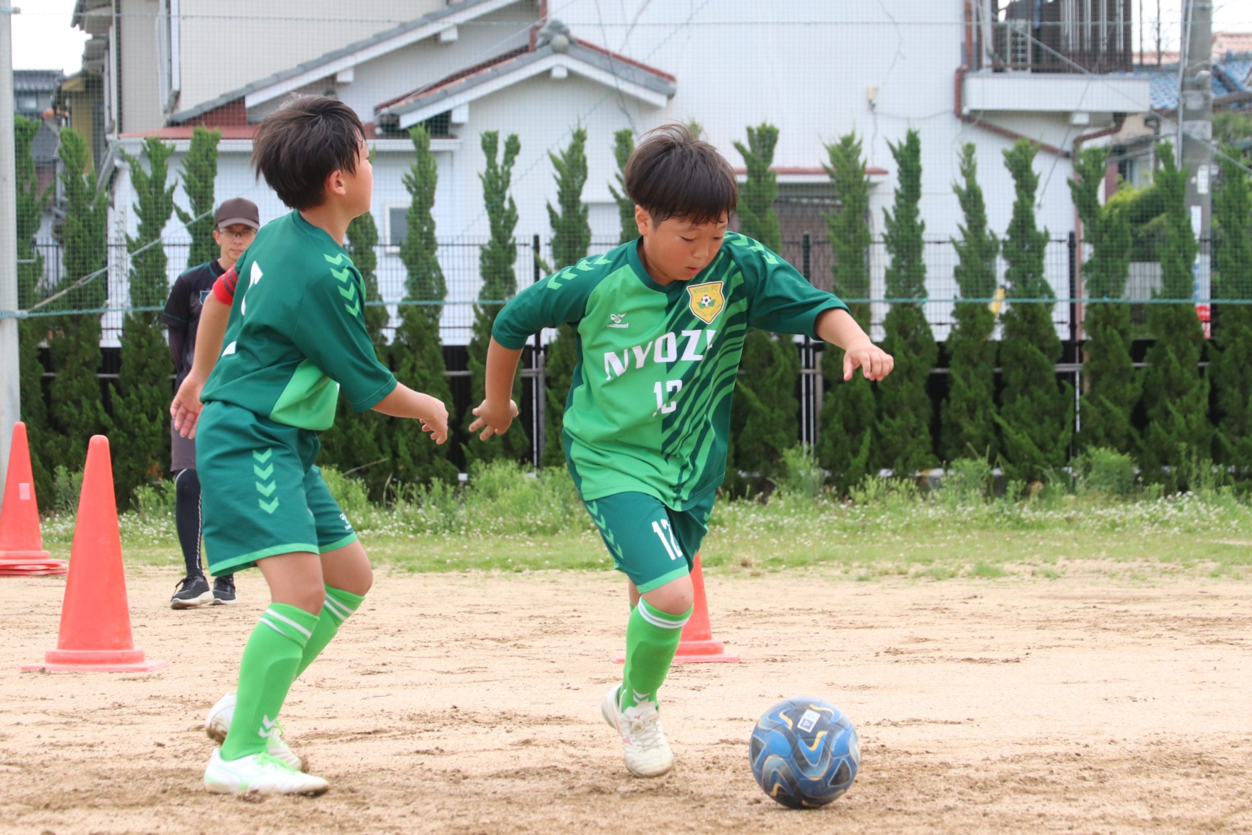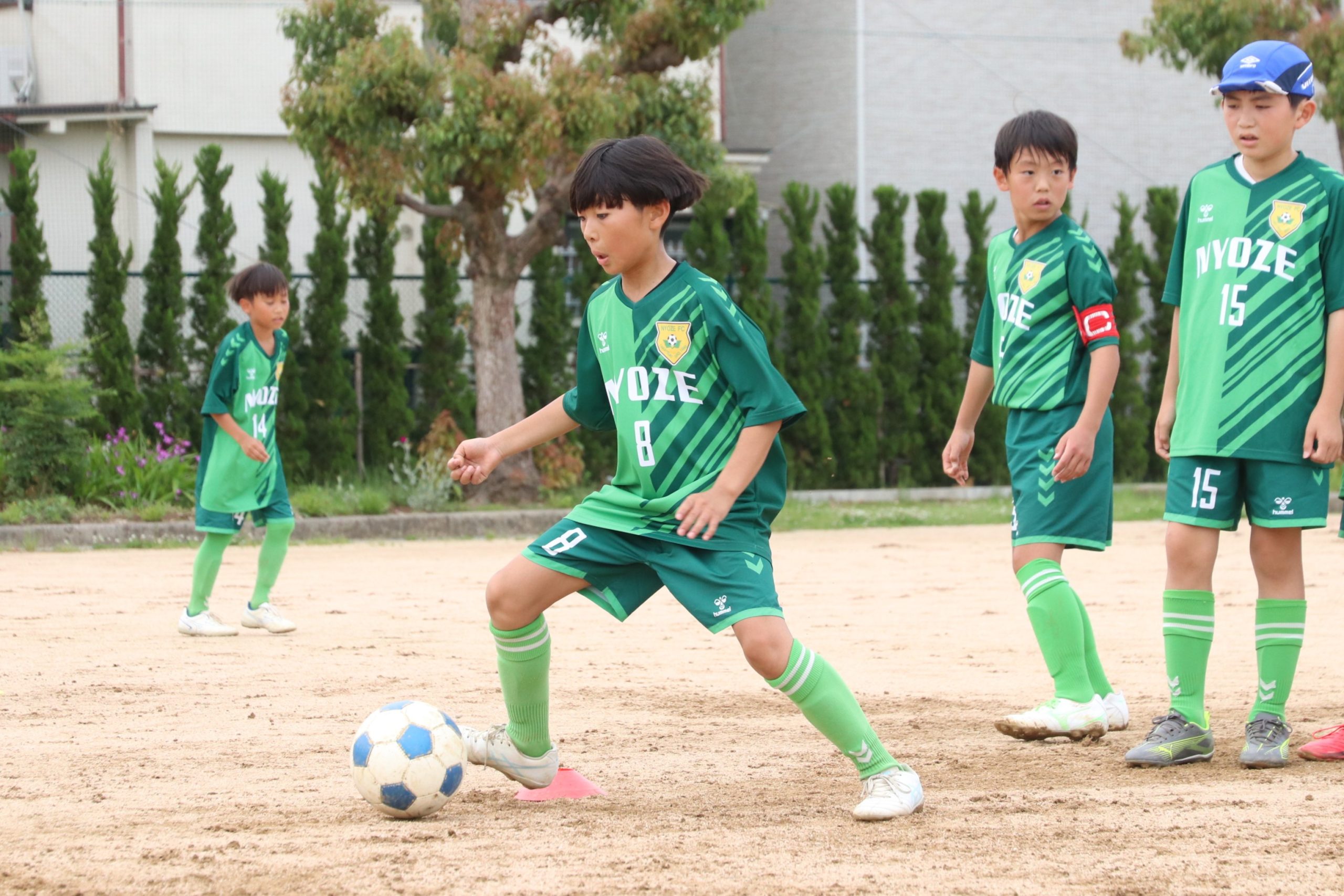 6年生をメインに担当するのは渕ノ側敏夫コーチで、基礎技術やメンタル面を熱心に指導、「基礎を大事に。中学生、高校生となっても役に立つ技術をつけてほしい」と話す。近所の今城塚古墳までの軽いランニングトレーニングなど気分転換を図るメニューなども取り入れている。また技術的、戦術的なサポートをするのは、チーム副代表も務める木田和之コーチで、自身の大学、社会人サッカーの経験を生かし、選手たちに指導を行っている。GK専門コーチもおり、所属選手は地区・地域トレセンにも選出されている。取材に訪れたこの日は、全員で声を揃えて元気にブラジル体操で身体を温め、2人1組での基礎練習、ショートパス、ロングキックでアップ。その後、1対1、2対2でのトレーニングでは、ドリブル突破時のスピードのかけ方や、ディフェンス時のポジショニングや身体の向きを細かく指導されていた。