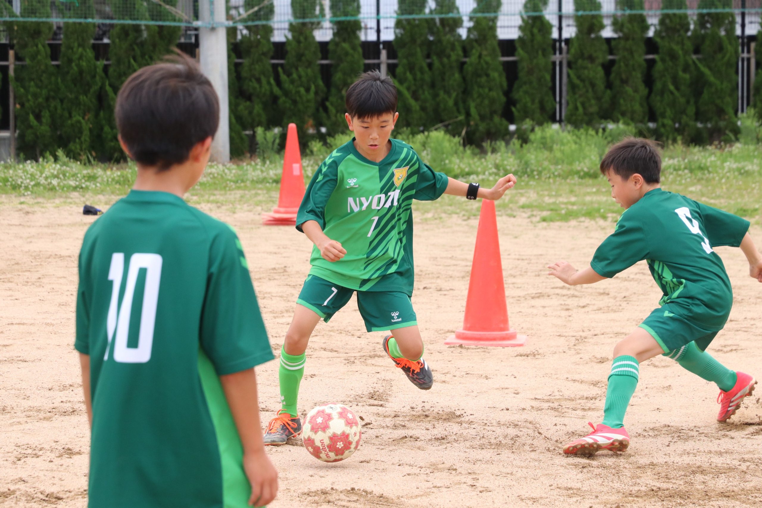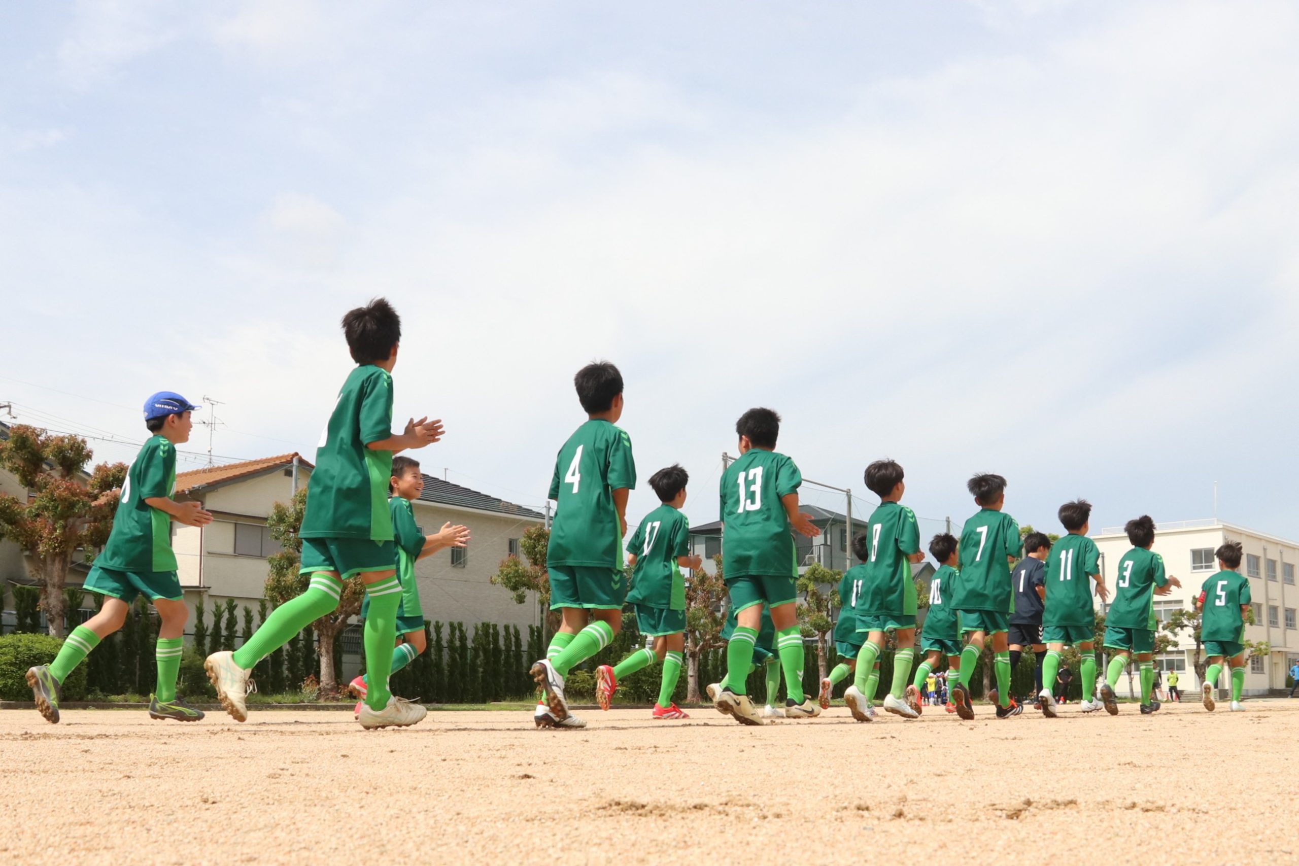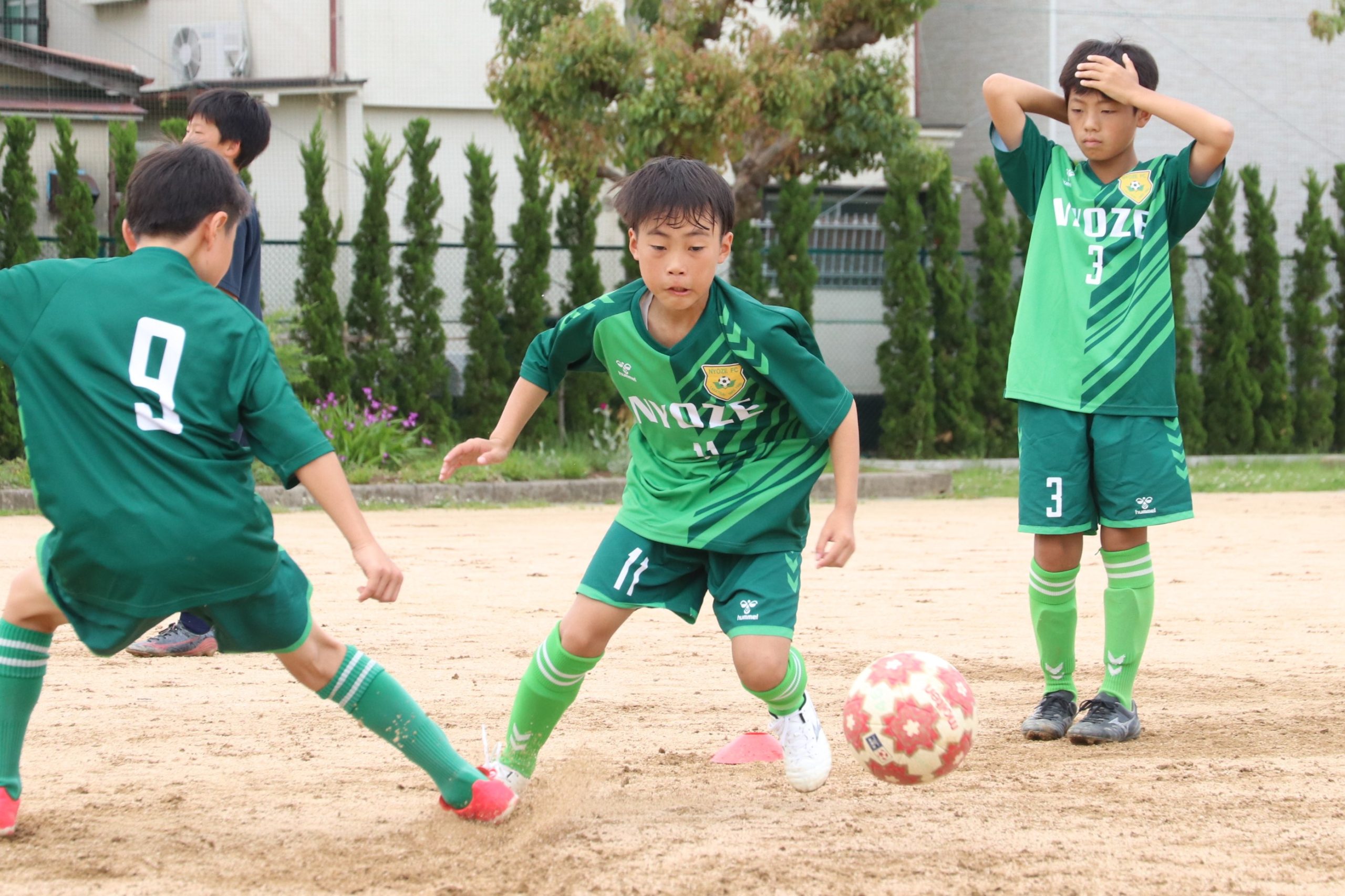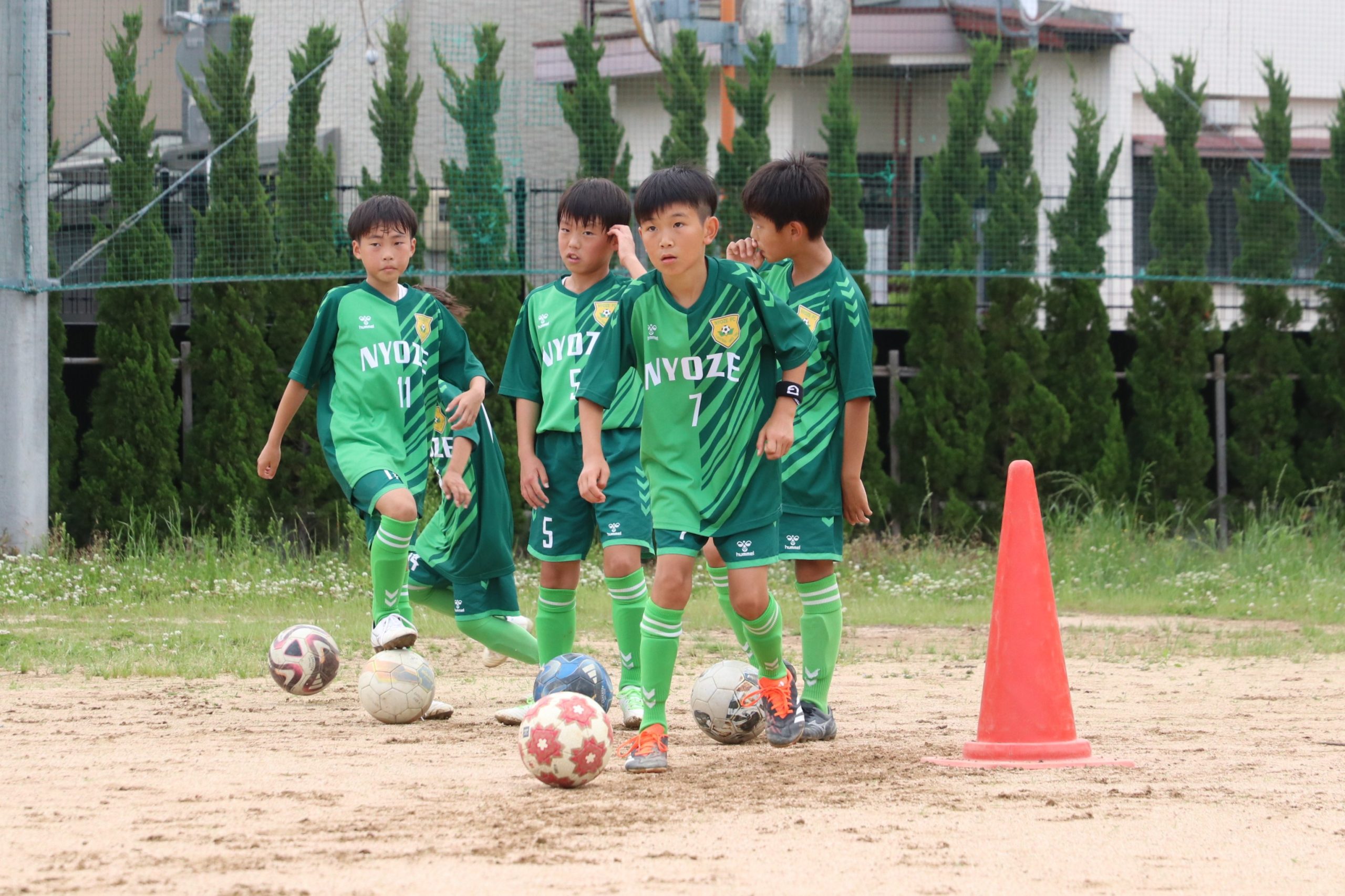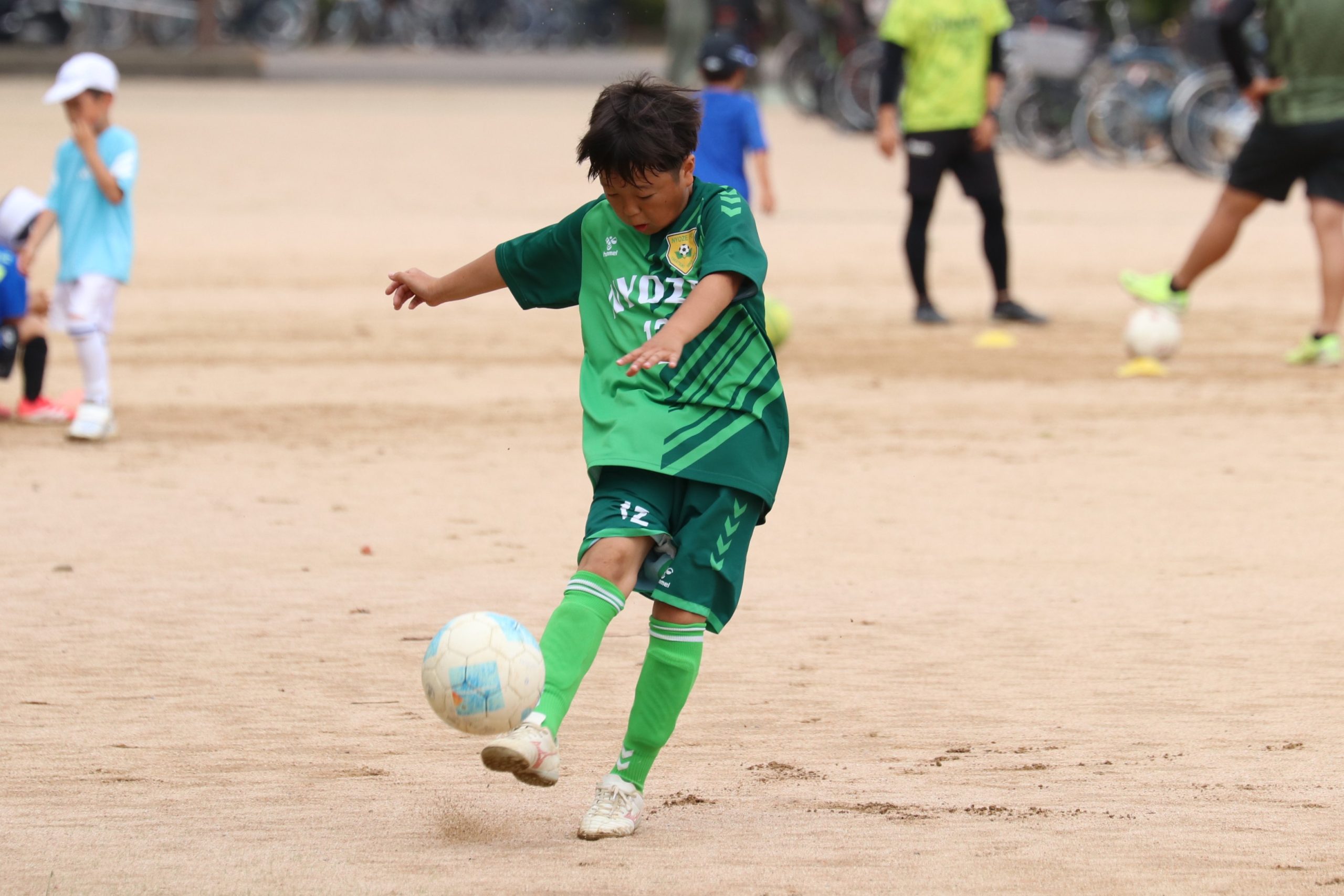 6年生をメインに担当するのは渕ノ側敏夫コーチで、基礎技術やメンタル面を熱心に指導、「基礎を大事に。中学生、高校生となっても役に立つ技術をつけてほしい」と話す。近所の今城塚古墳までの軽いランニングトレーニングなど気分転換を図るメニューなども取り入れている。また技術的、戦術的なサポートをするのは、チーム副代表も務める木田和之コーチで、自身の大学、社会人サッカーの経験を生かし、選手たちに指導を行っている。GK専門コーチもおり、所属選手は地区・地域トレセンにも選出されている。取材に訪れたこの日は、全員で声を揃えて元気にブラジル体操で身体を温め、2人1組での基礎練習、ショートパス、ロングキックでアップ。その後、1対1、2対2でのトレーニングでは、ドリブル突破時のスピードのかけ方や、ディフェンス時のポジショニングや身体の向きを細かく指導されていた。