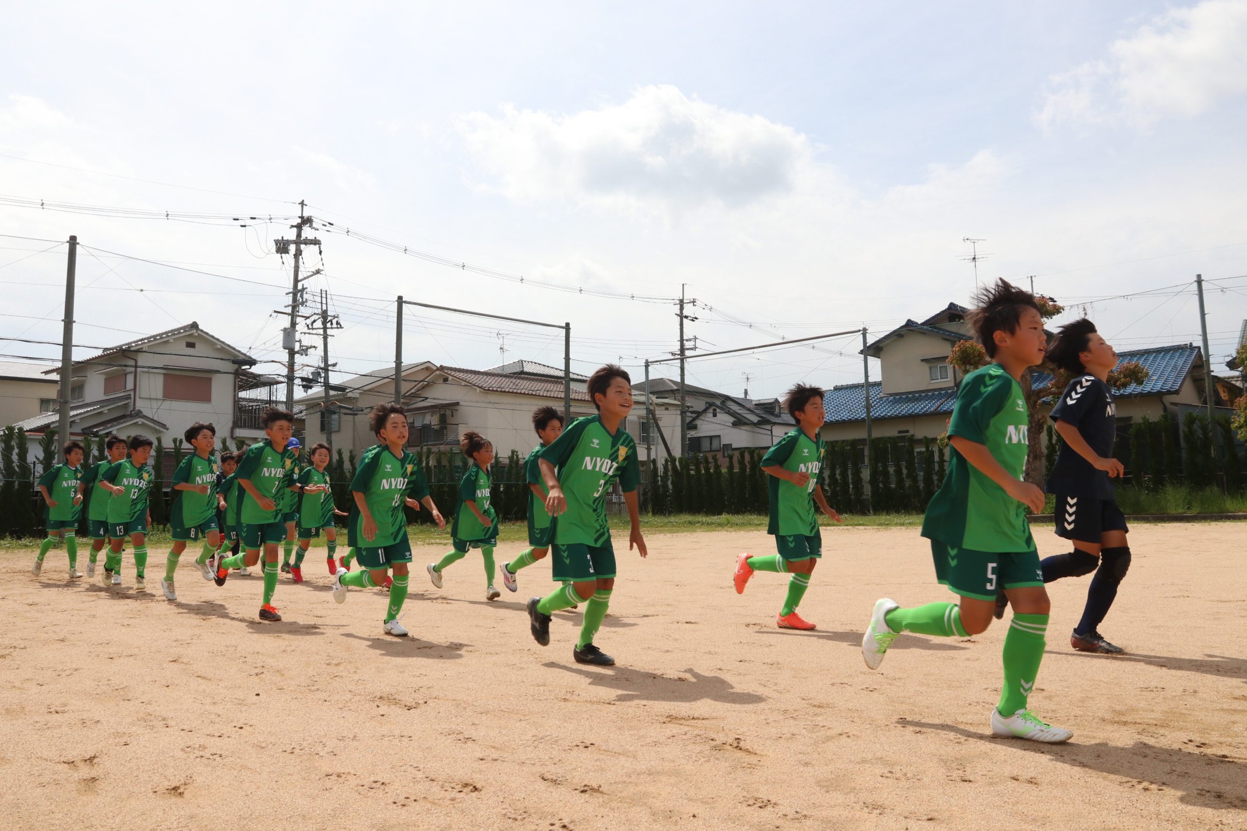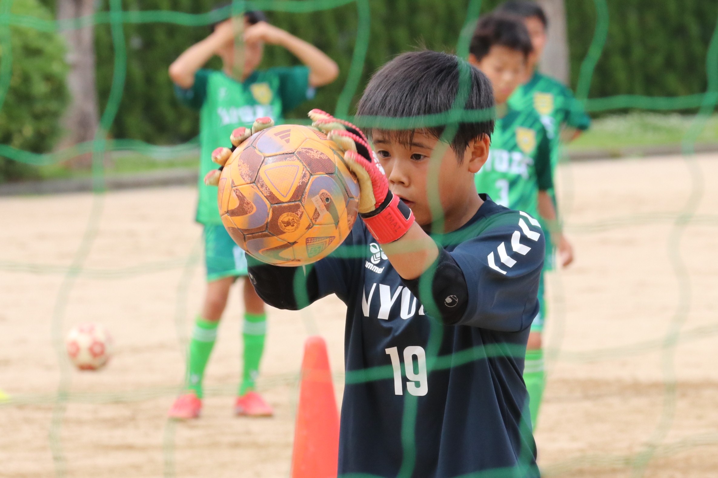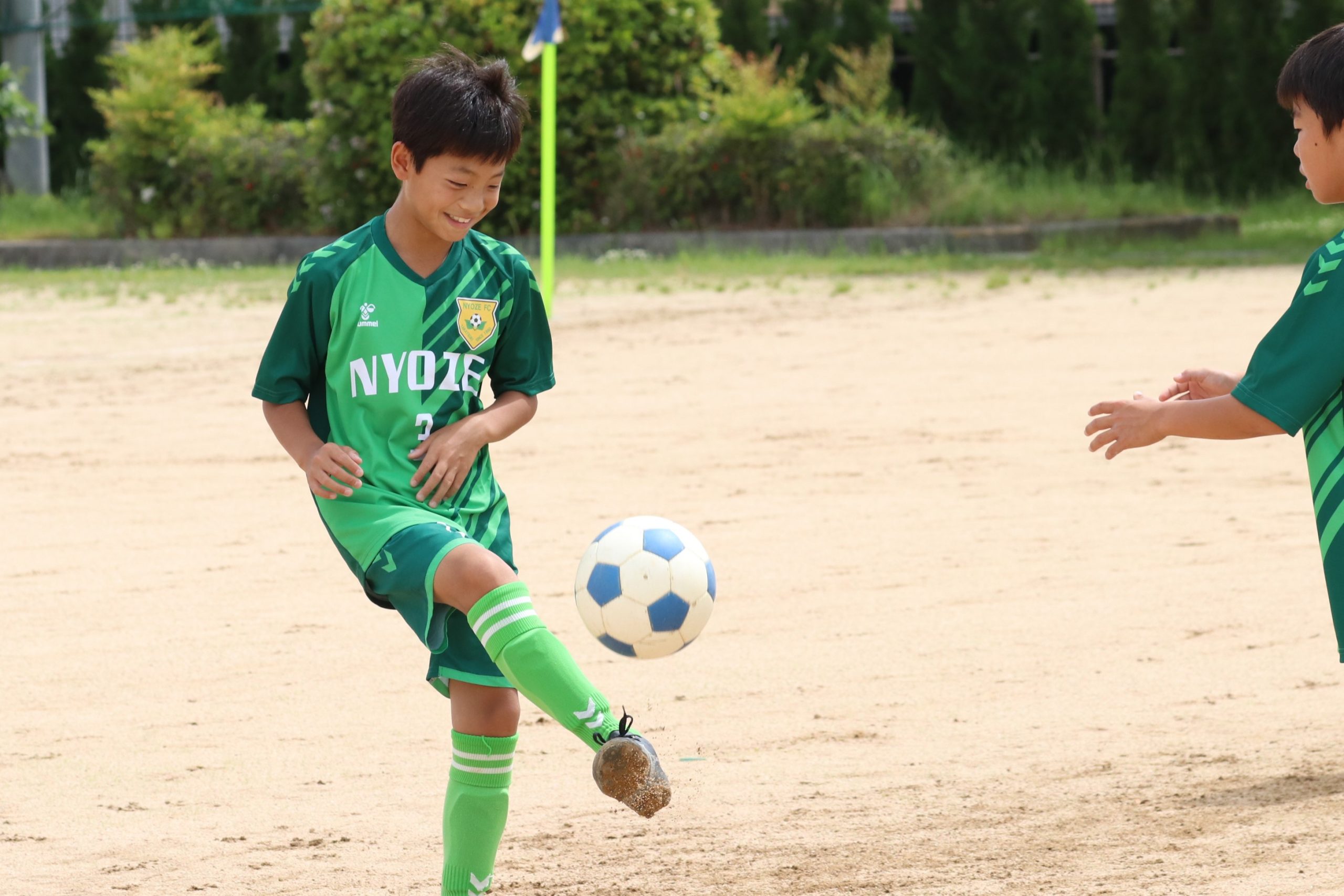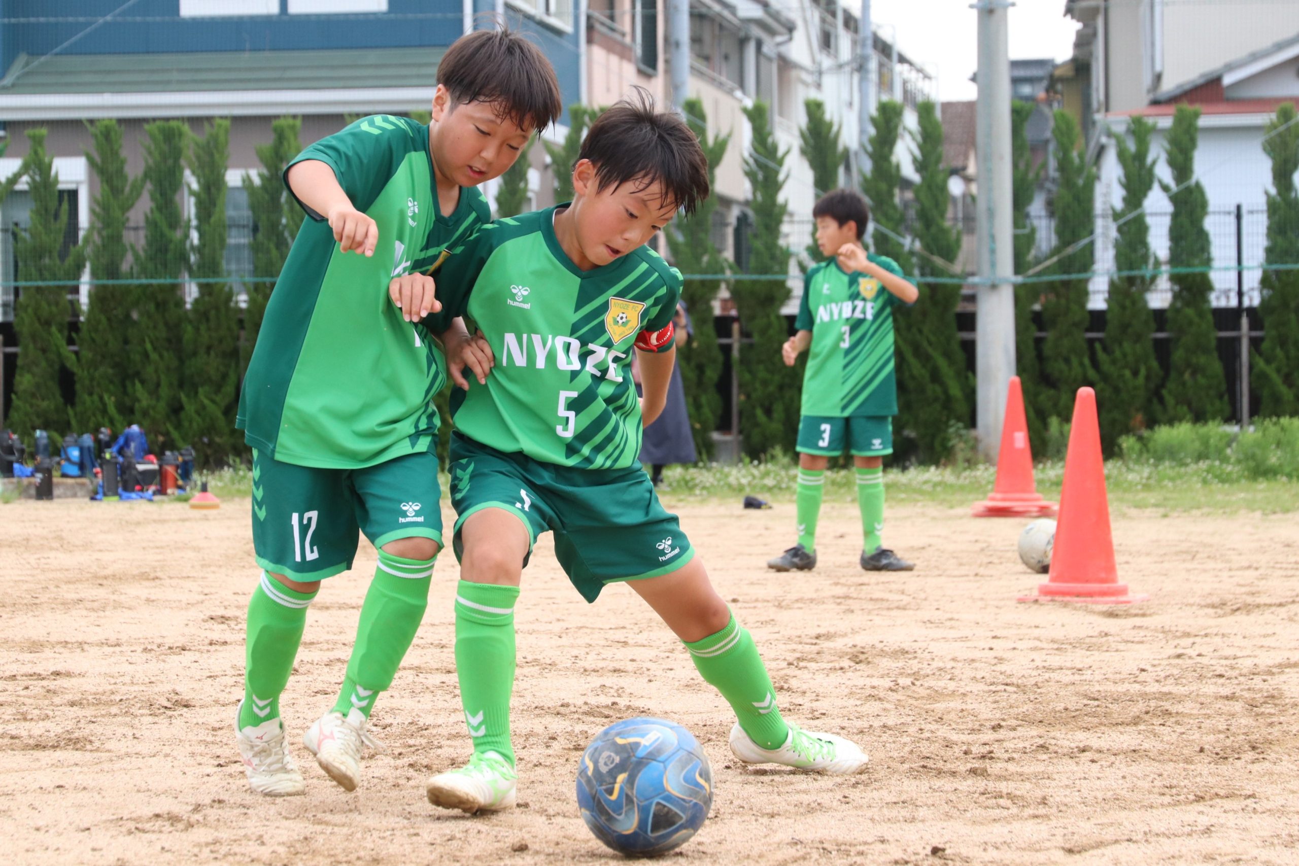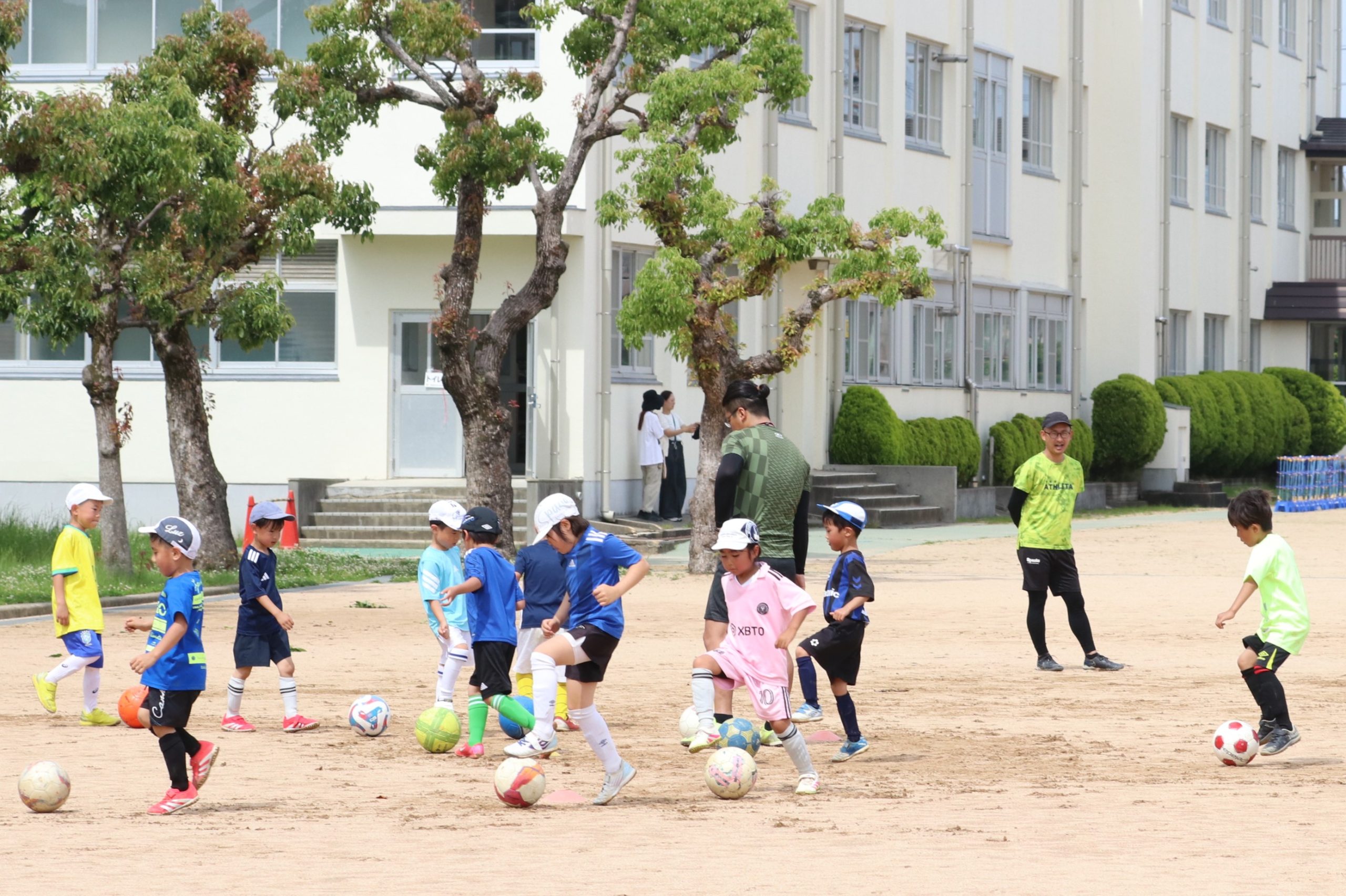 6年生をメインに担当するのは渕ノ側敏夫コーチで、基礎技術やメンタル面を熱心に指導、「基礎を大事に。中学生、高校生となっても役に立つ技術をつけてほしい」と話す。近所の今城塚古墳までの軽いランニングトレーニングなど気分転換を図るメニューなども取り入れている。また技術的、戦術的なサポートをするのは、チーム副代表も務める木田和之コーチで、自身の大学、社会人サッカーの経験を生かし、選手たちに指導を行っている。GK専門コーチもおり、所属選手は地区・地域トレセンにも選出されている。取材に訪れたこの日は、全員で声を揃えて元気にブラジル体操で身体を温め、2人1組での基礎練習、ショートパス、ロングキックでアップ。その後、1対1、2対2でのトレーニングでは、ドリブル突破時のスピードのかけ方や、ディフェンス時のポジショニングや身体の向きを細かく指導されていた。