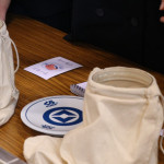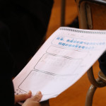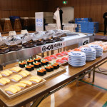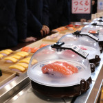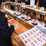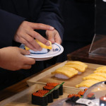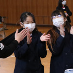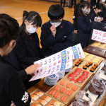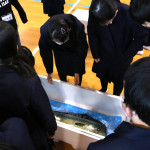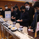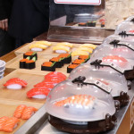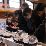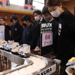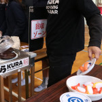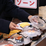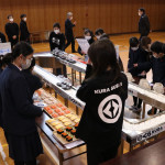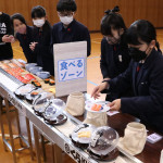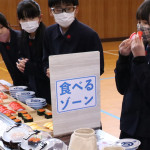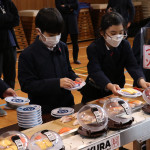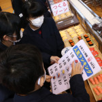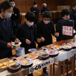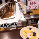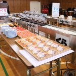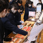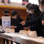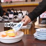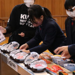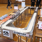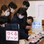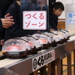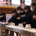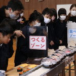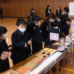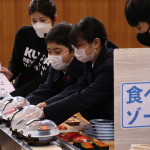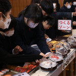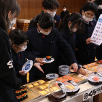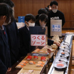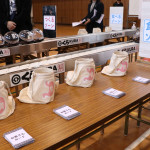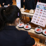 続いて、持ち込まれた実際の回転レーンを使用した授業では、店内業務をサンプル模型のお寿司を使いゲーム形式で擬似体験。お寿司を一斉に作って、レーンに流して、いっぱい食べて(食べたフリをして)、大満足。しかし、「食べられなかったお寿司はどうなるのか?」といった店内で起こる食品ロスの問題を実感することとなった。