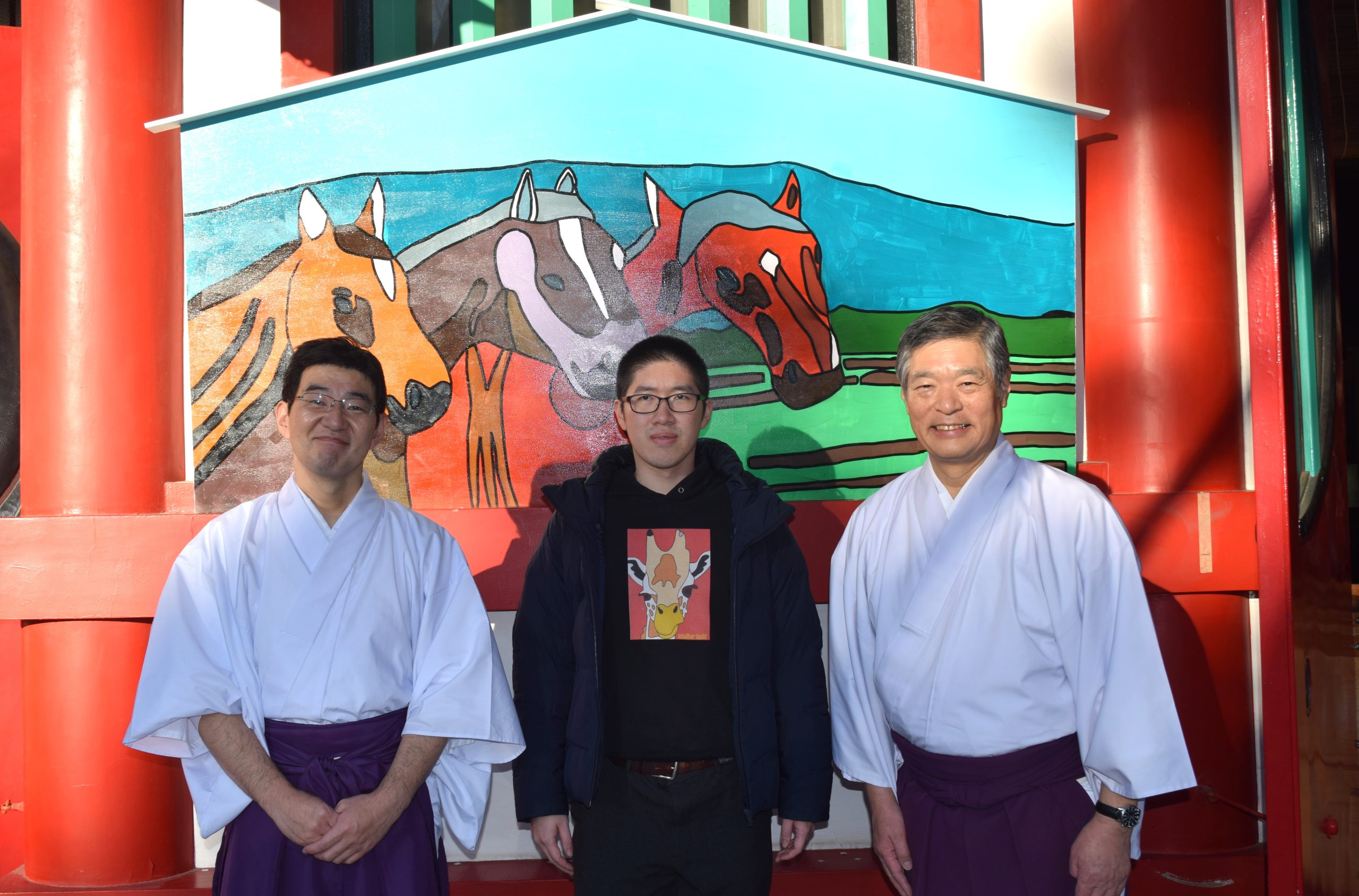 「アートパラ干支大絵馬」の奉納後に富岡八幡宮の丸山聡一宮司(写真右)らと記念撮影を行った木下晃希さん