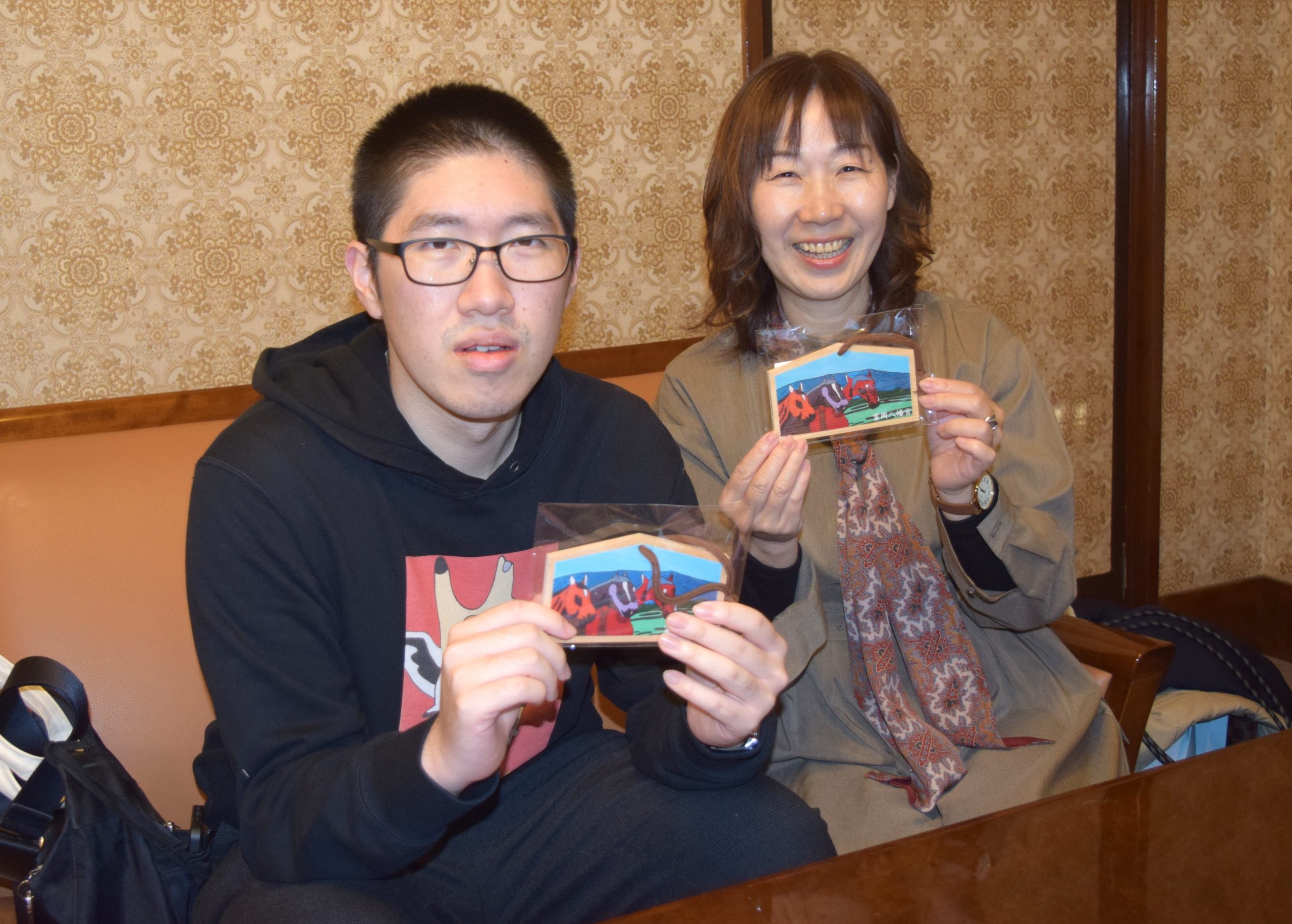 富岡八幡宮・授与所で発売される「アートパラ絵馬」を手にする木下晃希さんと母・真理子さん